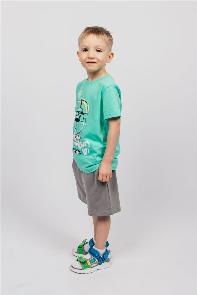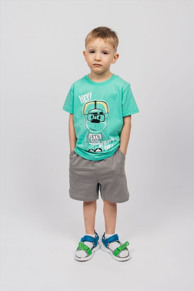 Страна производства: Россия Комплект для мальчика, состоящий из футболки и шорт выполнен из 100% хлопка. Футболка для мальчика прямого силуэта, с втачным коротким рукавом. Благодаря эластичной горловине, выполненной из рибаны, футболку удобно снимать и надевать. На полочке принт Шелкография. Надпись переводится как Хэй!; Что случилось?. по поясу шорт вставлен плоский утягивающий шнурок в цвет шорт, низ шнурка подвернут и застрочен. Длина шнурка = длина пояса + 45 см для возможности завязывания. На передней половинке шорт карманы с отрезным бочком, вход в карман обработан строчкой.