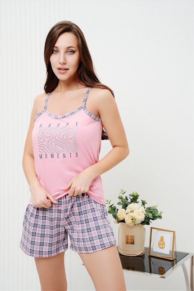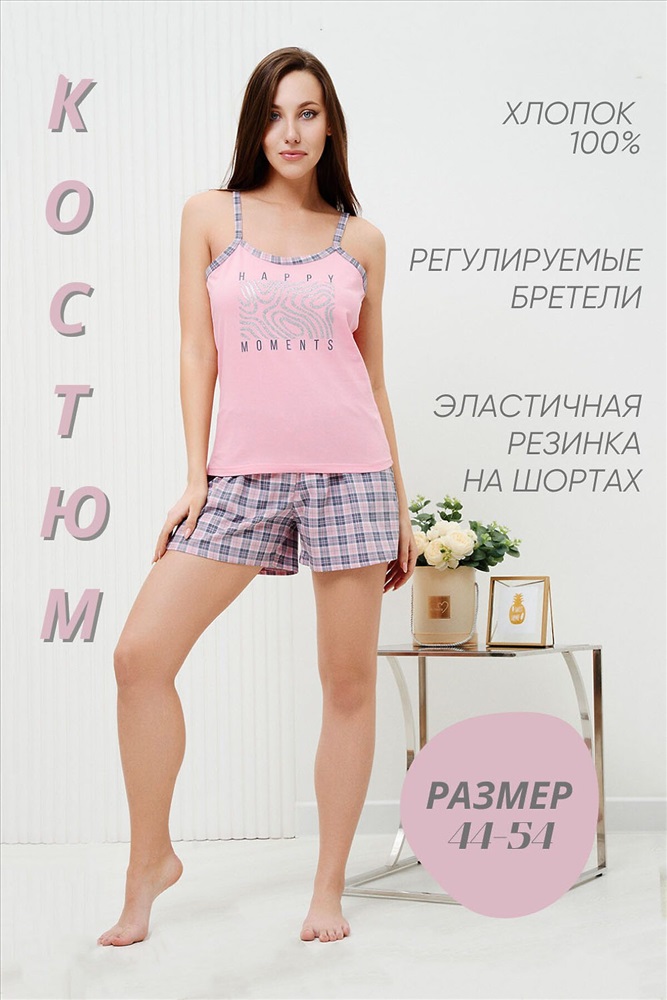 Страна производства: Россия Костюм женский из кулирного полотна, состав 100% хлопок состоит из приталенного топа и шорт свободного кроя. Топ на регулируемых лямках, на полочке принт, низ обработан на плоскошовной машине. Шорты на эластичной резинке, спереди имитация гульфа на пуговицах, низ шорт обработан на плоскошовной машине. Легкий в уходе. *Примечание: длинна топа может варьироваться от регулировки лямок.