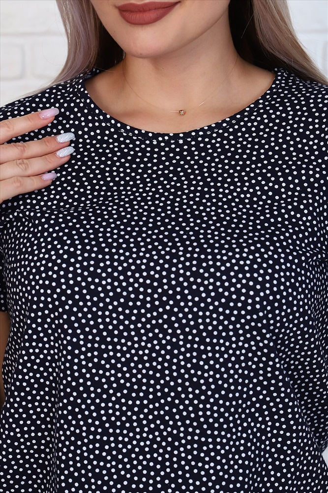 Страна производства: Россия Костюм женский с шортами в горошек из кулирного полотна, футболка с коротким рукавом свободного силуэта, низ футболки обработан под резинку, шорты широкого покроя с карманами. Замечательный комплект для отдыха и повседневной носки.