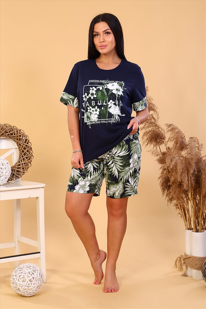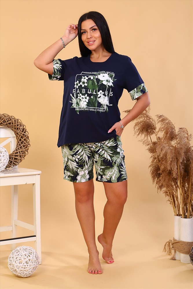 ID товара: 880823 Состав: 100% Хлопок Сезон: Демисезон Длина: Средняя Фасон: Прямой Рукав: короткие Декоративные элементы: Принт Основная ткань: Кулирка Страна бренда: Россия Страна производства: Россия Женский костюм из кулирки футболка+шорты. Футболка из однотонной ткани с печатью, рукава короткие с манжетами, шорты из набивной ткани, с карманами Комментарии к товару