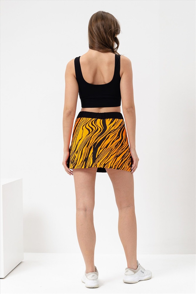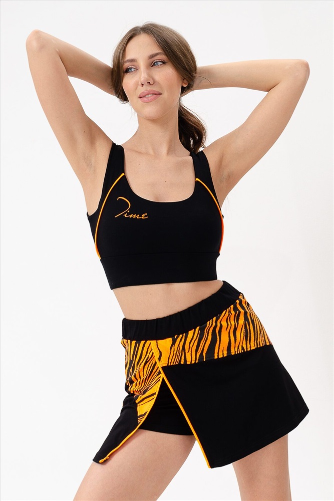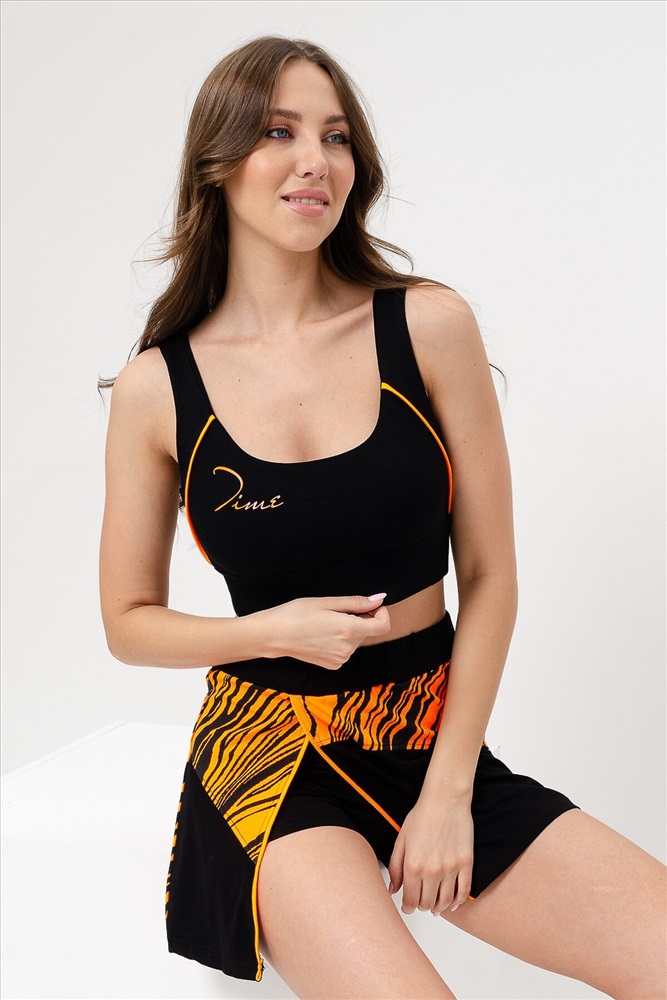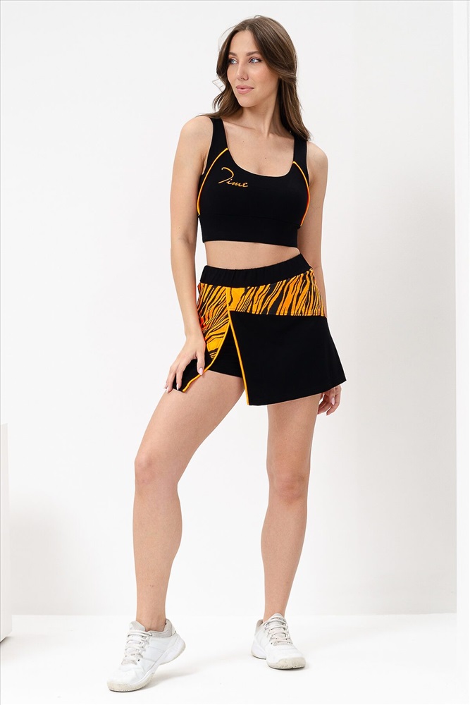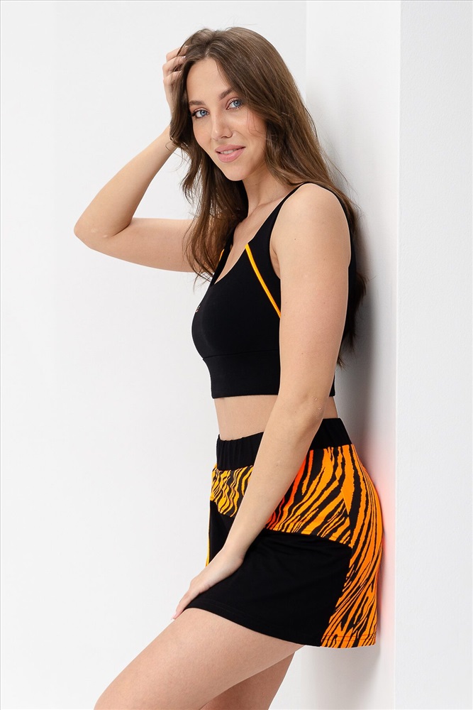 Страна производства: Россия Костюм женский спортивный состоит из укороченного топа и юбки - шорт, с принтом и отделкой из яркого канта. Подходит для активного отдыха и занятий спортом. Очень удобен для езды на велосипеде.