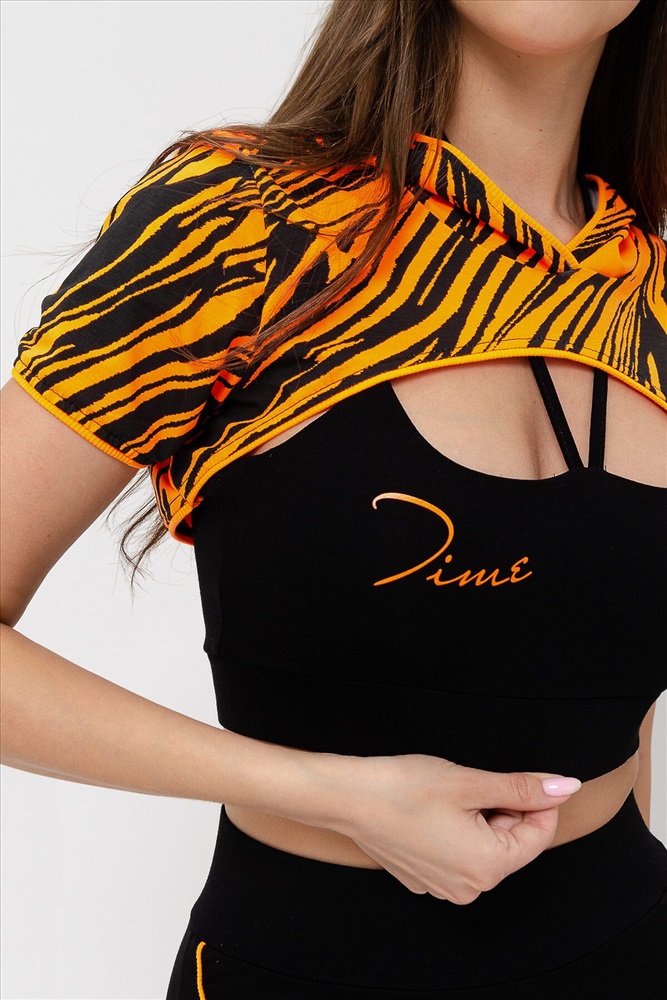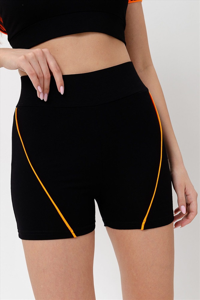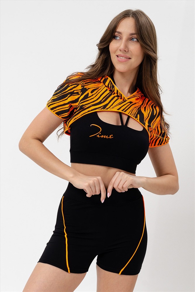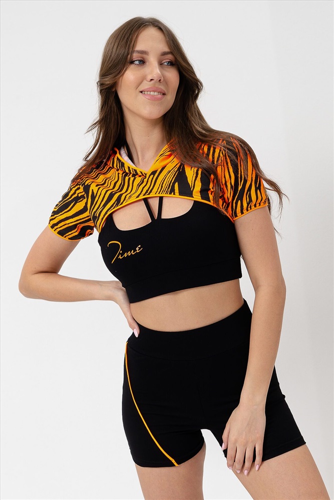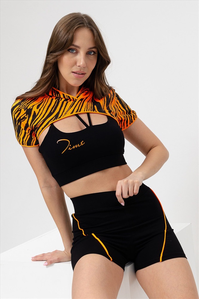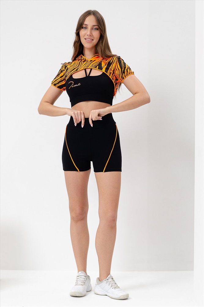 Костюм женский спортивный - тройка, состоит из худи с капюшоном, укороченного топа на тонких бретелях и шорт с широкой эластичной резинкой в поясе.