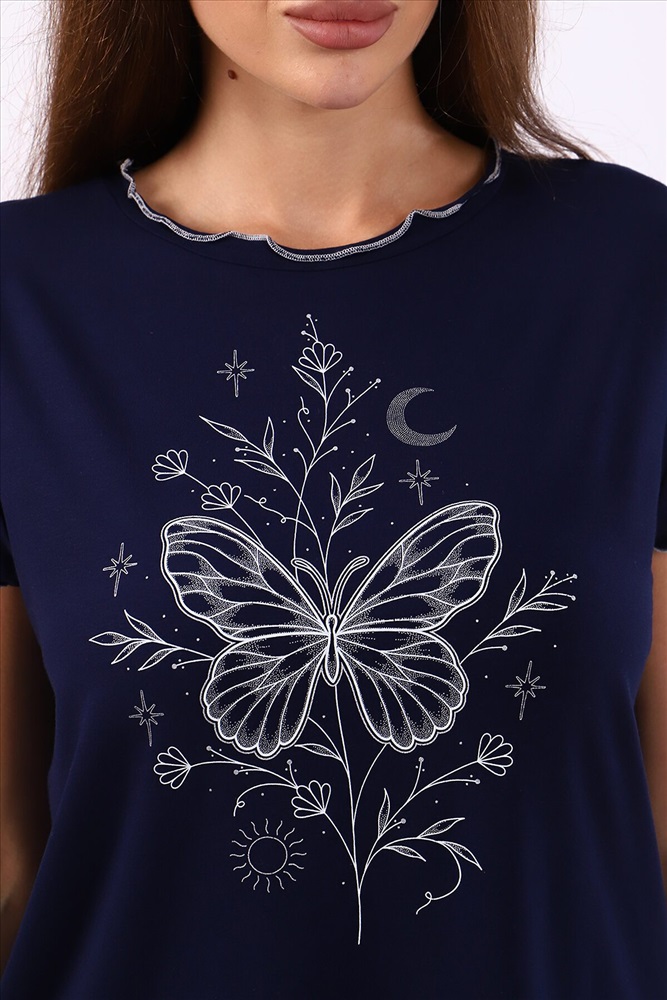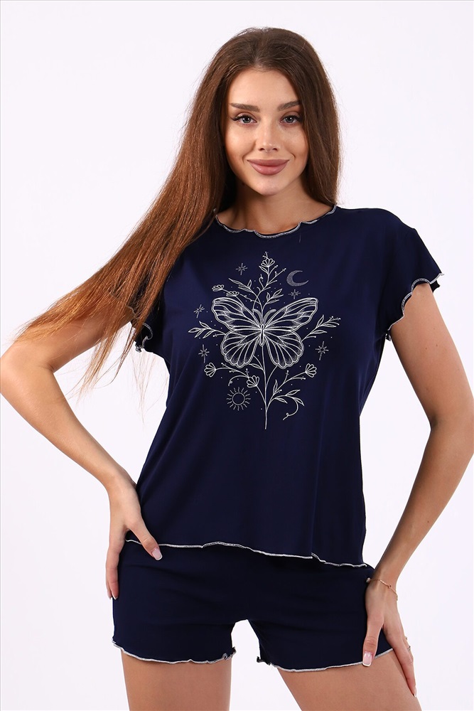 ID товара: 876401 Состав: 94% Вискоза, 6% Эластан Сезон: Демисезон Длина: Средняя Фасон: Полуприлегающий Рукав: короткие Крой брючин: Прямой Рисунок: бабочки Декоративные элементы: Печатный принт Основная ткань: Вискоза Страна бренда: Россия Страна производства: Россия Женский костюм-пижама из эластичной ткани - вискозы, состоящий из футболки и шорт. Футболка свободного силуэта с ярким принтом - бабочка на растении и коротким втачным рукавом-крылышком. Горловина, низ рукава и низ футболки обработаны декоративным оверлоком с контрастной нитью в тон принта. Изделие выполнено из вискозного полотна мягкого и нежного на ощупь, оно приятно к телу, гигроскопично, не скатывается и не линяет. Удобный домашний костюм для отдыха и сна, для дачи, на море, прекрасный подарок любимым девушкам на любой повод! Комментарии к товару