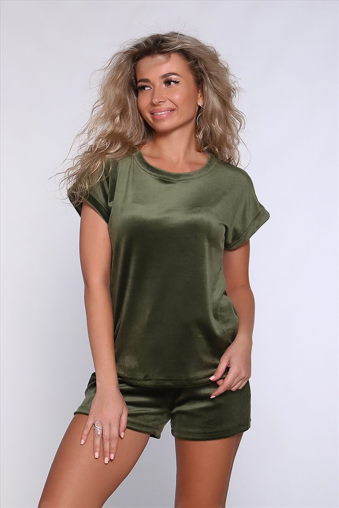 Стильный женский костюм - пижама с шортами из велюра. Футболка со спущенным цельнокроеным плечом полуприлегающего силуэта. Горловина и низ рукава отделаны обтачкой. Короткие классические шорты на широкой резинке с атласным декоративным бантиком по центру. Велюровое полотно имеет нежную и мягкую фактуру. Домашний костюм хорошо смотрится, создает привлекательные блики. Удобный комплект устойчив в процессе носки, не садится, практически не мнется и не растягивается. Рекомендованная стирка не выше 30 градусов. Замеры рукава в данной модели указаны от края горловины, обхват талии в шортах - в собранном резинкой виде. В таком домашнем костюме, Вы почувствуете себя королевой!