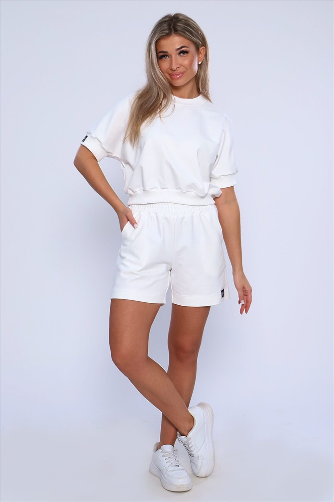 ID товара: 894437 Состав: Хлопок 75%; Полиэстер 20%; Лайкра 5% Сезон: Весна/Лето Длина: Средняя Фасон: Свободный крой Рукав: короткие Крой брючин: Прямой Тип карманов: В шве Основная ткань: Хлопок Стиль: Спорт-шик Вид ткани: Футер с лайкрой 2-х нитка Страна бренда: Россия Страна производства: Россия Костюм молодежный из футера 2-х нитки. Костюм с шортами и укороченной кофты. Кофта со спущенным рукавом, рукава и пояс на кашкорсе на одном из рукавов эмблема, шорты с карманами, пояс сделан поясной машиной, на подгибе тоже эмблема. На модели размер 46-48. Комментарии к товару