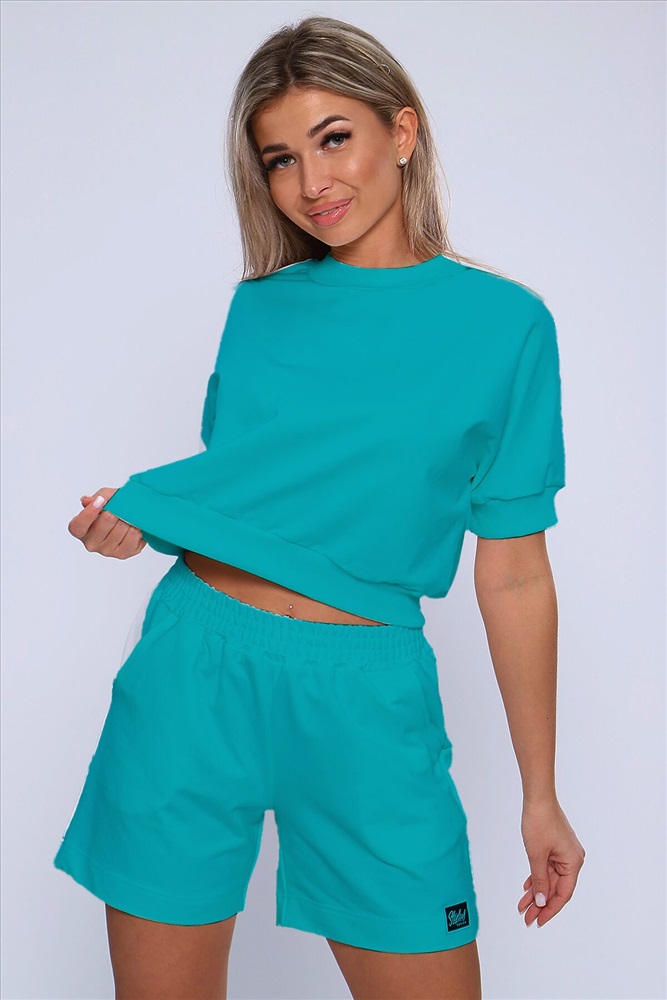 Костюм молодежный из футера 2-х нитки. Костюм с шортами и укороченной кофты. Кофта со спущенным рукавом, рукава и пояс на кашкорсе на одном из рукавов эмблема, шорты с карманами, пояс сделан поясной машиной, на подгибе тоже эмблема. На модели размер 46-48.