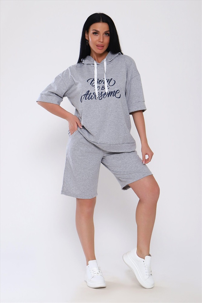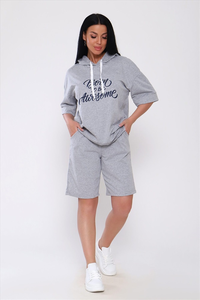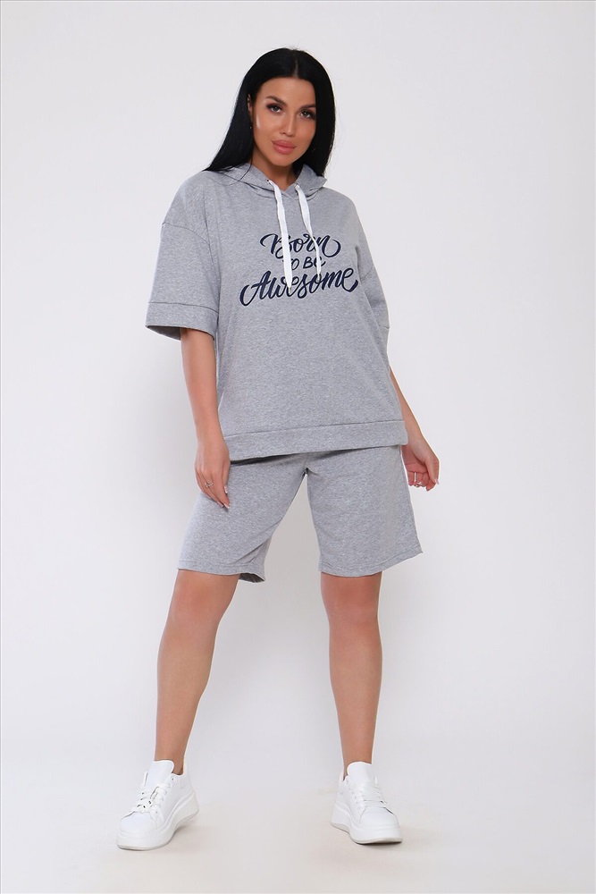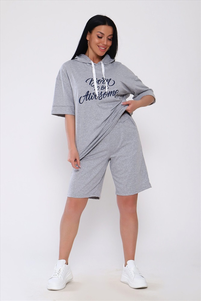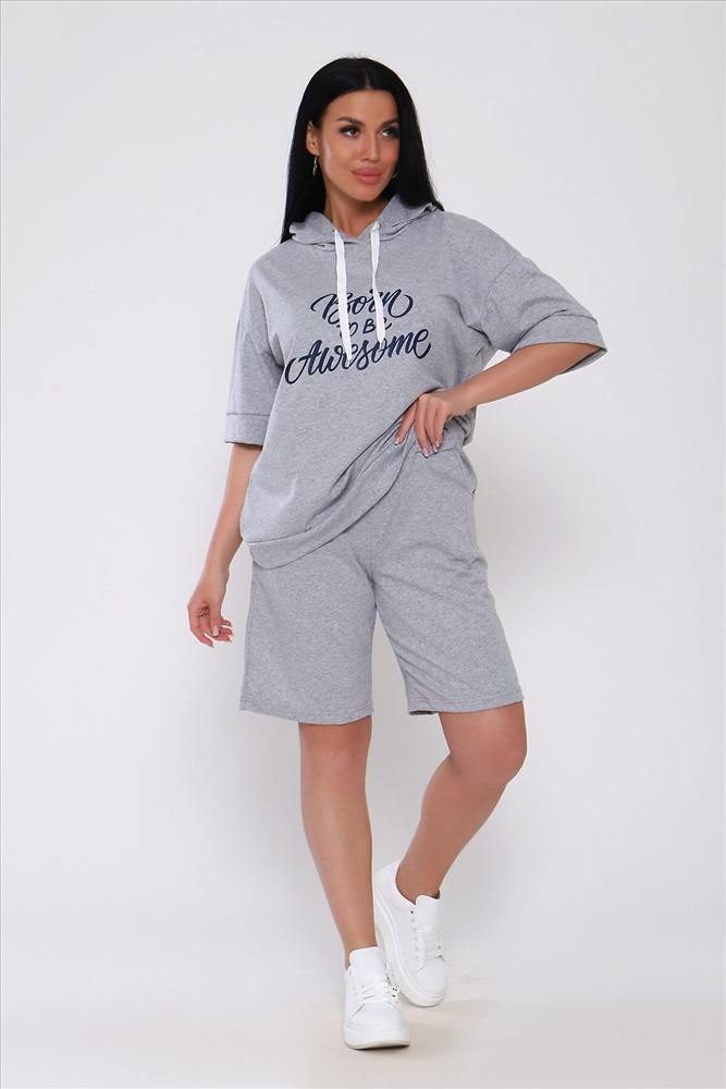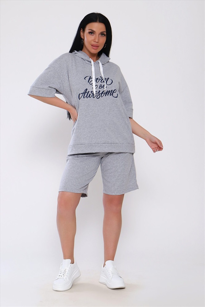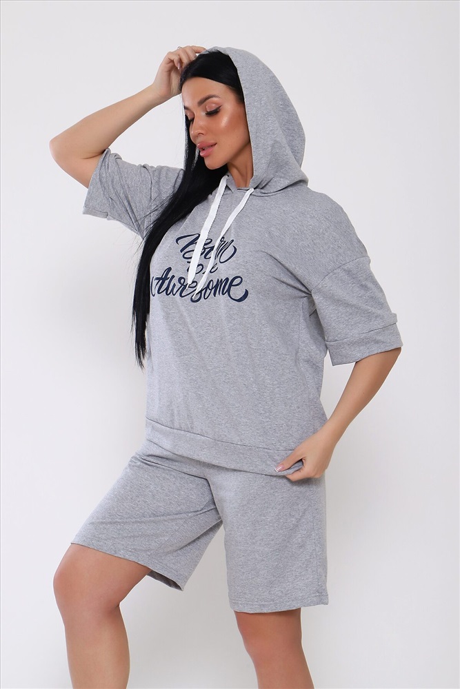 Костюм с шортами из кулирки с лайкрой. Кофта свободная с капюшоном с люверсами и шнурком. По переду принт ,рукав короткий на манжете, длинна до бедра .Шорты свободного покроя с карманами, длина до колена. На модели размер 48-50.Шнурки от партии могут отличаться. Размеры сдвоены.