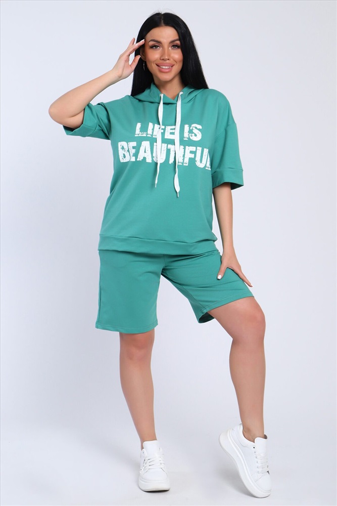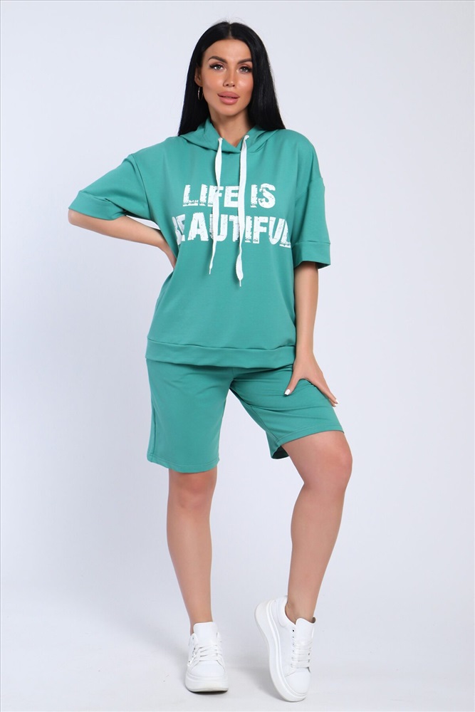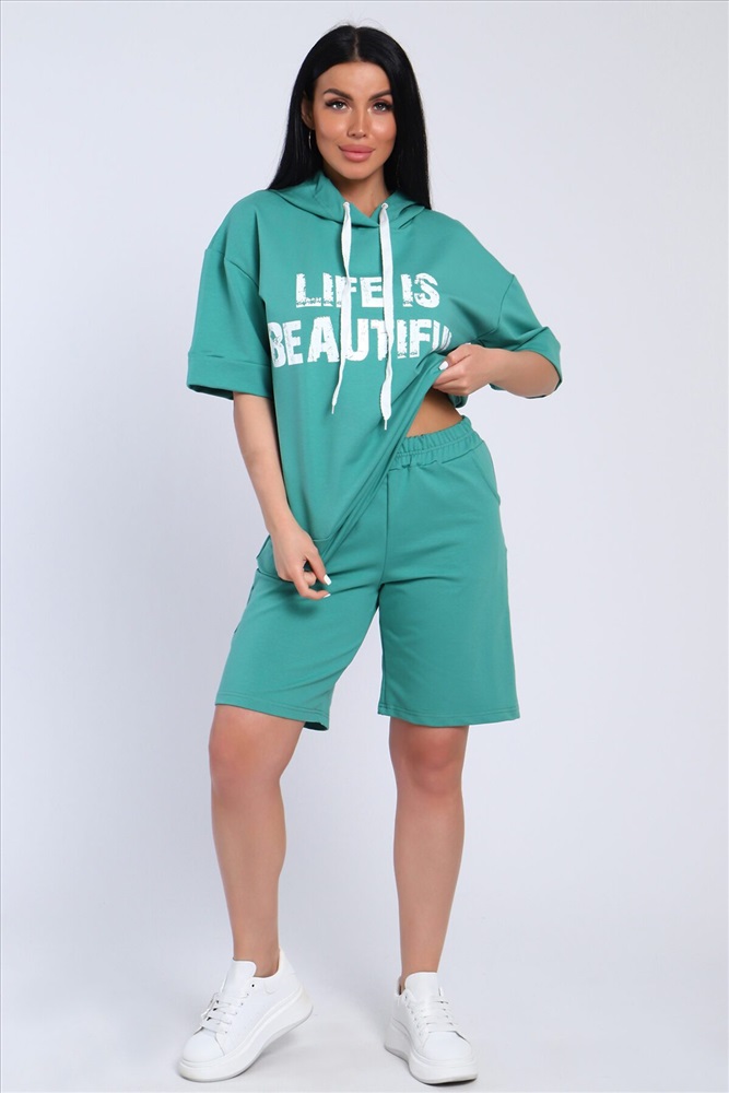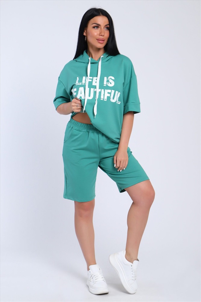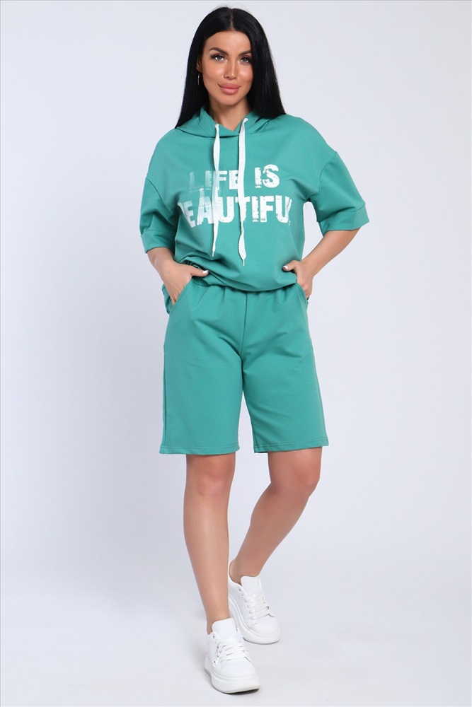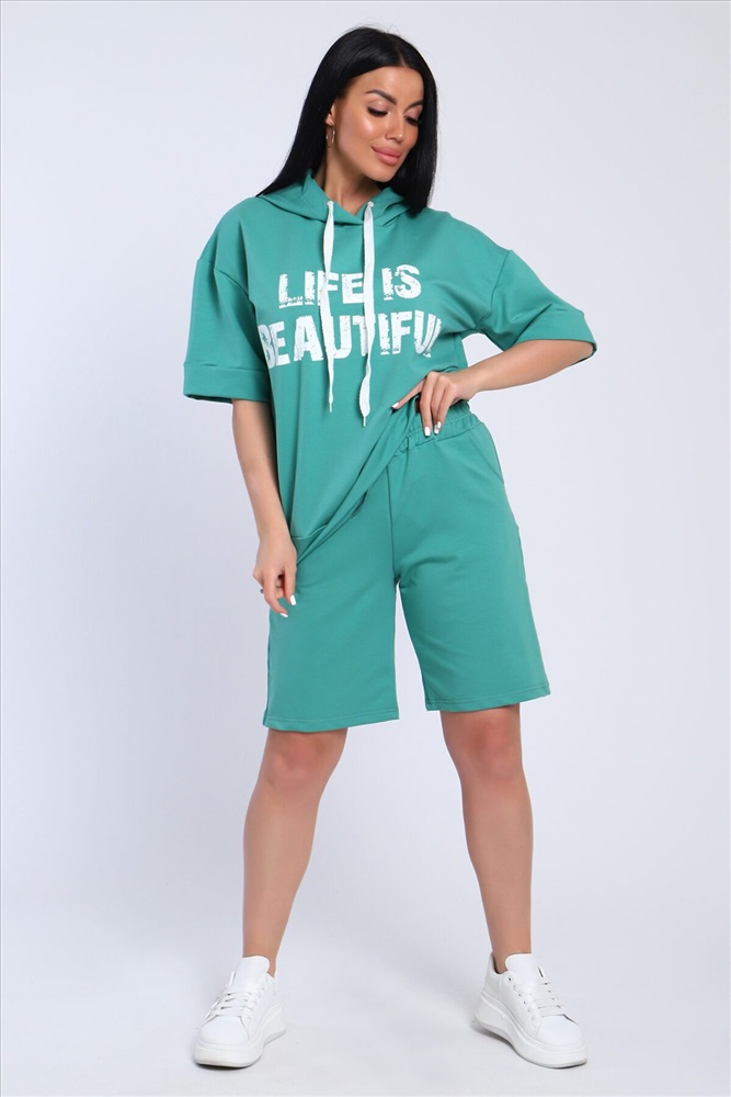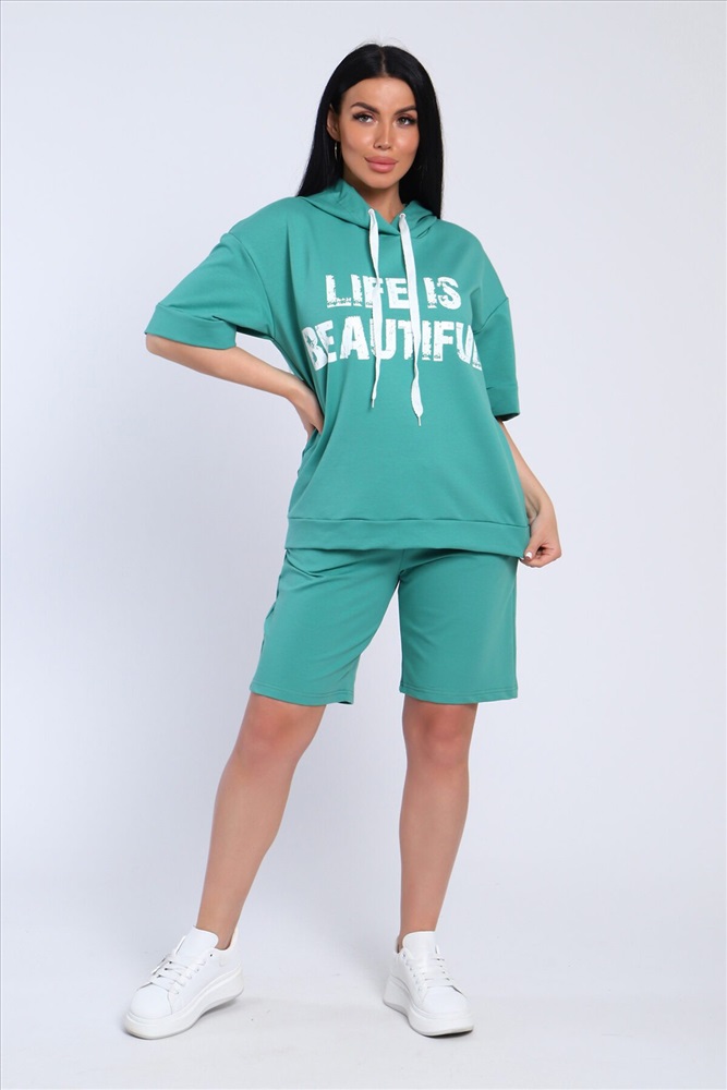 ID товара: 1003555 Состав: Хлопок 75%, Полиэстер 20%, Лайкра 5% Сезон: Весна/Лето Фасон: Прямой Рукав: До локтя Крой брючин: Прямой Рисунок: Надпись Вид ткани: Футер с лайкрой 2-х нитка Страна бренда: Россия Страна производства: Россия Костюм женский,выполн6ен из футера 2‑х нитки. Кофта свободного кроя со спущенным рукавом до локтя, длина до середины бедра в зависимости от роста, с капюшоном, по передней части принт. Шорты до колена с карманами. На модели 48 размер. У костюмов кофта сдвоенные размеры. Комментарии к товару