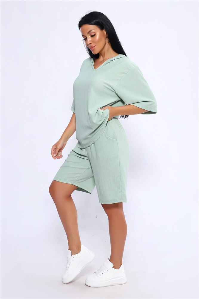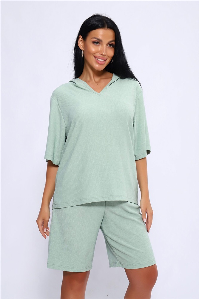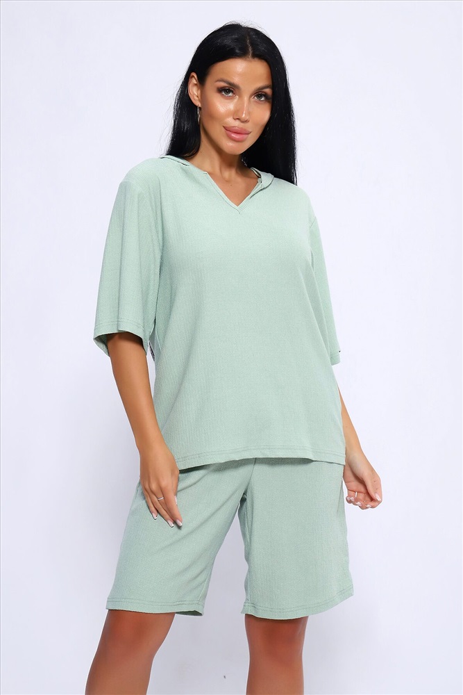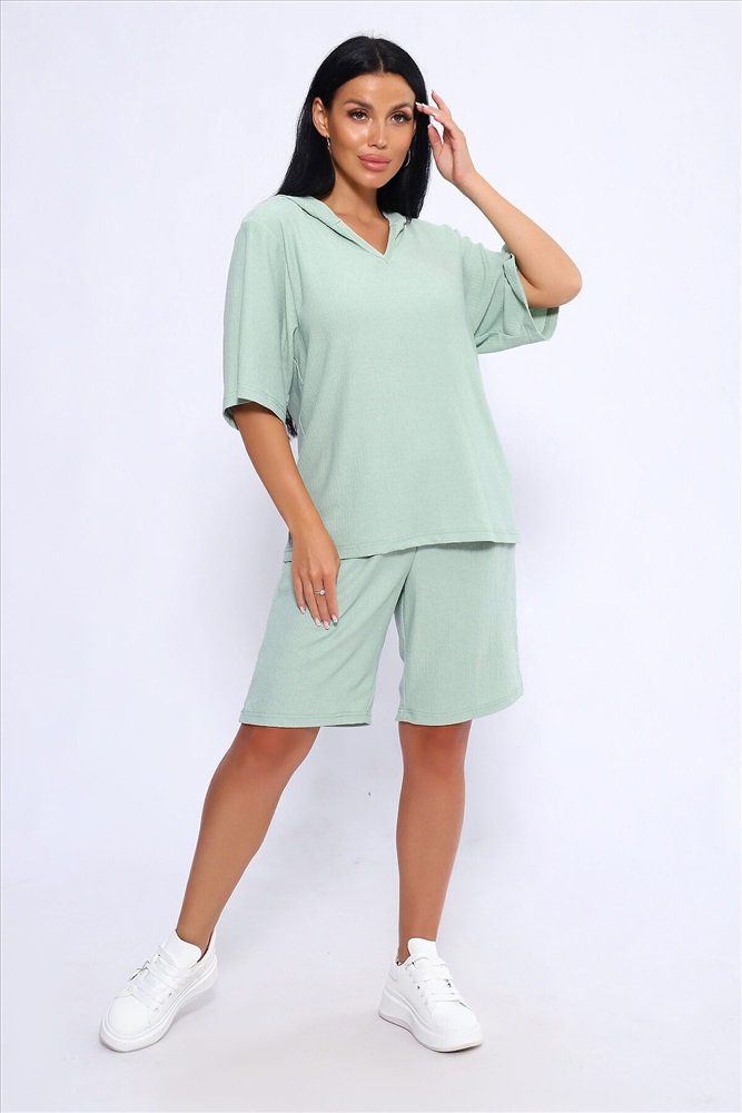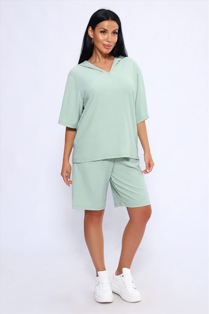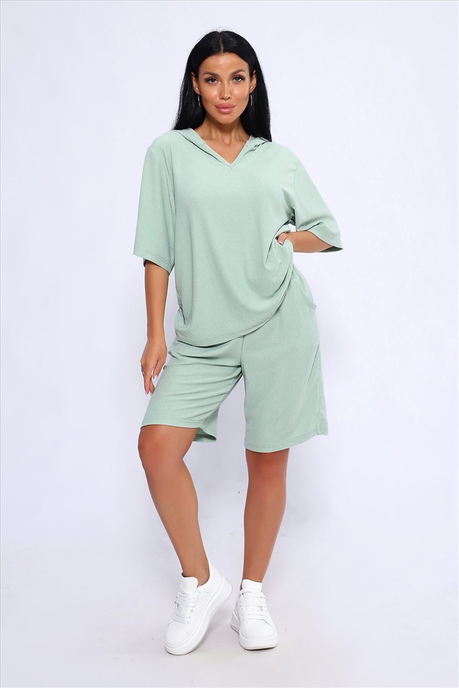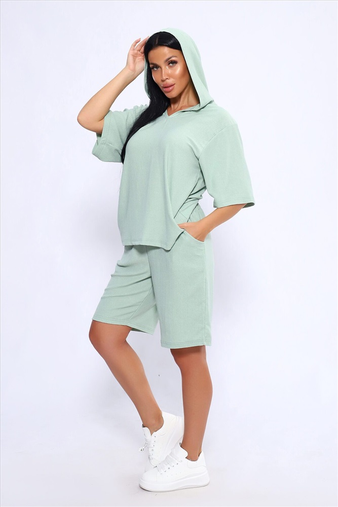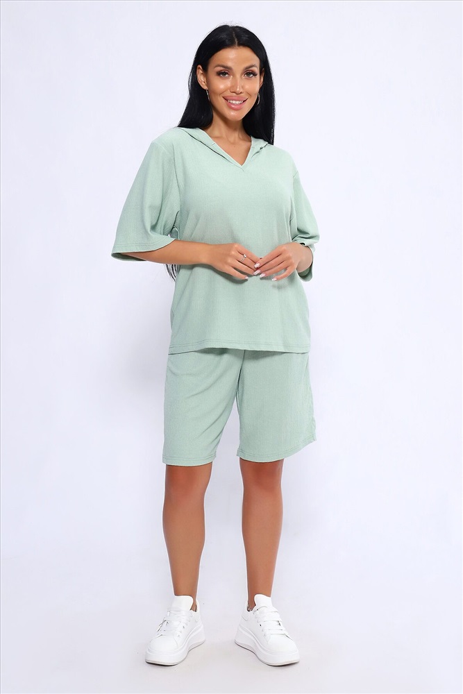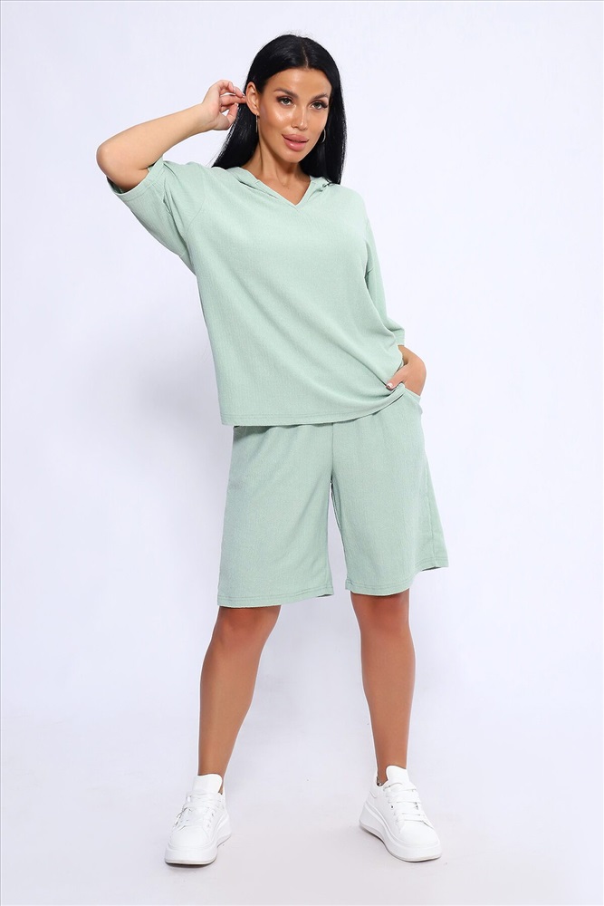 ID товара: 1025842 Состав: Полиэстер 100% Сезон: Весна/Лето Длина: Средняя Фасон: Свободный Рукав: короткие Крой брючин: Широкий Тип карманов: С отрезным бочком Декоративные элементы: С капюшоном Основная ткань: Полиэстер Стиль: повседневный Вид ткани: Жатка Страна бренда: Россия Страна производства: Россия Женский летний костюм из интересного легкого, жатого материла в пастельных тонах. Ткань износостойкая, с приятными тактильными свойствами. Комплект состоит из кофты свободного кроя с капюшоном и шорт на эластичной резинке шириной 3 см., в боковых швах расположены карманы, длина шорт чуть выше колена. Комплект подходит как для отдыха дома, так и более активного времяпрепровождения как на природе, так и в городе. В нем будет очень удобно находиться и выполнять привычные для вас действия. По спинке кофты может быть шов. На фото модель представлена в 48 размере. Комментарии к товару