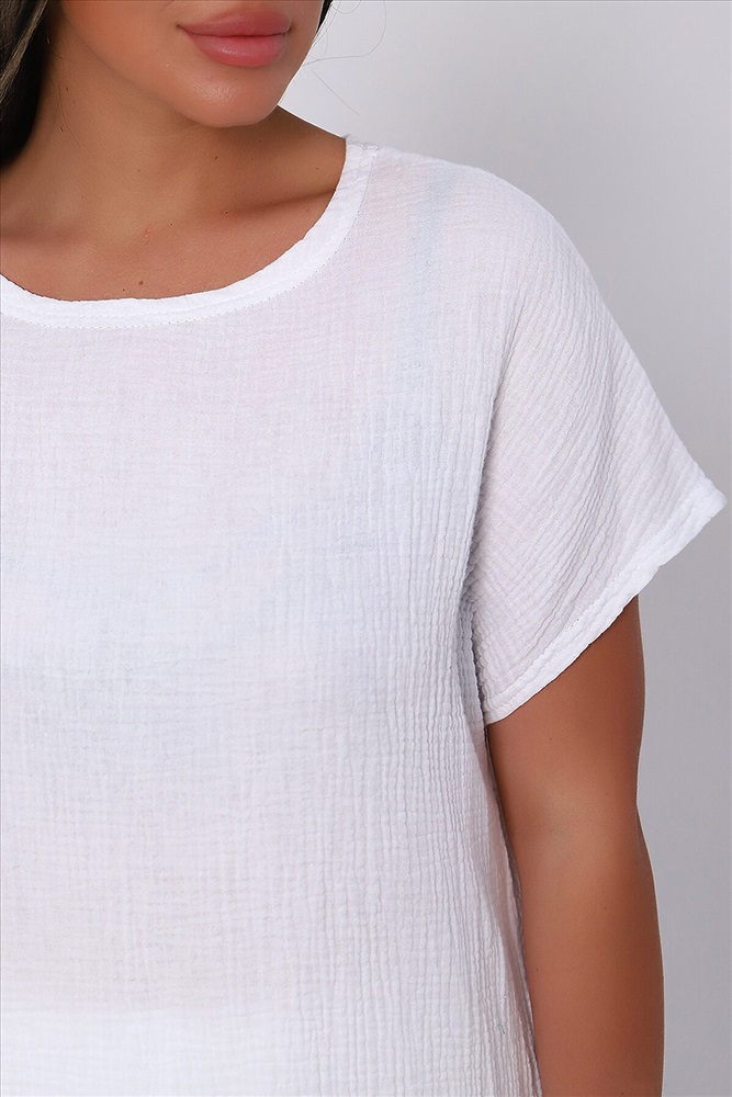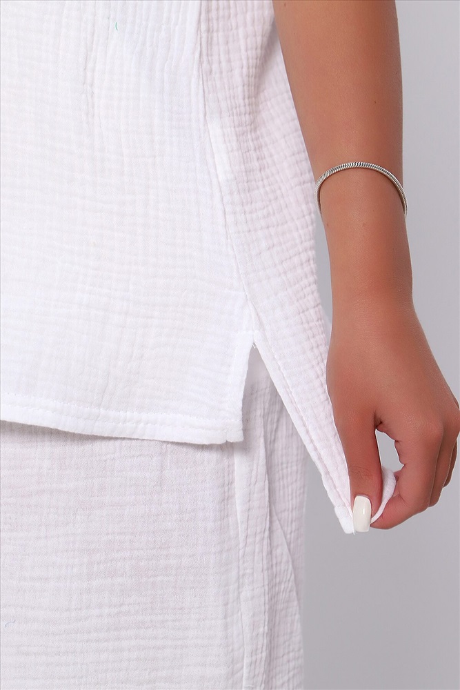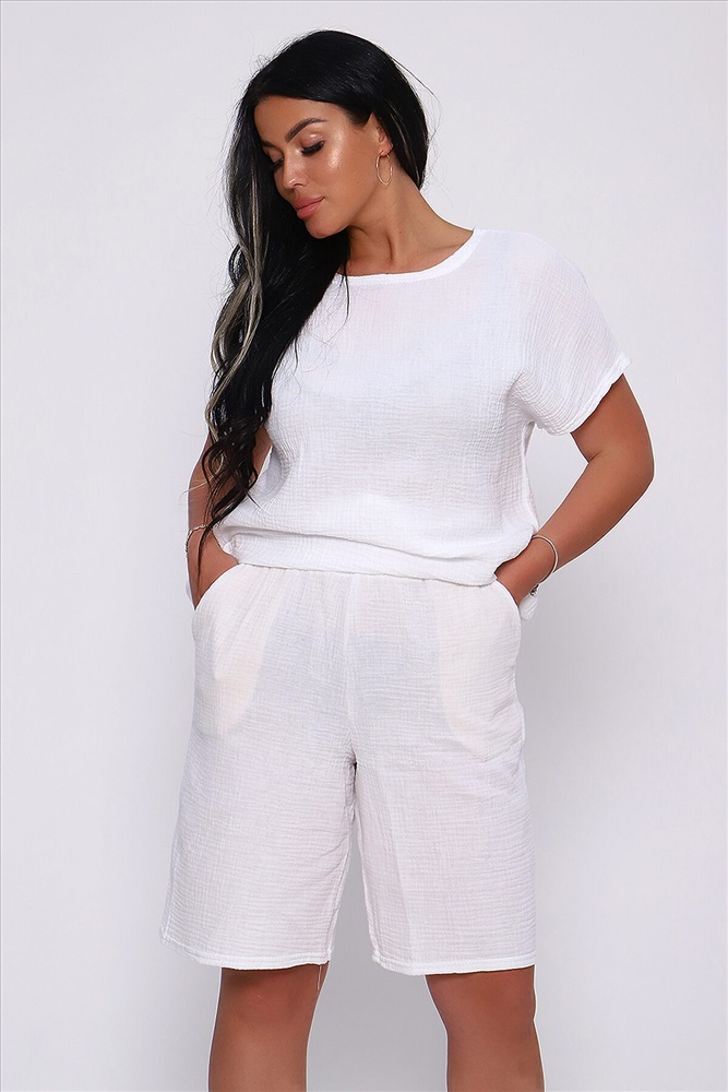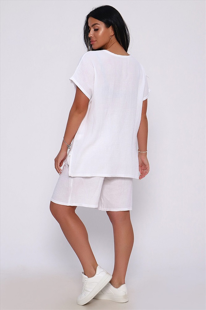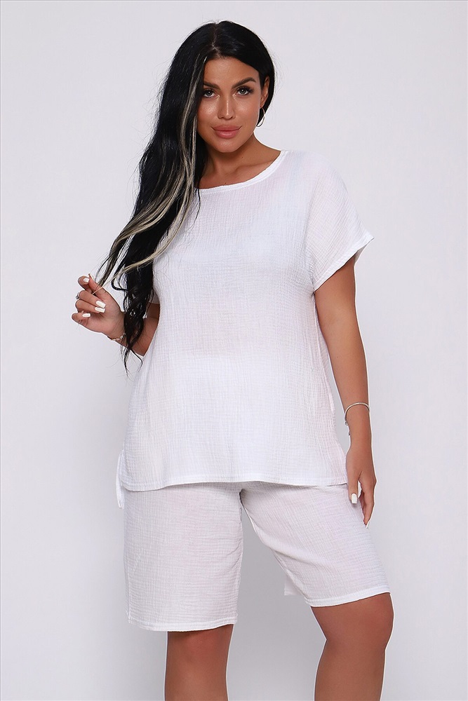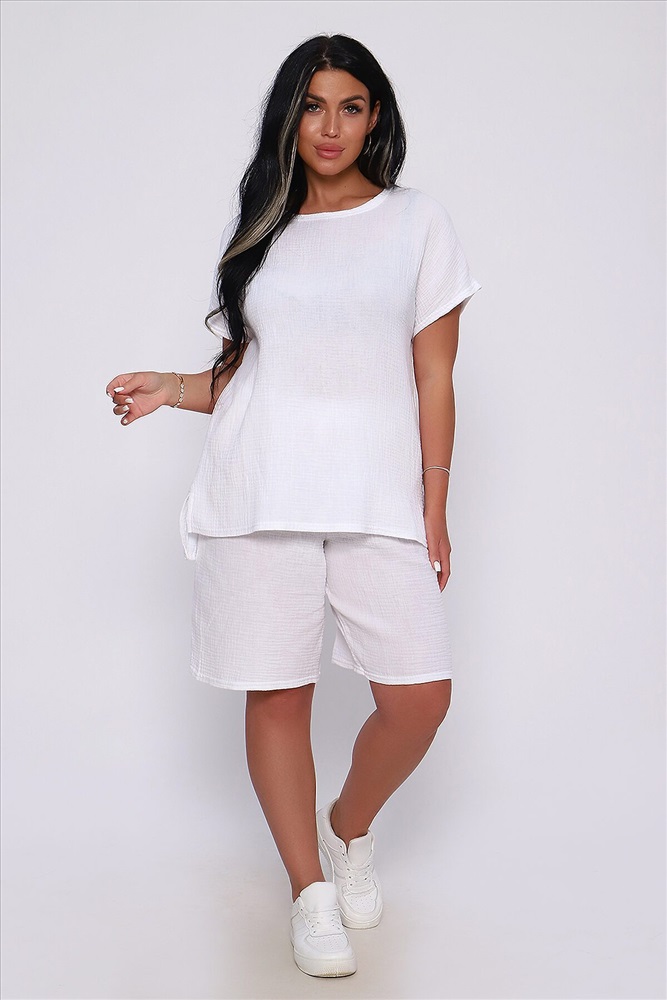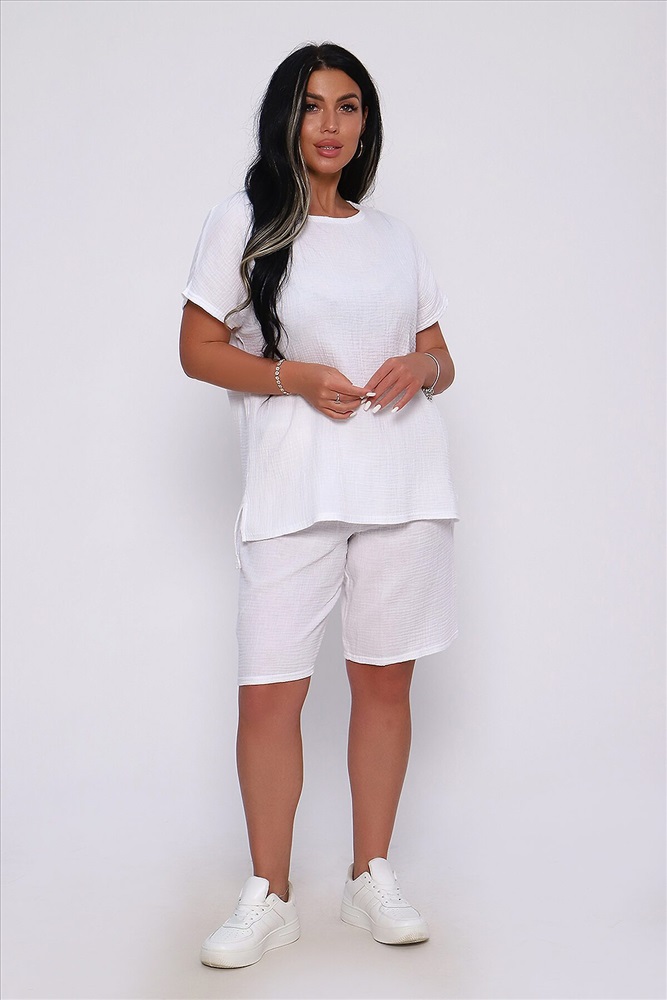 Страна производства: Россия Костюм летний из однотонной хлопковой ткани муслин двухслойный. Комплект состоит из футболки и шорт - бермуды. Горловина футболки в виде лодочки, спущенная пройма, по бокам небольшие разрезы, низ спинки чуть длиннее переда. Шорты с боковыми карманами, удобная посадка, широкий распошитый пояс. Летний костюм идеален для путешествий, отдыха на море, праздника и вечеринок. За счет свободного кроя комплект удобен в качестве повседневной одежды, не стесняет движений и отлично смотрится на любой фигуре. Изделие выполнено из мягкого, легкого и приятного к телу хлопка, что позволит чувствовать себя комфортно в жаркую погоду.