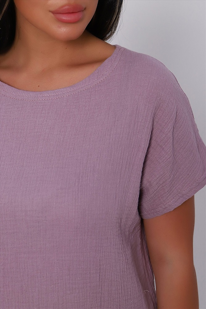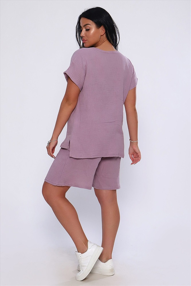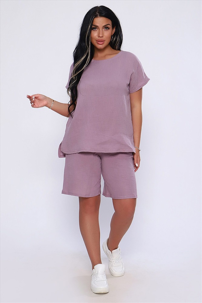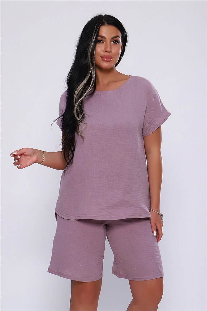 Костюм летний из однотонной хлопковой ткани муслин двухслойный. Комплект состоит из футболки и шорт - бермуды. Горловина футболки в виде лодочки, спущенная пройма, по бокам небольшие разрезы, низ спинки чуть длиннее переда. Шорты с боковыми карманами, удобная посадка, широкий распошитый пояс. Летний костюм идеален для путешествий, отдыха на море, праздника и вечеринок. За счет свободного кроя комплект удобен в качестве повседневной одежды, не стесняет движений и отлично смотрится на любой фигуре. Изделие выполнено из мягкого, легкого и приятного к телу хлопка, что позволит чувствовать себя комфортно в жаркую погоду.