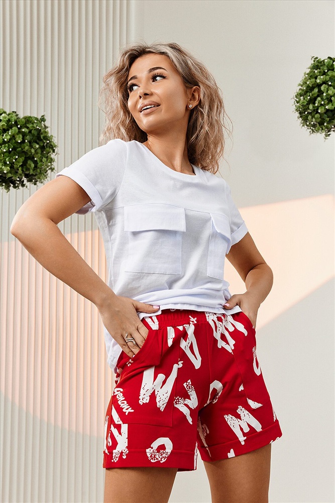 Страна производства: Китай Футболка прямого силуэта, с округлой горловиной, длиной до середины бедра. Рукав втачной, короткий, с отворотом. На полочке расположены накладные карманы с клапаном. Горловина обработана обтачкой из эластичного полотна. Шорты прямые, свободные, на поясе, с боковыми накладными карманами, с манжетами.