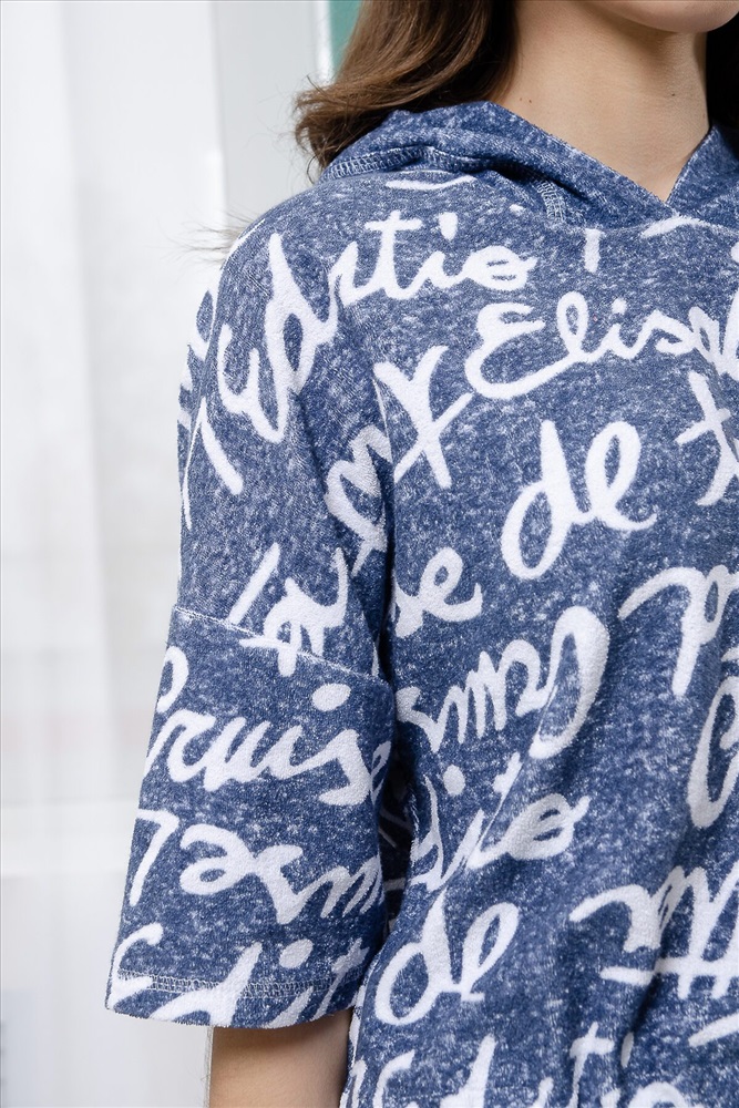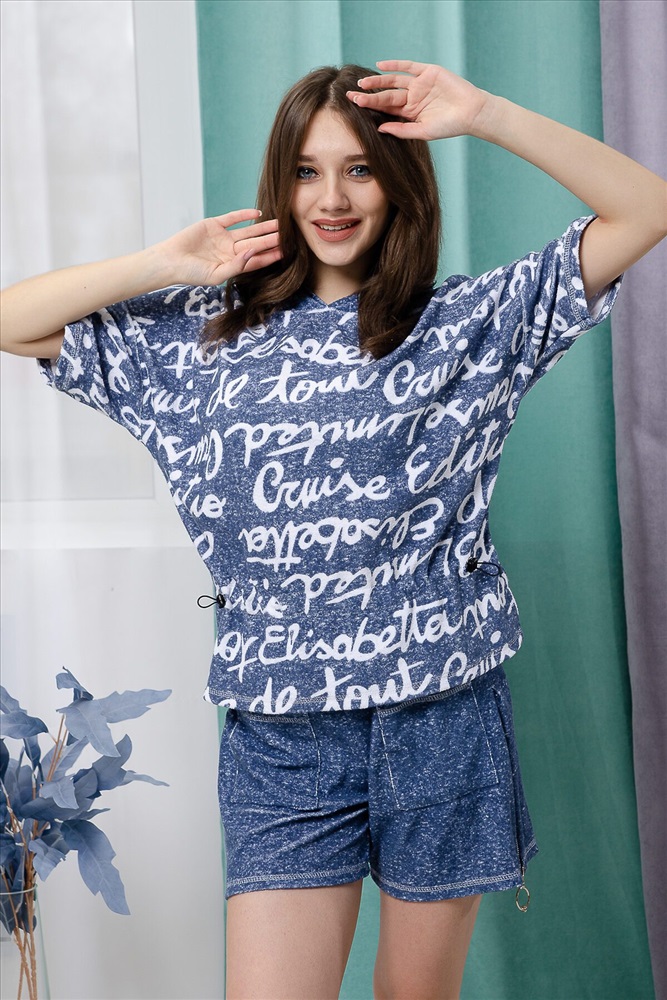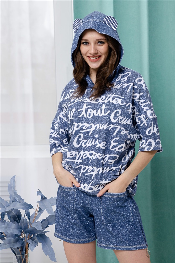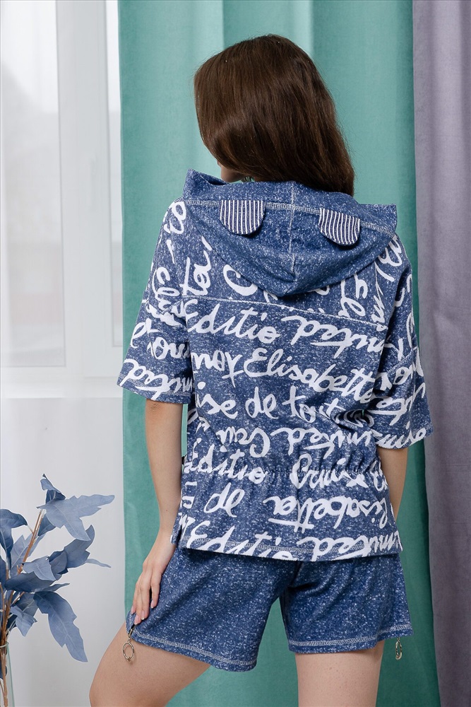 Страна производства: Россия Костюм состоит из туники и шорт. Туника прямая, свободная, с резинкой по талии, с ушками на капюшоне, с разрезами в нижней части боковых швов. Рукав короткий. Шорты прямые, на поясе, с накладными карманами спереди. Вдоль боковых швов расположены молнии.
