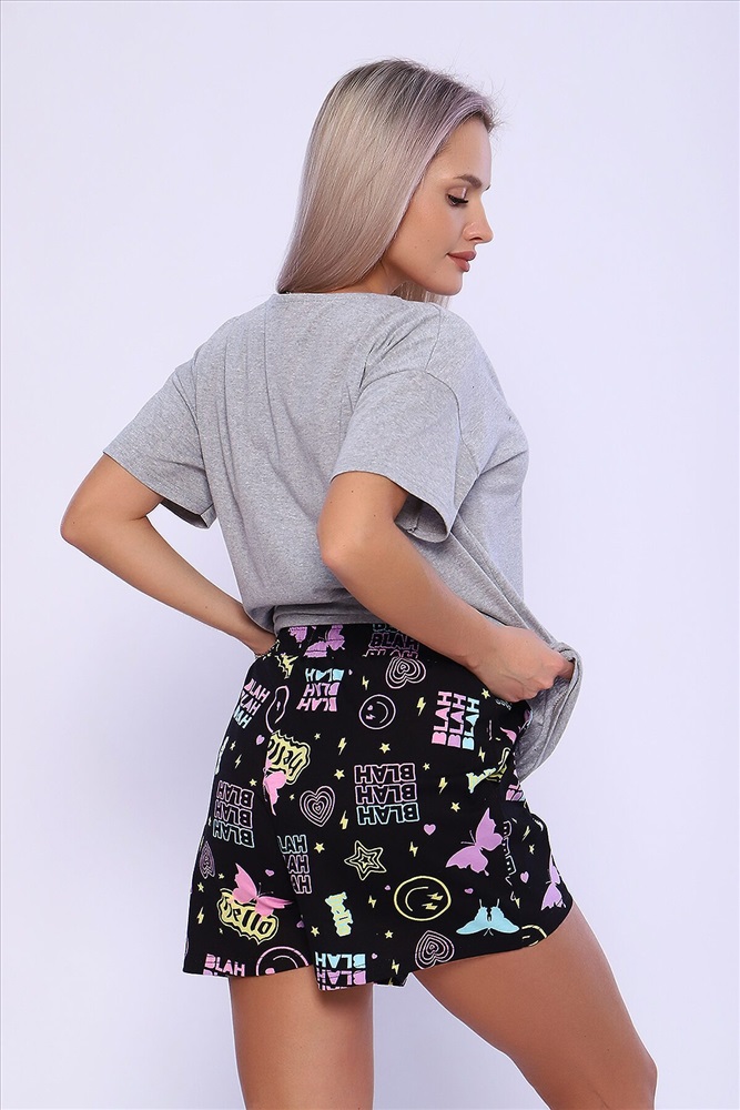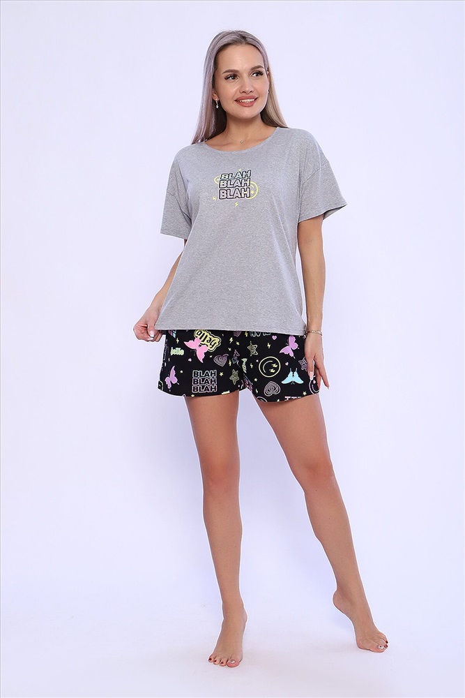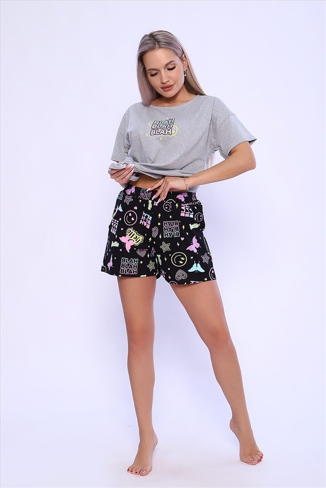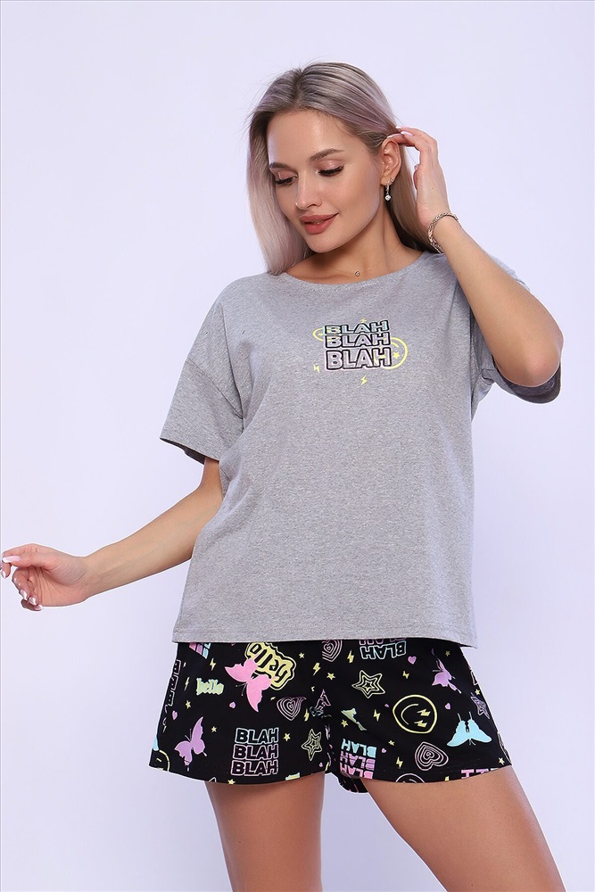 ID товара: 960607 Состав: Хлопок 100% Сезон: Демисезон Длина: Средняя Фасон: Свободный крой Рукав: короткие Декоративные элементы: Принт Основная ткань: Хлопок Вид ткани: Кулирка Страна бренда: Россия Страна производства: Россия Костюм женский с шортами. Данная модель выполнена из трикотажного полотна кулирка (хлопок 100%). Футболка в стиле оверсайз, на полочке присутствует принт, а горловина обработана потайным окантовочным швом. Отлично подходит для сна и отдыха. Комментарии к товару