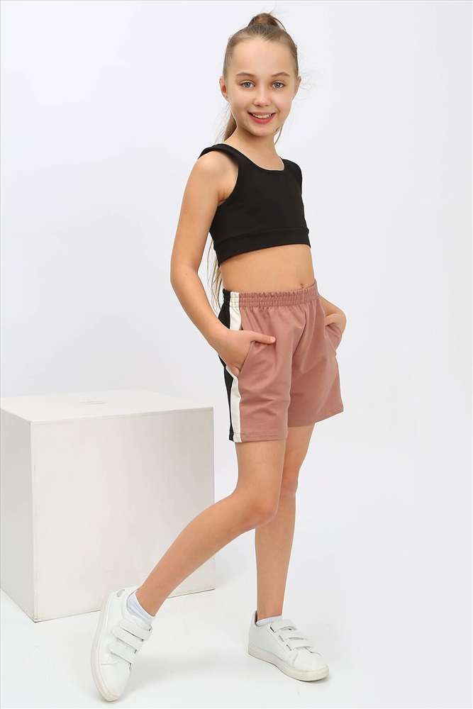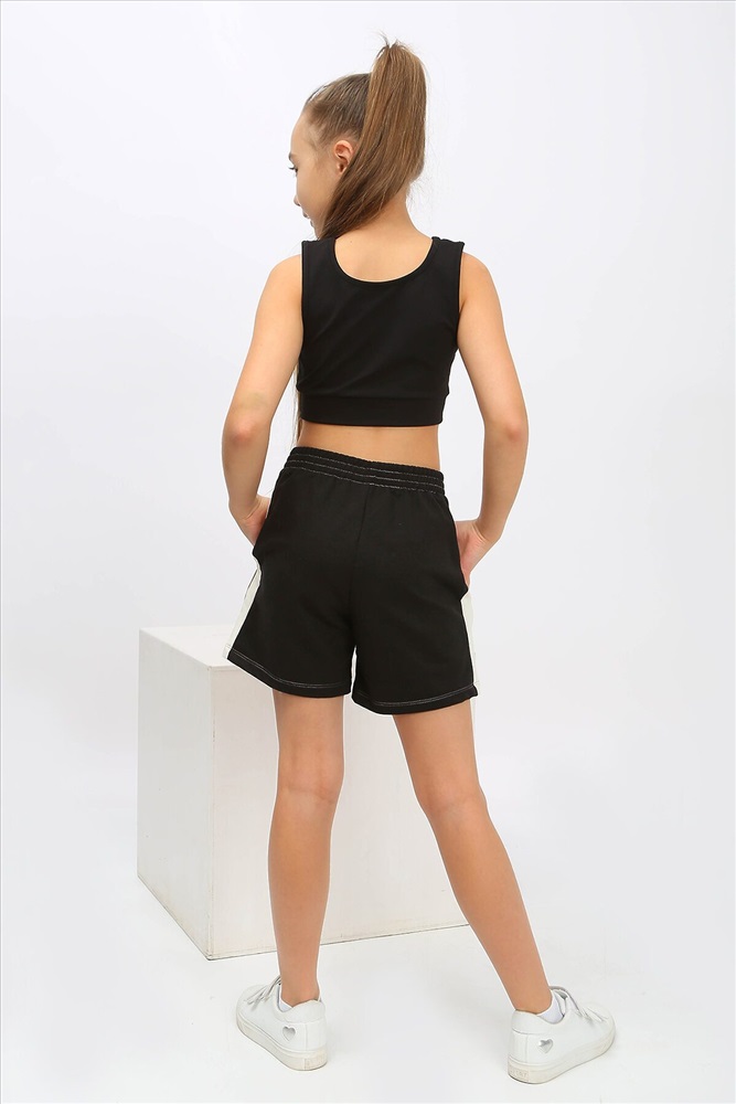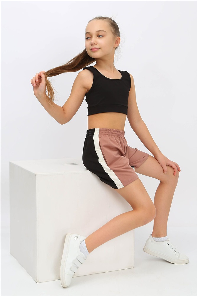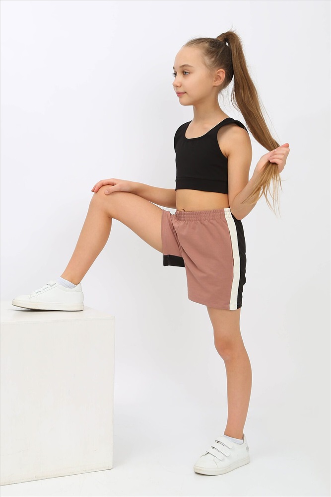 Страна производства: Россия Костюм для девочки. Состоит из спортивного топа и шорт. Верх выполнен из кулирки с эластаном, низ - из футера 2‑х нитки в сочетании двух цветов. Топ на широких бретелях, пройма обработана кантом, по низу пояс. Шорты свободного кроя с цельнокроеным поясом с резинкой внутри, в боковых швах карманы. Костюм подойдет для активного отдыха и занятий.