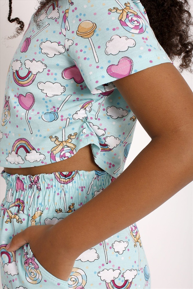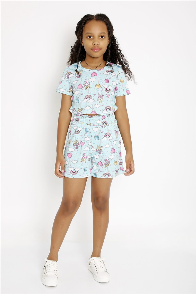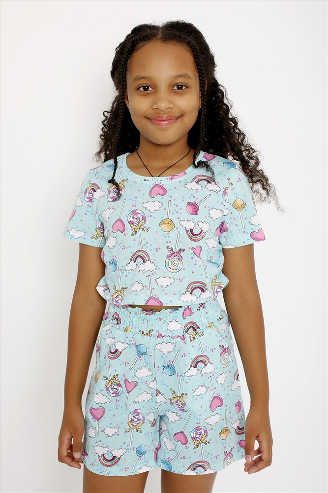 Костюм из легкой хлопковой ткани. Футболка прямого покроя, длиной до талии, с небольшими сборками по боковым швам. Рукав втачной, короткий. Горловина отделана узкой обтачкой из этой же ткани. Шорты свободные, с высокой посадкой, на широком поясе с рюшей и карманами. Ткань гипоаллергенная, хорошо пропускает воздух.