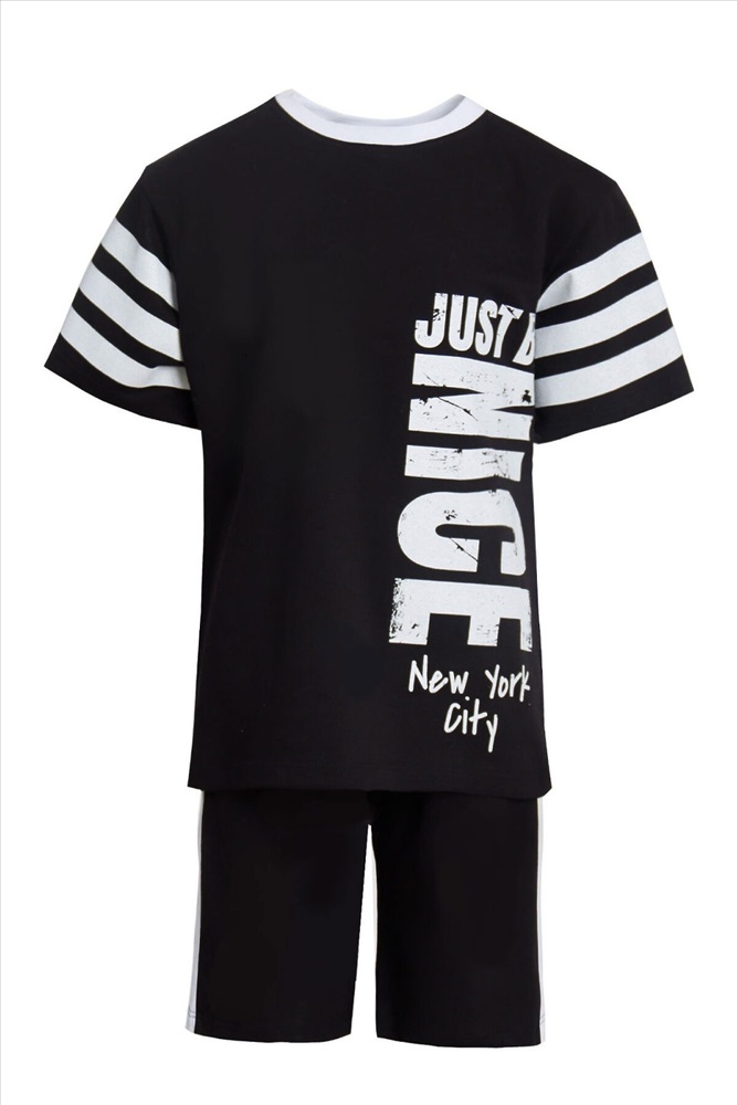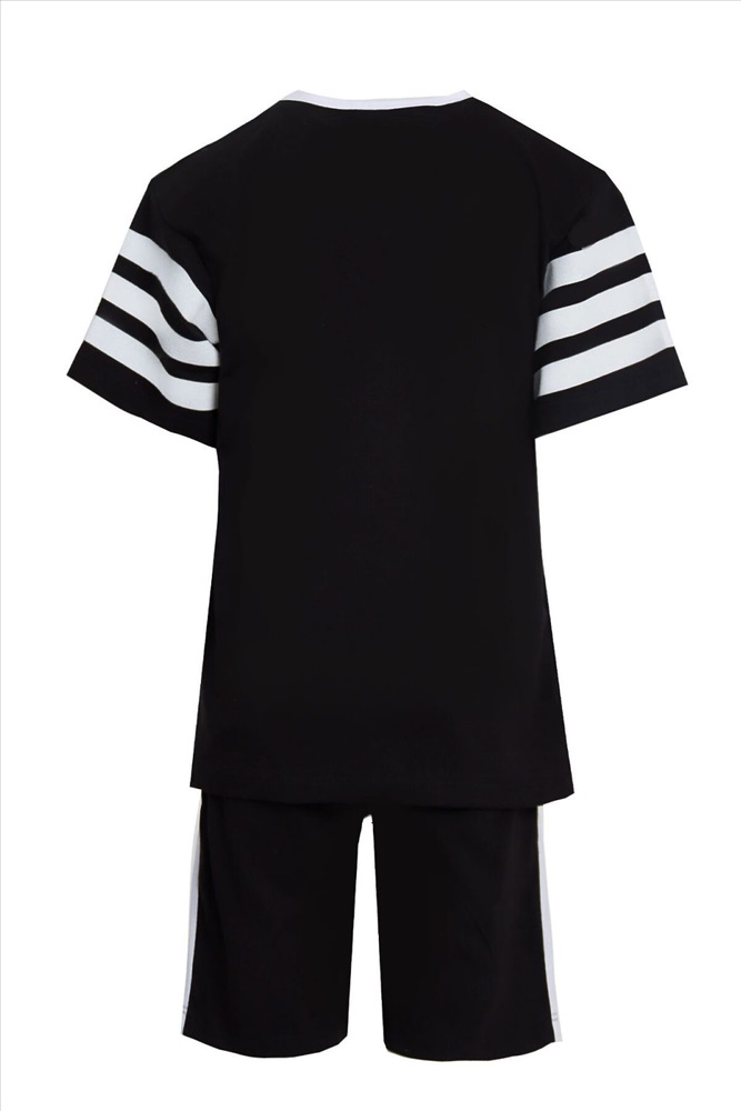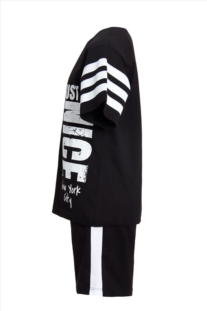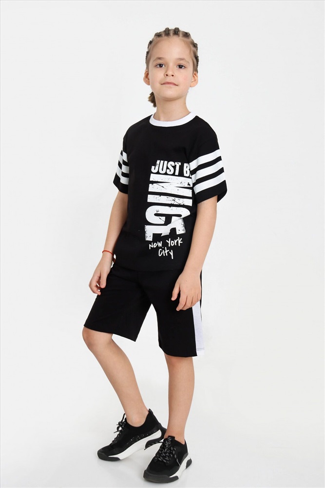 Костюм из натуральной хлопковой ткани кулирки, состоит из футболки и шорт. Силуэт прямой свободный, рукав втачной короткий с заниженной проймой, по горловине обтачка из рибаны, на полочке модный принт. Шорты свободные, длиной до колена, по бокам отделочные вставки.
