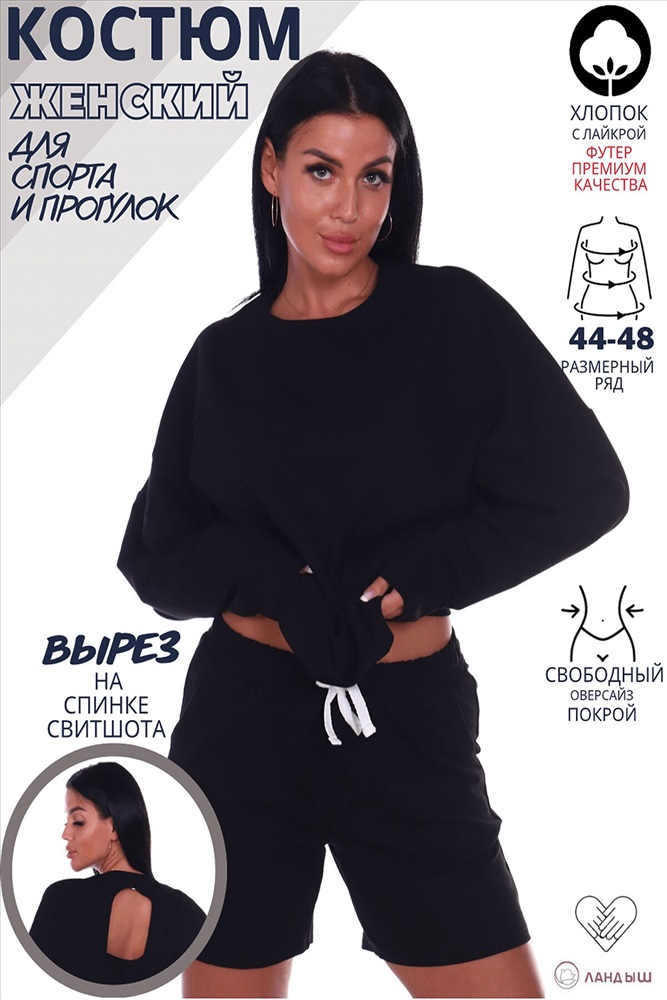ID товара: 878419 Состав: 92% Хлопок, 8% Эластан Сезон: Демисезон Длина: Средняя Фасон: Свободный крой Рукав: длинные Крой брючин: Облегающий Основная ткань: Футер 2-х нитка Стиль: Повседневный Страна бренда: Россия Страна производства: Россия Презентуем Вам авторский женский костюм свитшот с шортами. Комфортный свитшот свободного кроя с округлой горловиной, полочка и спинка с кокетками. Изюминка костюма - эффектный декоративный вырез на спине. Длинные рукава на манжете. По низу пояс. Шорты прямого кроя, с боковыми карманами, посадка на талии, отстроченный пояс из основной ткани, стайлинговый гульфик, низ подогнут на плоскошовной машине. Размер 44 подойдет на размеры 44-46 Комментарии к товару
