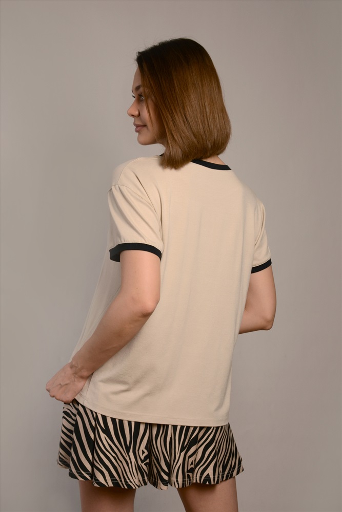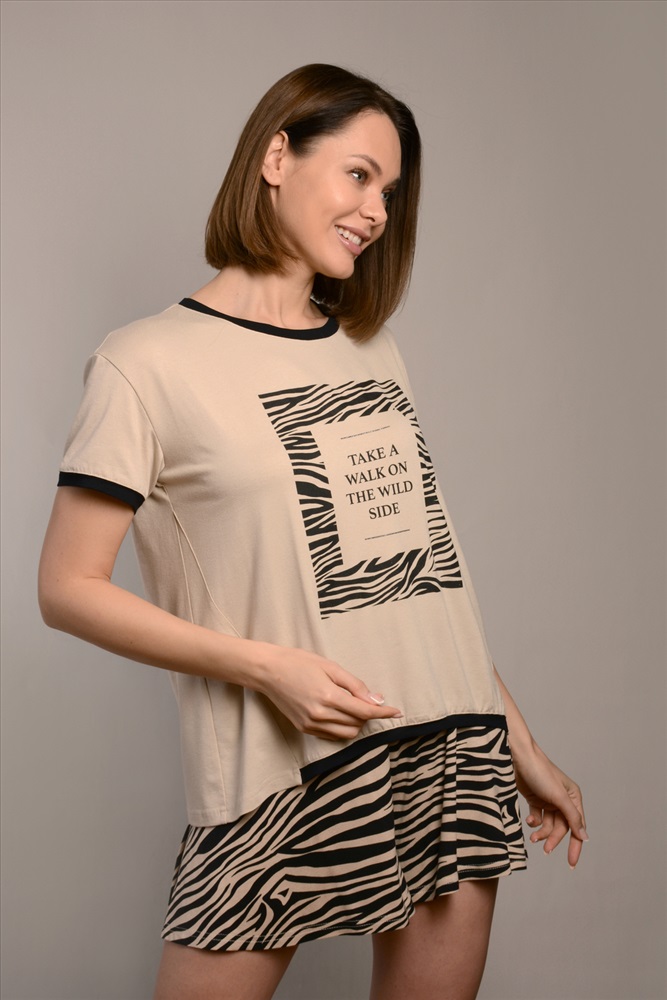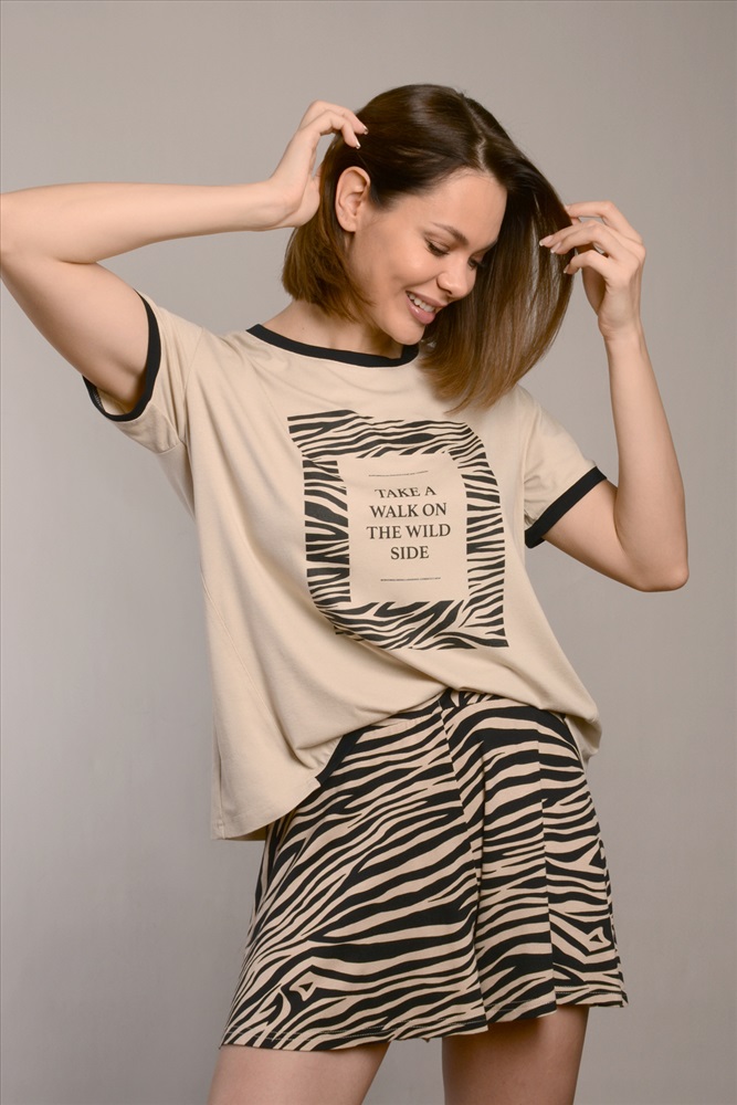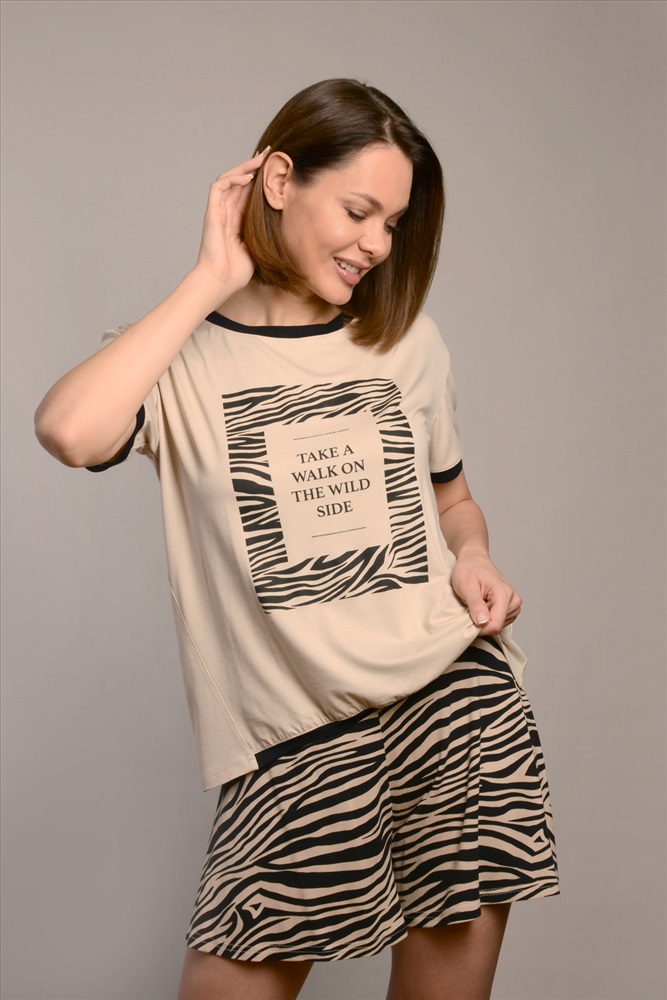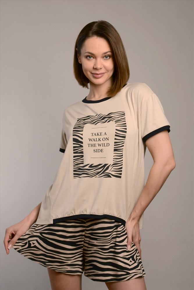 Застежка: без застежки Комплект с шортами из вискозного полотна. Футболка прямого силуэта, очень объемная с коротким рукавом и печатным рисунком имитирующим расцветку шорт. Шорты средней длины с коническим расширением к низу на притачном поясе с резинкой. Комплект выполнен в стиле ОВЕРСАЙЗ, рекомендуется брать на 1 размер меньше.