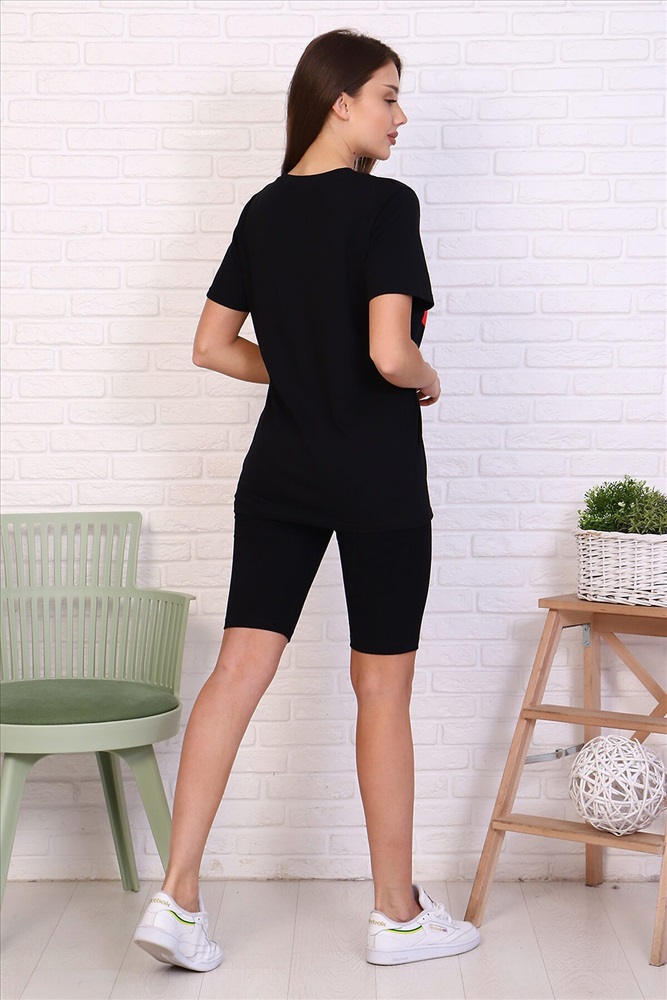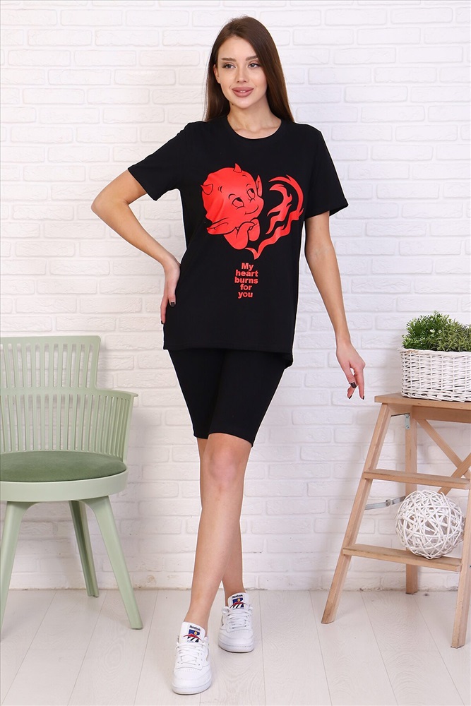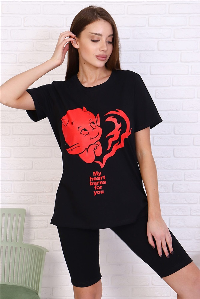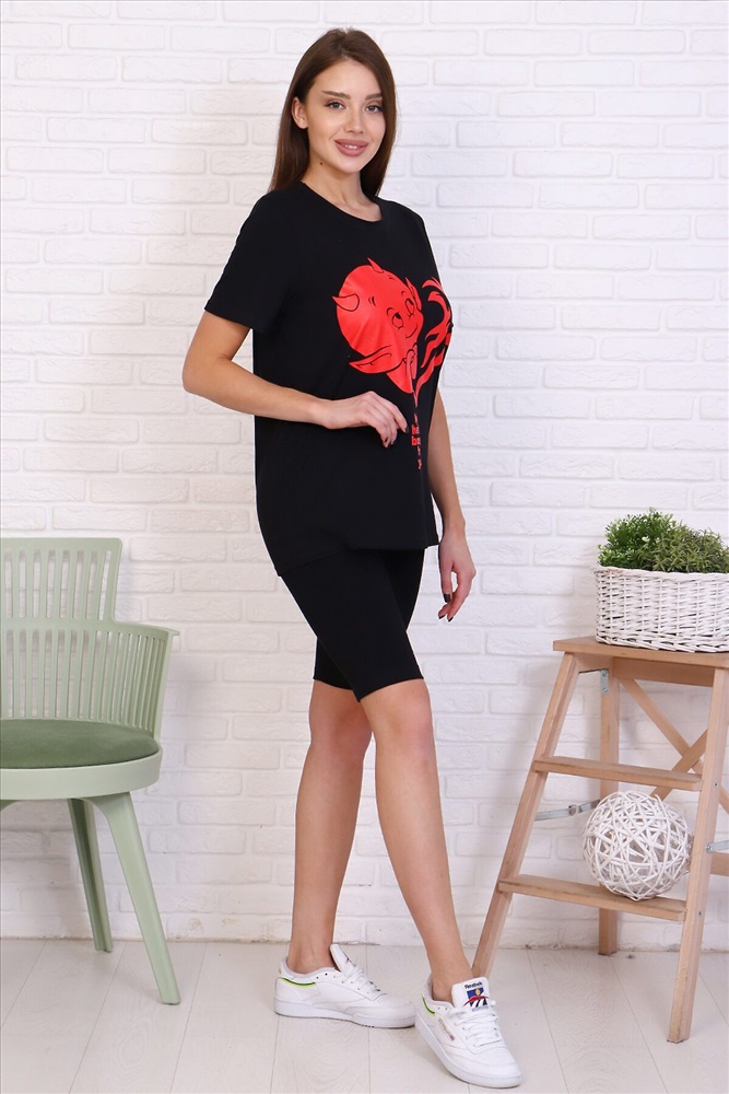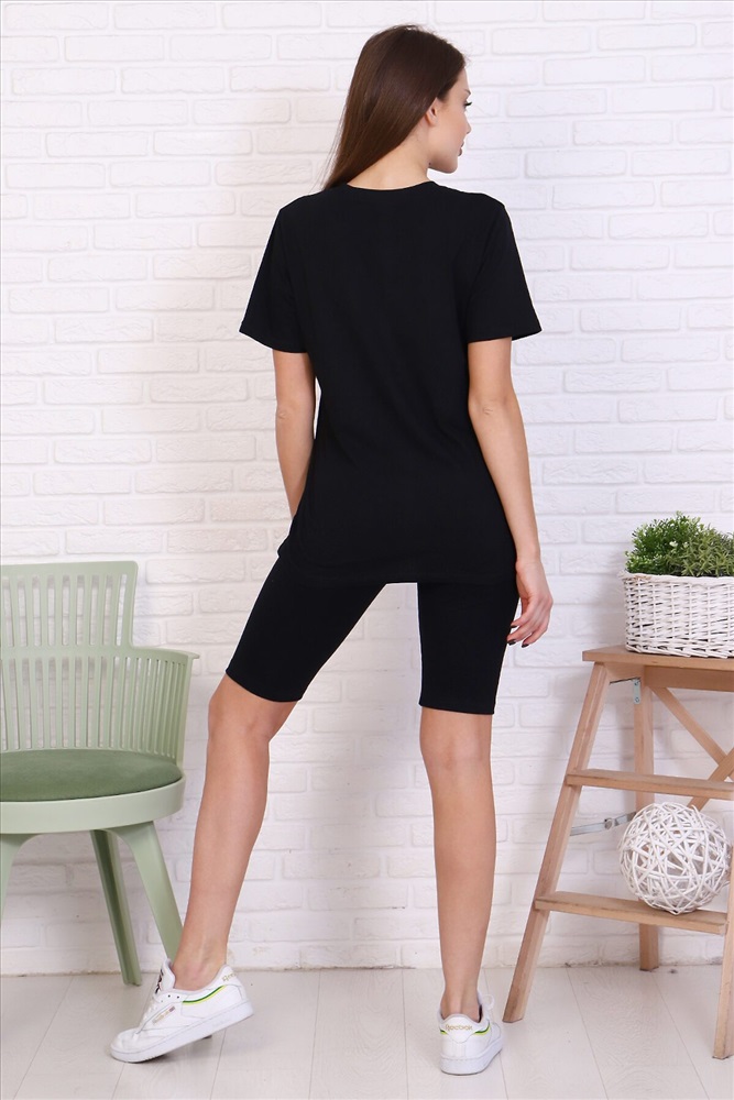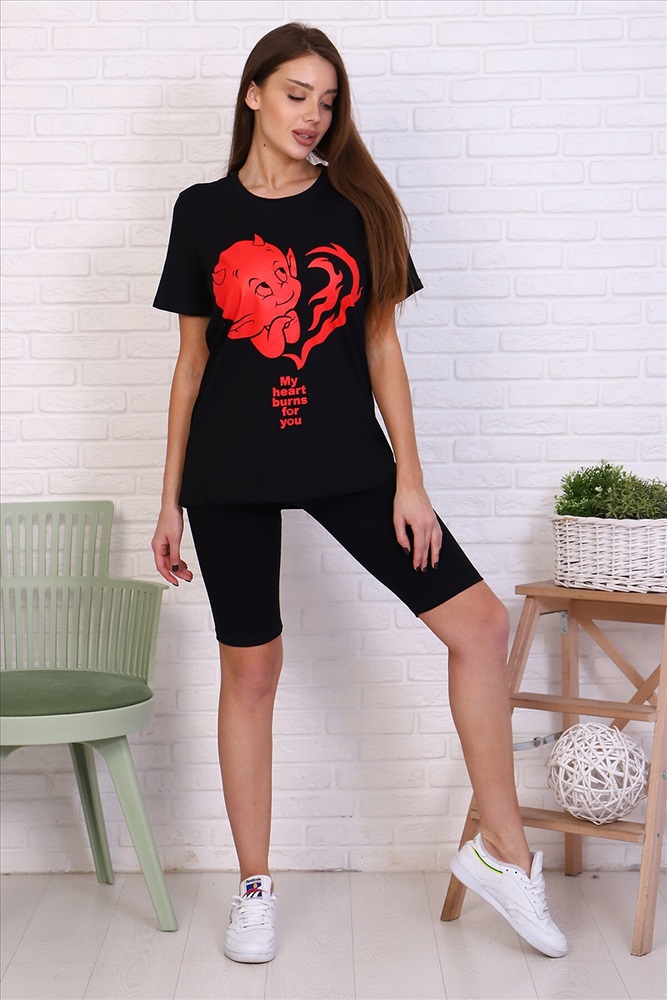 Молодежный костюм футболка и велосипедки. Футболка из кулирки 100% хлопок свободного кроя, стиль oversize, втачным коротким рукавом горловина округлой формы. На полочке изделия принт. Низ рукава и низ изделия подгибка. велосипедки из кулирки с лайкрой облегающего силуэта без бокового шва. Низ изделия подгибка.