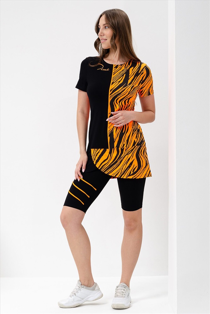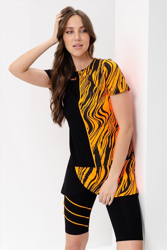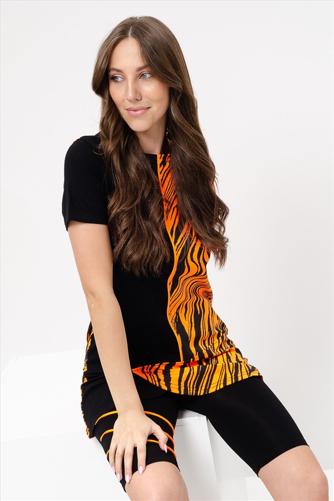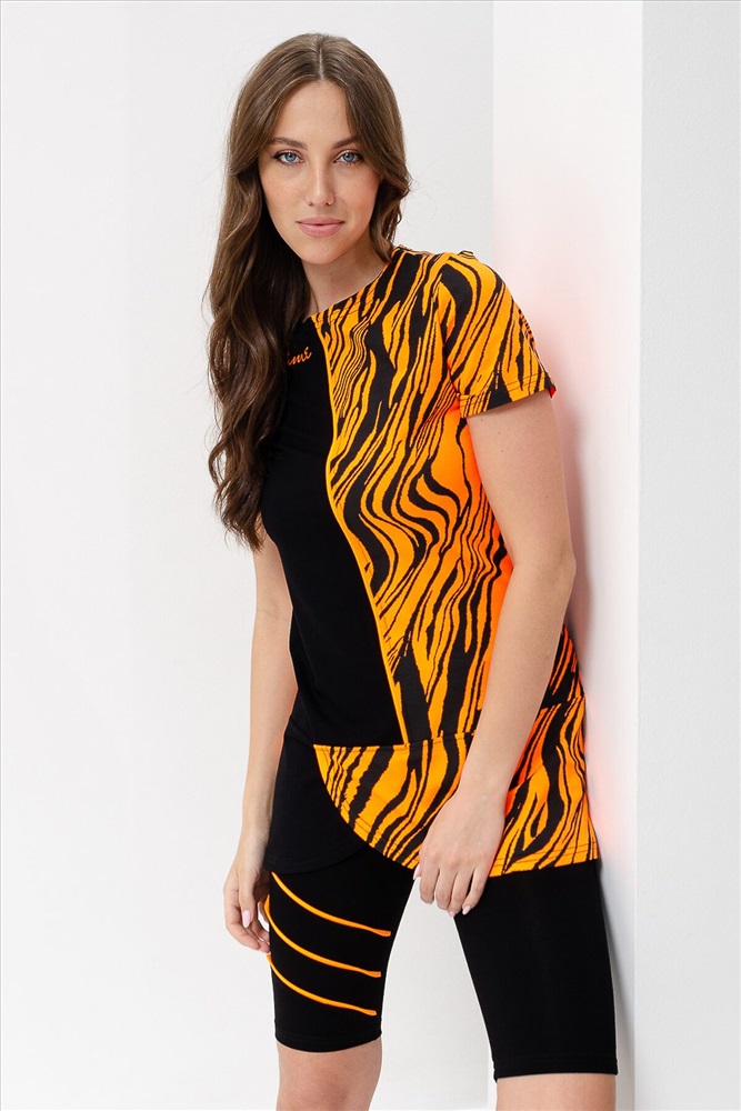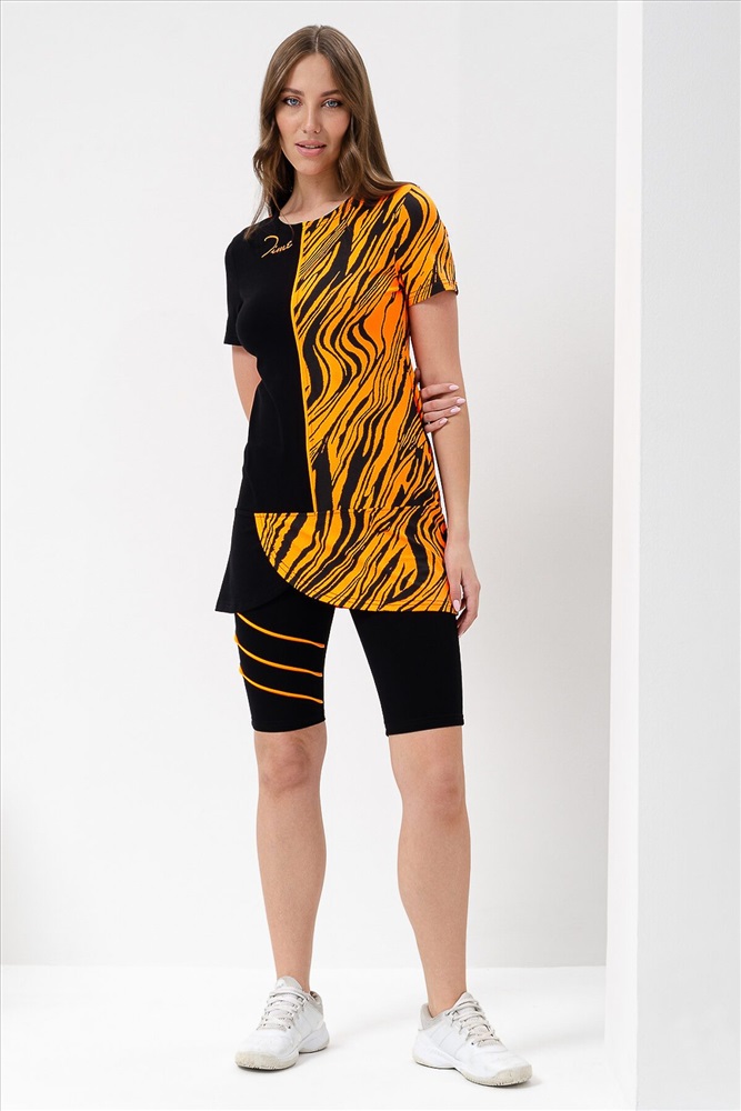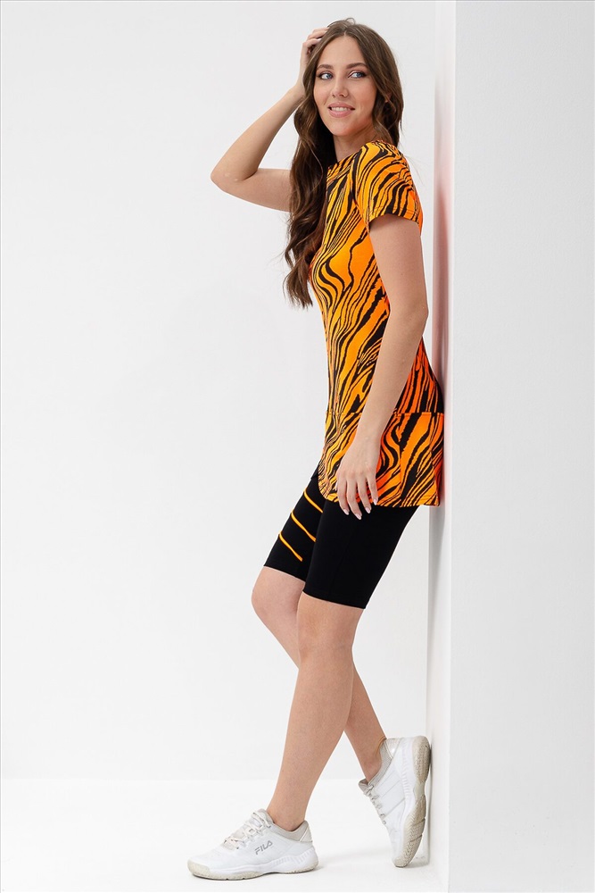 ID товара: 900489 Состав: Вискоза 92%, Лайкра 8%; Хлопок 95%, Лайкра 5% Сезон: Весна/Лето Длина: Средняя Фасон: Полуприлегающий Рукав: Короткий Крой брючин: Облегающий Рисунок: Абстракция Декоративные элементы: Принт Основная ткань: Вискоза Стиль: Спортивный Вид ткани: Кулирка с лайкрой, вискоза пенье Страна бренда: Россия Страна производства: Россия Костюм женский состоит из туники и велосипедок, туника полуприлегающего силуэта с принтом на полочке с коротким втачным рукавом, велосипедки с широкой эластичной резинкой на поясе с ярким кантом на передней половинке. Комментарии к товару