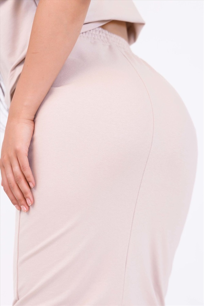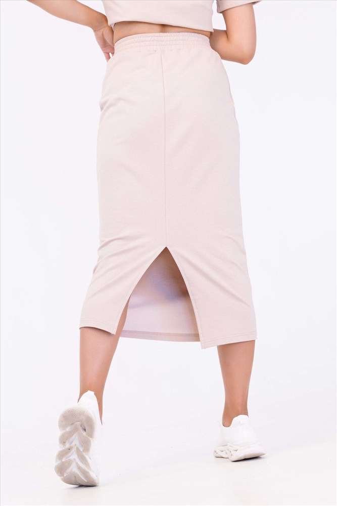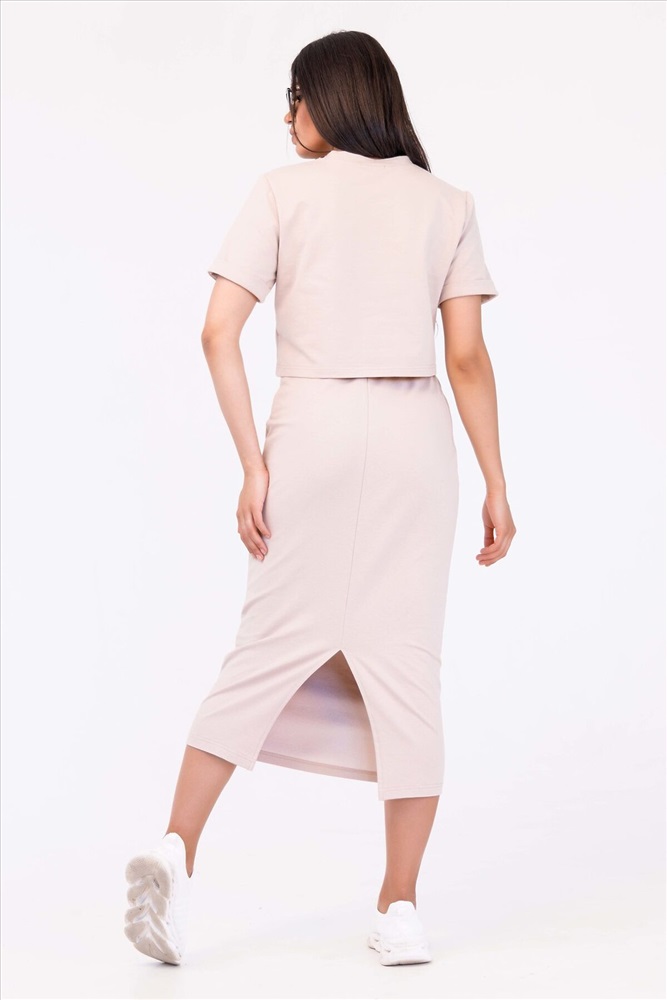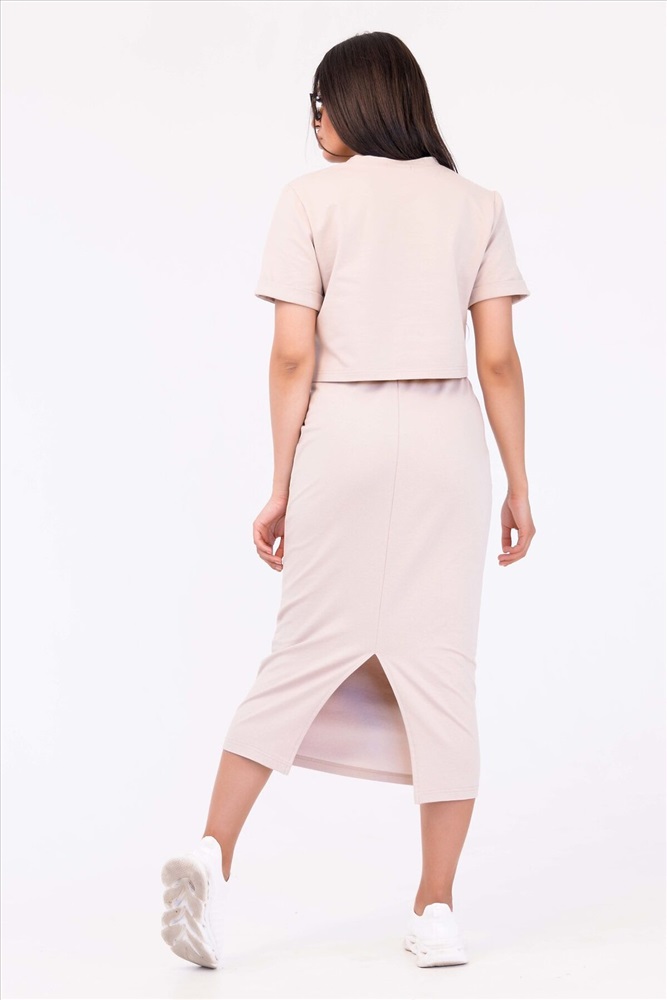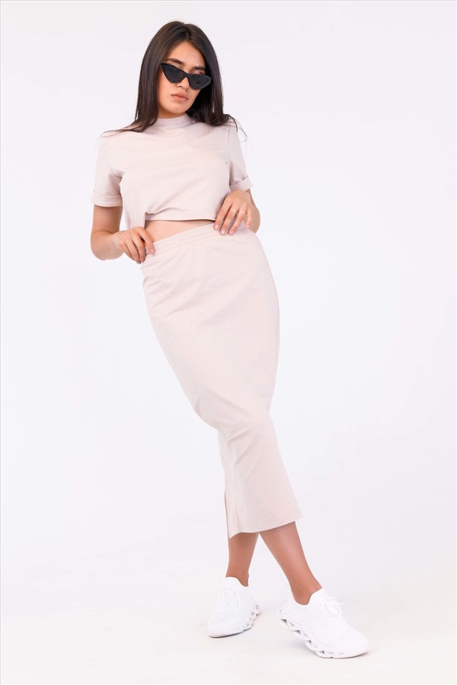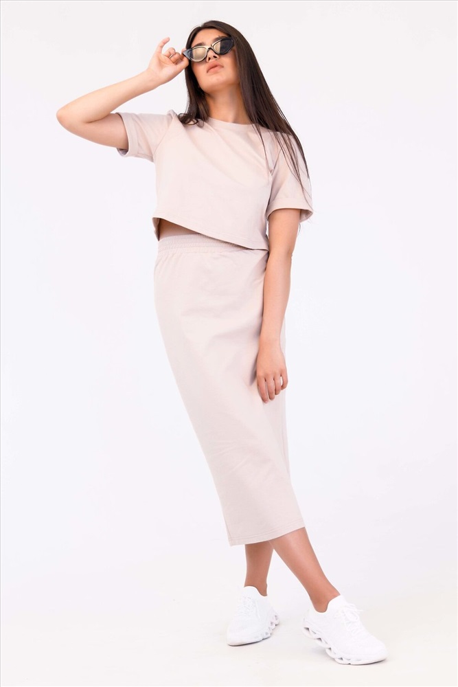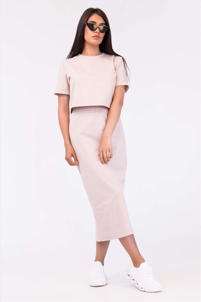Легкий летний комплект состоящей из юбки и топа. Юбка миди ниже колен, с разрезом сзади. Топ с декоративными отворотами на рукавах. Костюм выполнен из футера двунитки. Стильный трикотажный костюм для динамичной жизни. Отлично подойдет для теплой летней погоды, благодаря свободному крою укороченной футболки. Широкий пояс юбки длины миди комфортно сидит на талии, а для свободы движений, сзади идет разрез. Этот костюм - универсальное решение как для деловой встречи в офисе, так и загородной поездки или утреннего завтрака с друзьями. Будет отлично смотреться как с туфлями и босоножками на каблуке, так и с любимыми кедами или кроссовками. Рекомендуем носить комплект еще и по отдельности, сочетая с другими элементами гардероба и дополняя стильными аксессуарами.