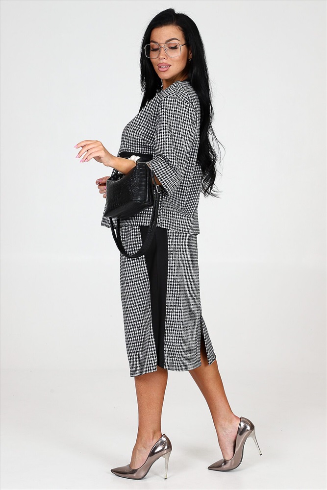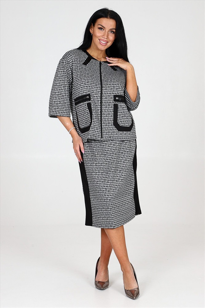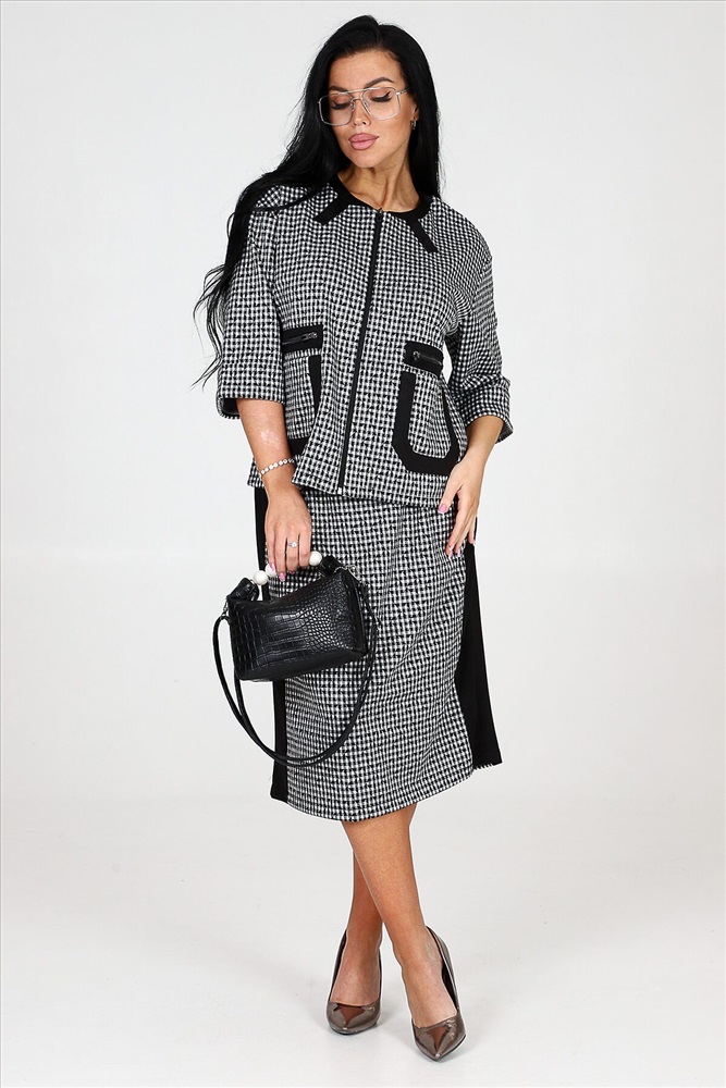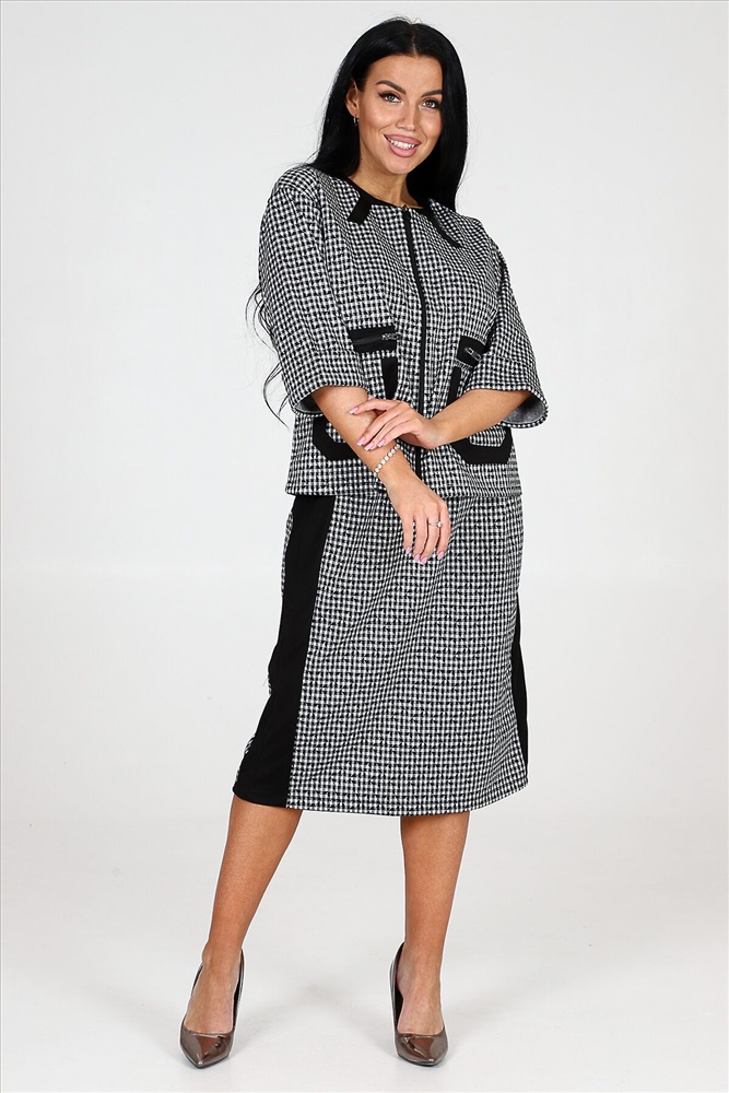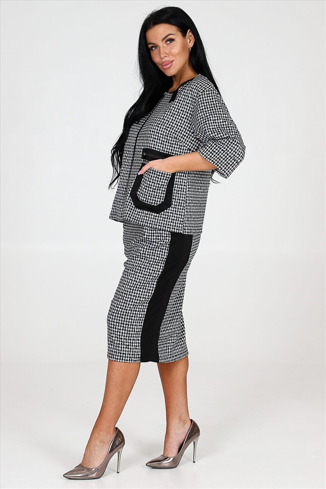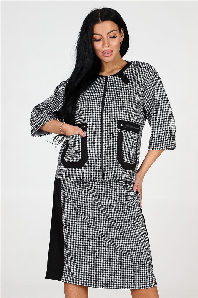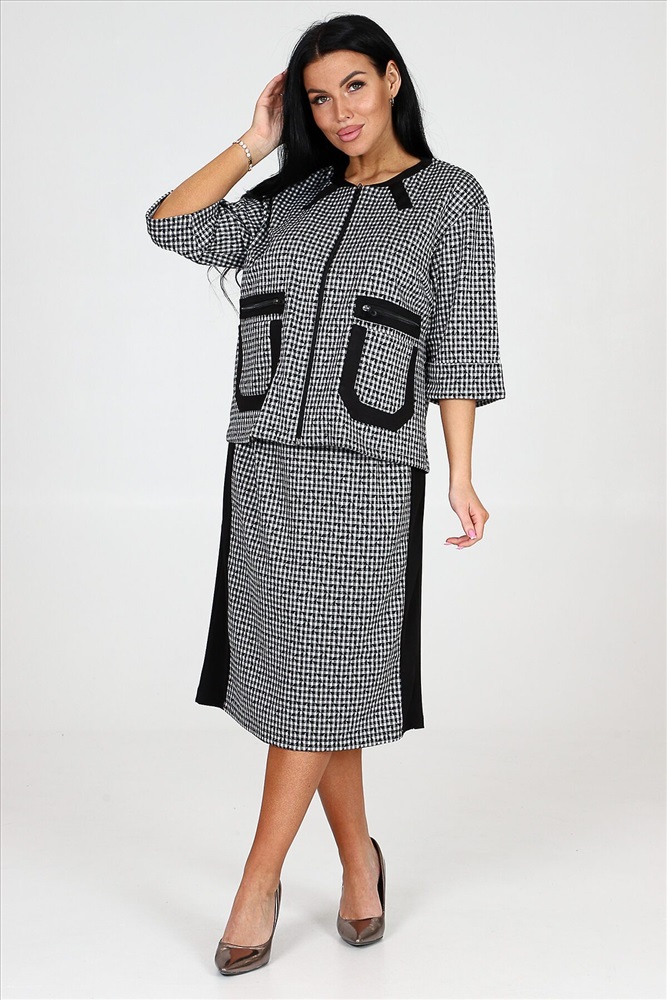 ID товара: 978292 Состав: 75% Полиэстер, 20% Вискоза, 5% Спандекс Сезон: Демисезон Длина: Средняя Фасон: Прямой Рукав: 3/4 Вид застежки: Молния Модель юбки/платья: Прямая Тип карманов: Накладные Основная ткань: Полиэстер Стиль: Деловой стиль Вид ткани: Академик Страна бренда: Россия Страна производства: Россия Костюм включает в себя прекрасный жакет на молнии и юбку прямого кроя. Жакет снабжен накладными карманами и эффектной накладной молнией, которая имитирует прорезной карман. Рукава костюма имеют длину три четверти и оформлены манжетами. Юбка прямая и оснащена молнией, а также имеет шлицу на нижней части изделия. Костюм дополнен черной отделкой на жакете и юбке, придавая ему особую изюминку. Костюм изготовлен из прочной и качественной ткани академик, которая состоит из 75% полиэстера, 20% вискозы и 5% спандекса. Это обеспечивает комфорт и свободу движений, а также сохраняет превосходный вид костюма после многочисленных стирок и износа. Комментарии к товару