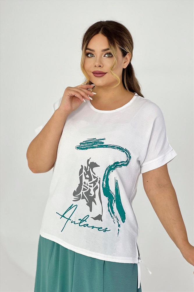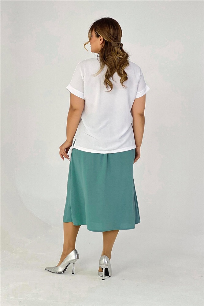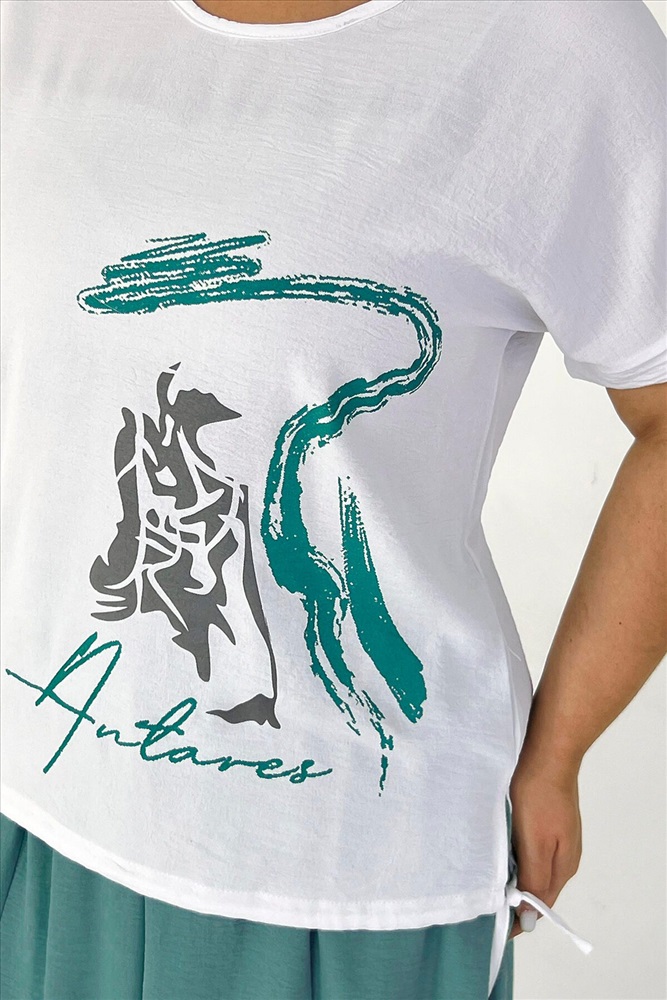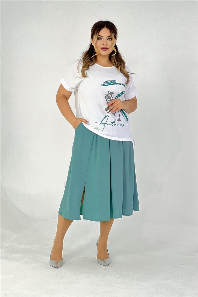 Женская двойка прямого силуэта. Верх комплекта в белом цвете с цветным принтом, короткий цельнокроеный рукав, низ футболки имеет свойство затягиваться, поэтому ее можно носить спущенную на юбку, а можно затянуть и оставить над ней, что подчеркнет вашу талию. Низ - свободная юбка двух цветов, с двумя разрезами снизу. Костюм повседневный и удобный, из легкой ткани сингапур, что хорошо для жаркого лета.