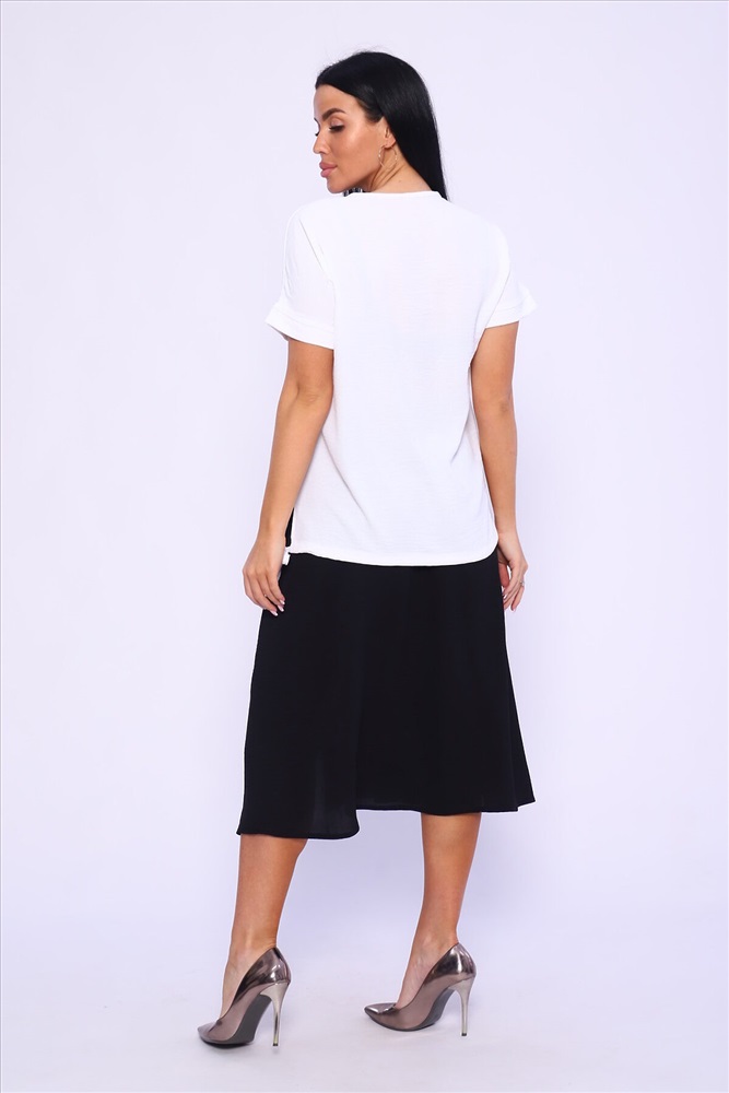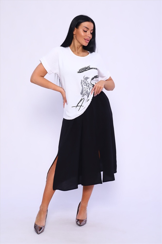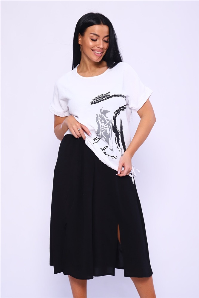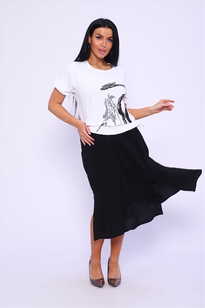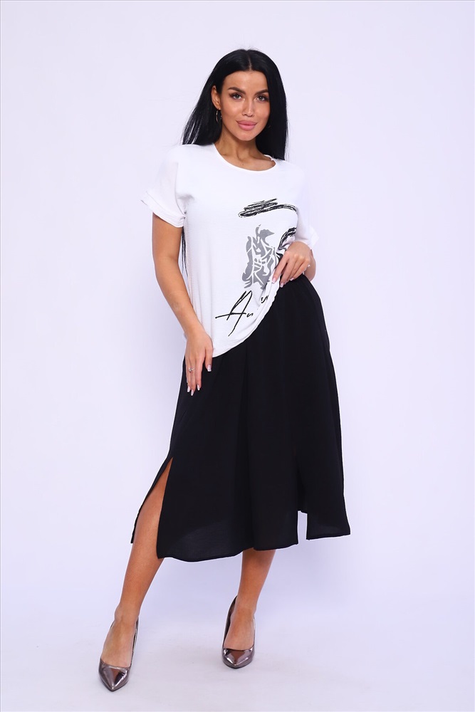 ID товара: 978156 Состав: 100% Полиэстер Сезон: Весна/Лето Длина: Средняя Фасон: Свободный Рукав: короткие Модель юбки/платья: Трапеция Рисунок: Фантазийный Декоративные элементы: Принт Основная ткань: Хлопок Стиль: повседневный Вид ткани: Сингапур Страна бренда: Россия Страна производства: Россия Женская двойка прямого силуэта. Верх комплекта в белом цвете с цветным принтом, короткий цельнокроеный рукав, низ футболки имеет свойство затягиваться, поэтому ее можно носить спущенную на юбку, а можно затянуть и оставить над ней, что подчеркнет вашу талию. Низ - свободная юбка двух цветов, с двумя разрезами снизу. Костюм повседневный и удобный, из легкой ткани сингапур, что хорошо для жаркого лета. Комментарии к товару