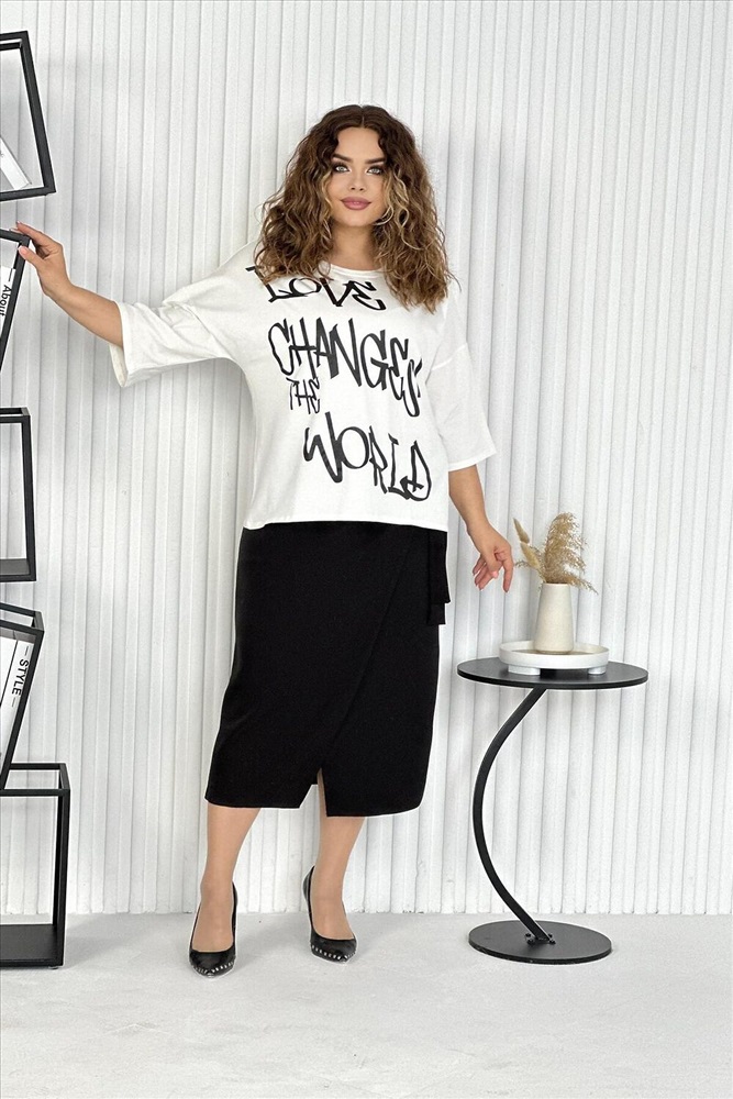 Женский костюм, верх - кофта свободного покроя оверсайз из легкой ткани супрем, рукав 3/4, округлая горловина, с принтом на передней полочке. низ - юбка ткань барби, на запах, застежка - пуговица внутри и завязки снаружи. Стильное и женственное дополнение для вашего гардероба, подойдет для повседневной носки, на праздник и на работу.