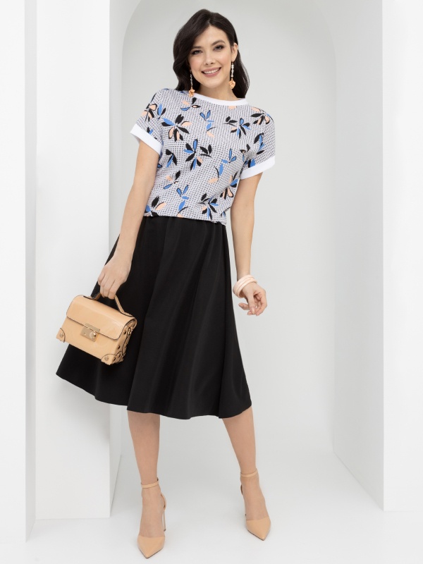 Состав: Трикотаж «ниагара», «пикачу» (95% п/э, 5% спандекс) Длина: Миди Дополнительный цвет ткани: Черный Вырез горловины: круглый Основной цвет ткани: Разноцветный Отрезная талия: Есть Подклад: Есть Резинка по талии: Есть Вид принта: Однотонный, цветочный Комментарии к товару