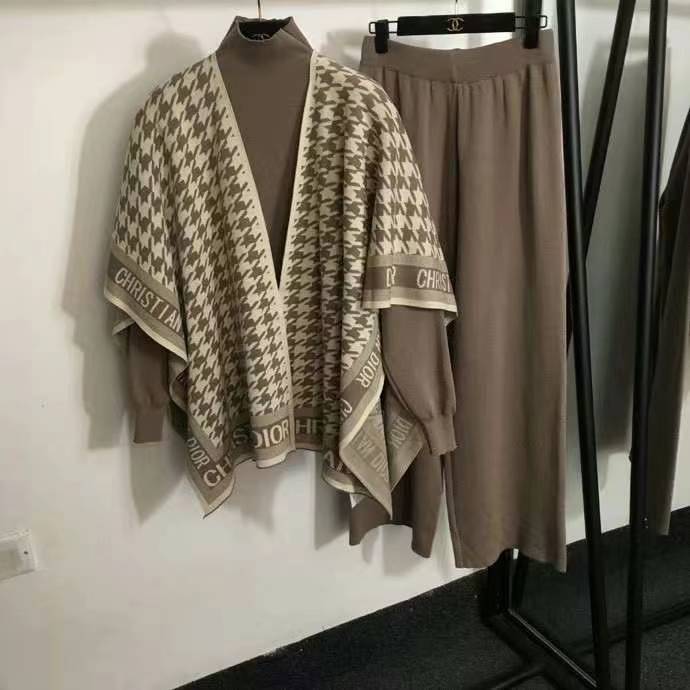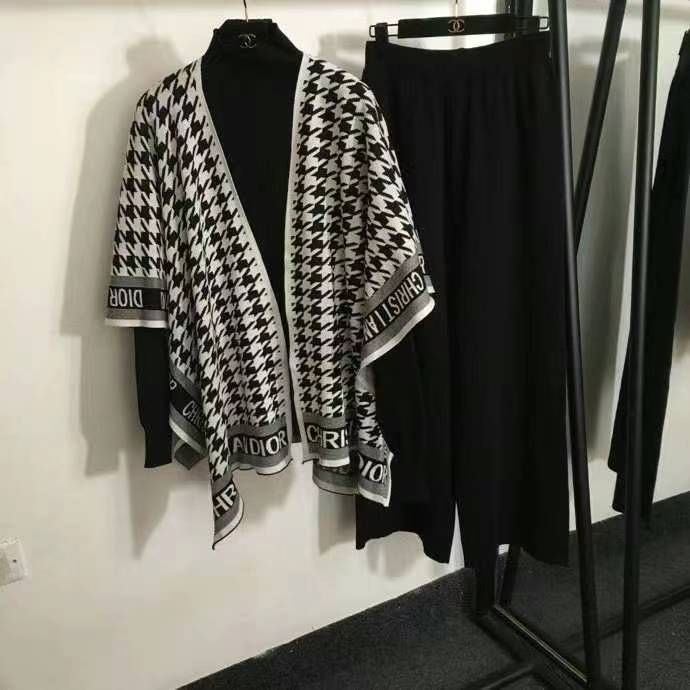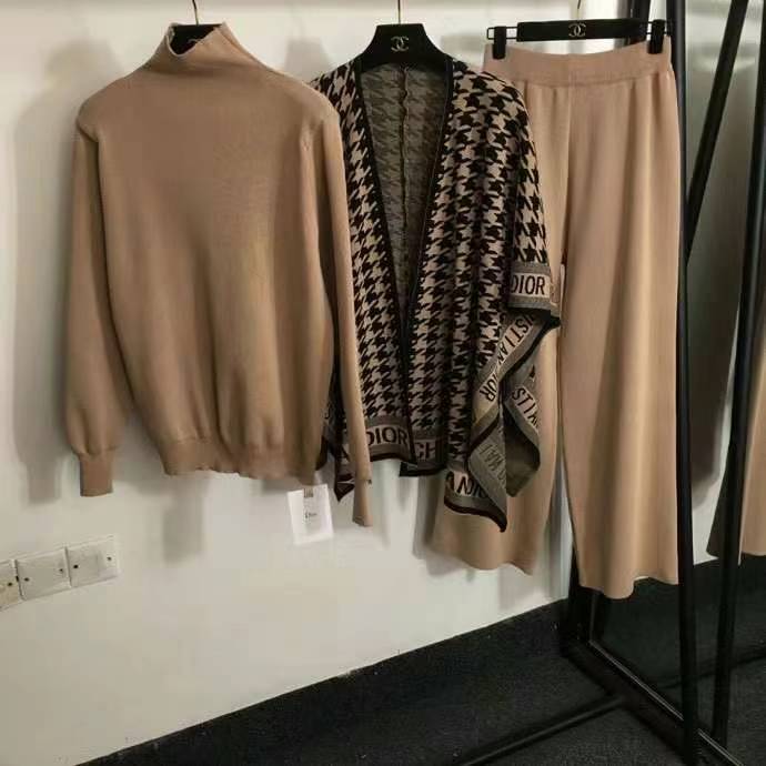 новый вязаный костюм-тройка, свитер с длинными рукавами и полуводолазкой + вязаная шаль «гусиные лапки» + широкие брюки с высокой талией, цвета хаки, абрикоса, серого, черного цвета, [один размер подходит всем; ширина плеч 37, Обхват груди 100, длина рукава 60, длина платья 61, талия 62, длина на резинке 104]
