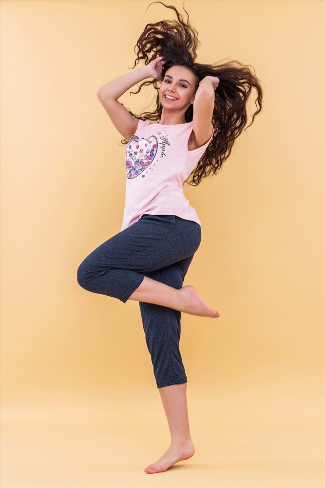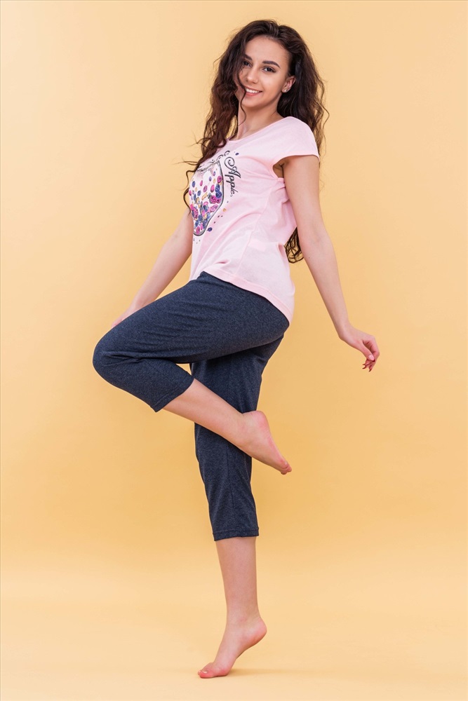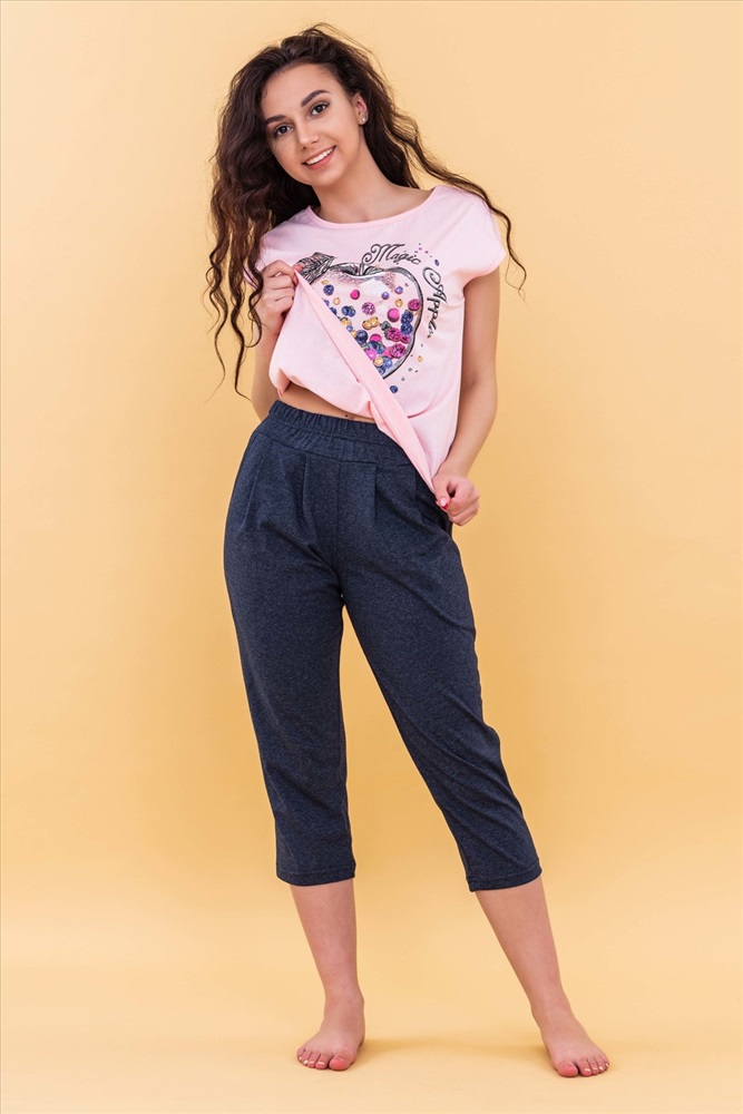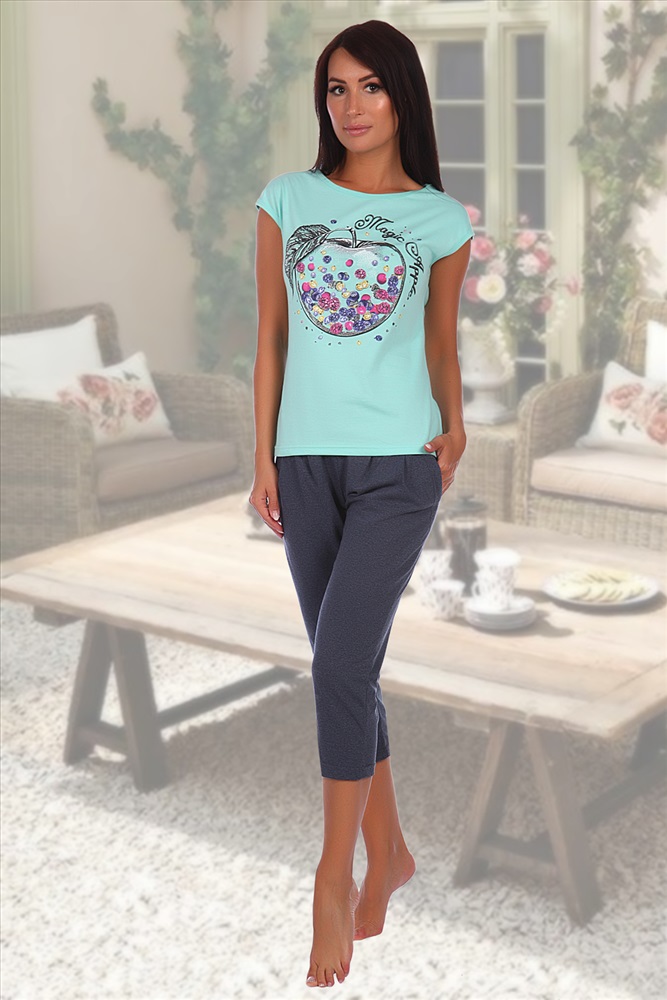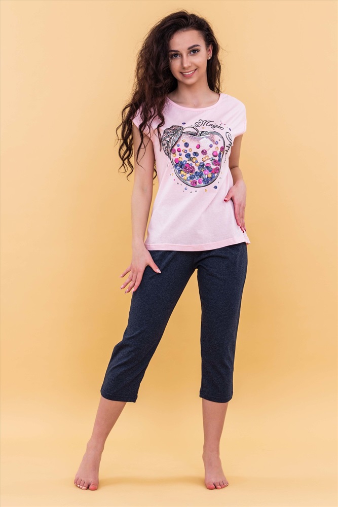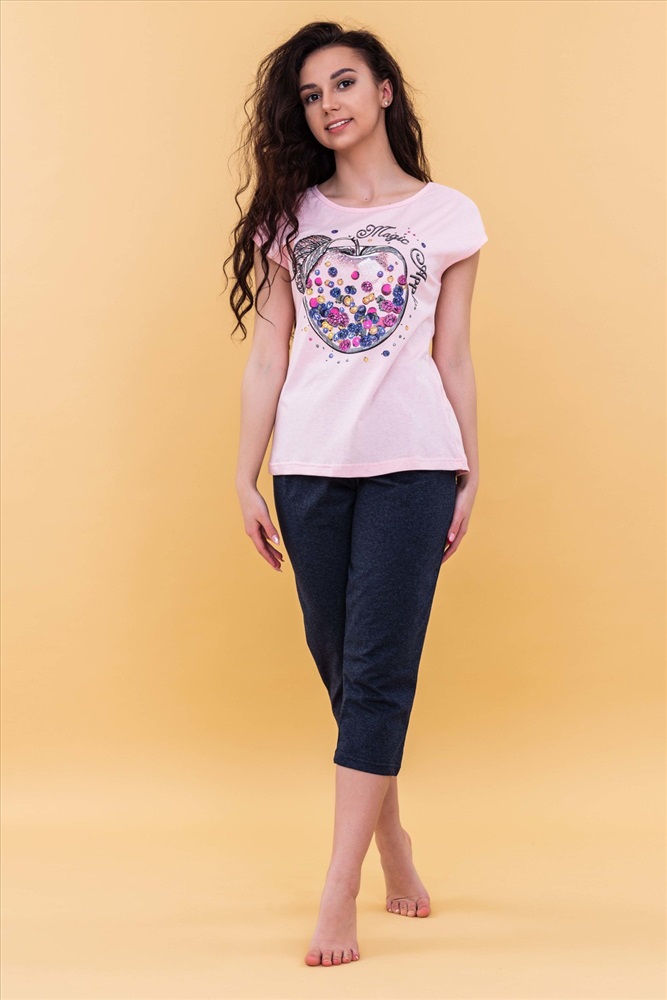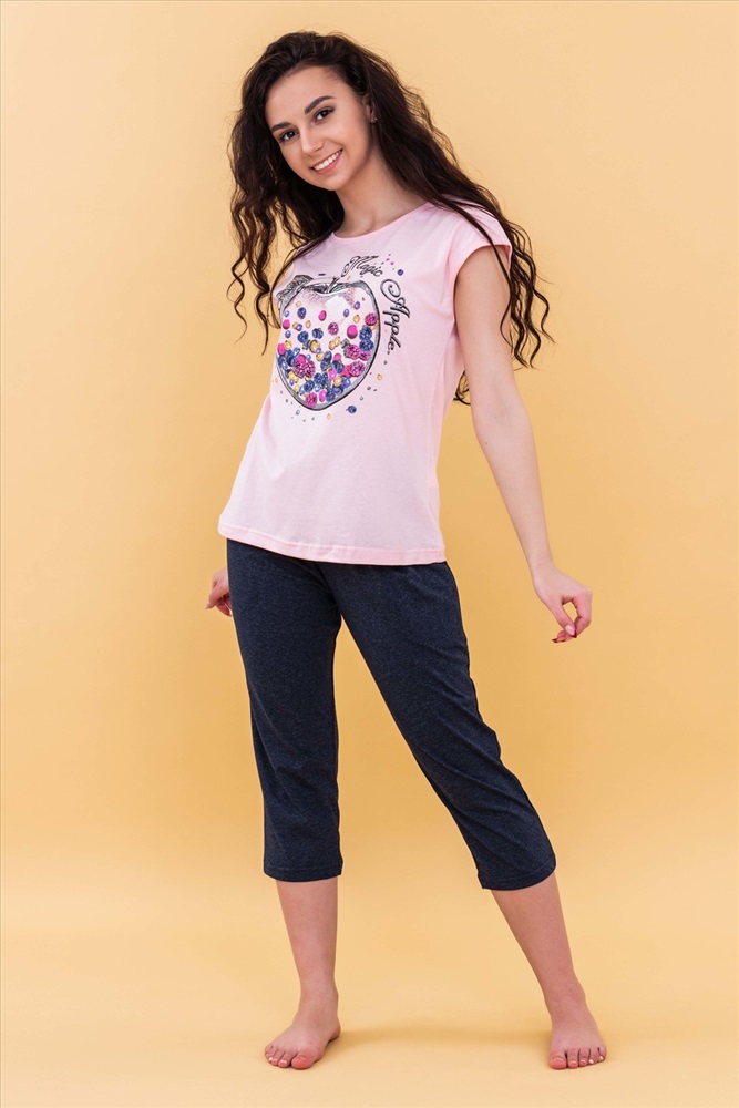 Состав: верх - 100% хлопок, низ - 50% хлопок, 50% п/э Модель: Костюм Яблоко Тип товара: костюм с бриджами Материал: кулирка | кулирка Бренд: Натали Суслова Карман: боковые Назначение: для дома НДС: 5% Особенности: на резинке Отделка: с печатью Посадка: высокая посадка Рейтинг: Рейтинг 4 и выше Рисунок: фуд-принт | разное Рукав: короткий рукав Сезонность: лето | весна Силуэт: полуприлегающий Стиль: домашний | молодежный Воротник: без воротника Застежка: без застежки Костюм универсален: его можно носить дома, на любимой даче и как на дневной променад. Бриджи-капри заужены к низу, на поясе с широкой простроченной резинкой 3см. Свободный крой на уровне бёдер и живота, благодаря кокетке на поясе и складкам. Длина до середины икры. Благодаря хорошему составу 50% х\б и 50% п\э бриджи не растянутся на коленях. Футболка оформлена полноцветной печатью, поэтому ягоды кажутся натуральными. Горловина-лодочка. Очень удобный крой. Оттенок ткани бриджей может отличаться от представленного на фото Таблица размеров и веса