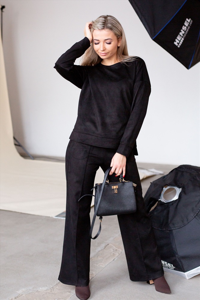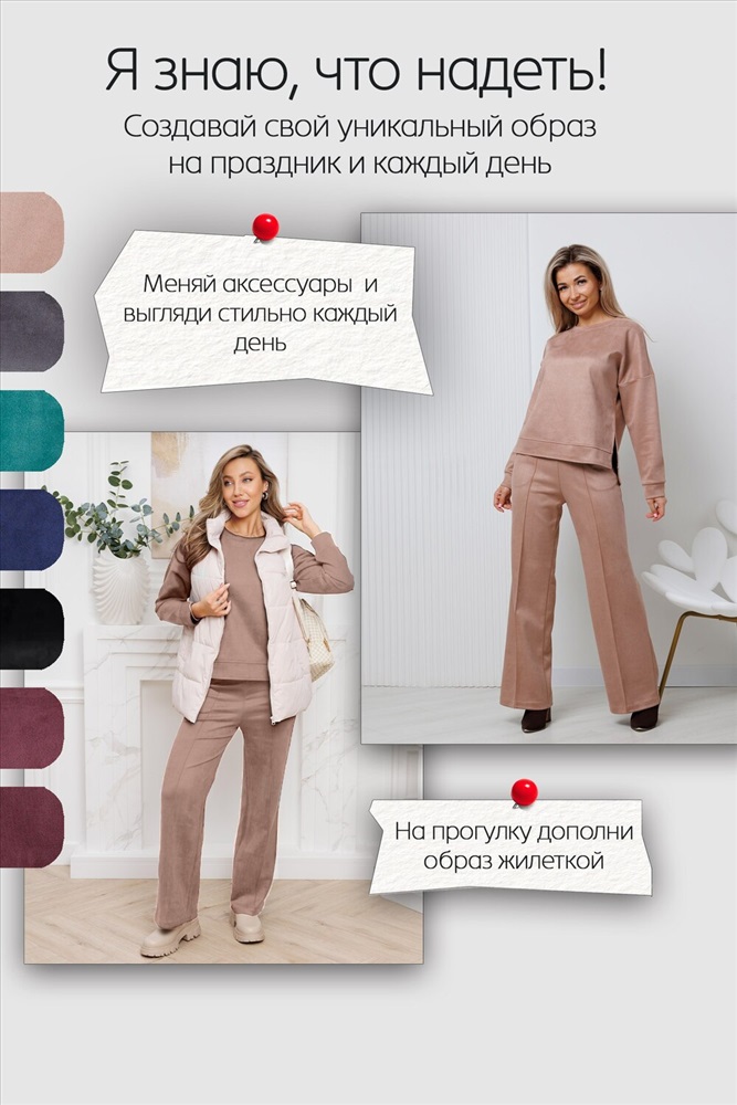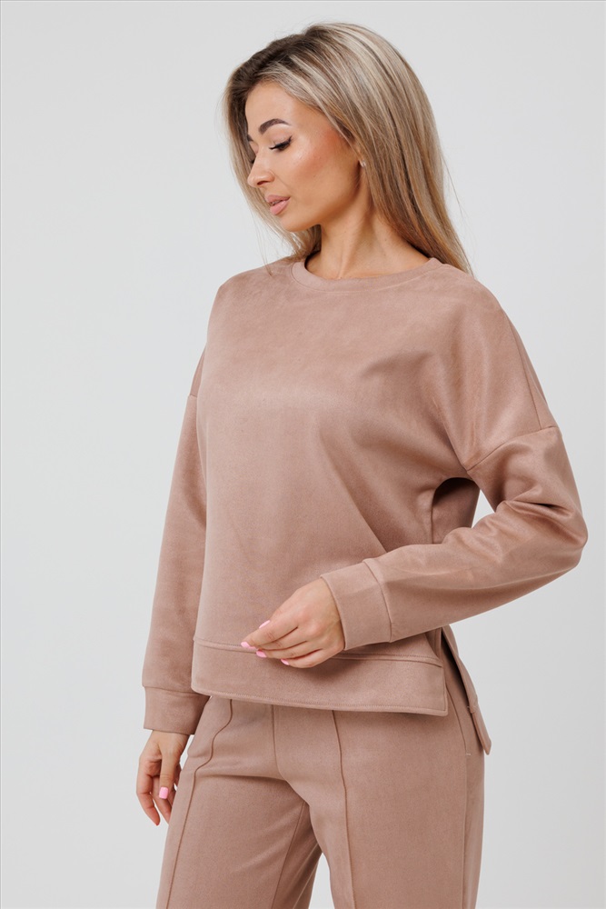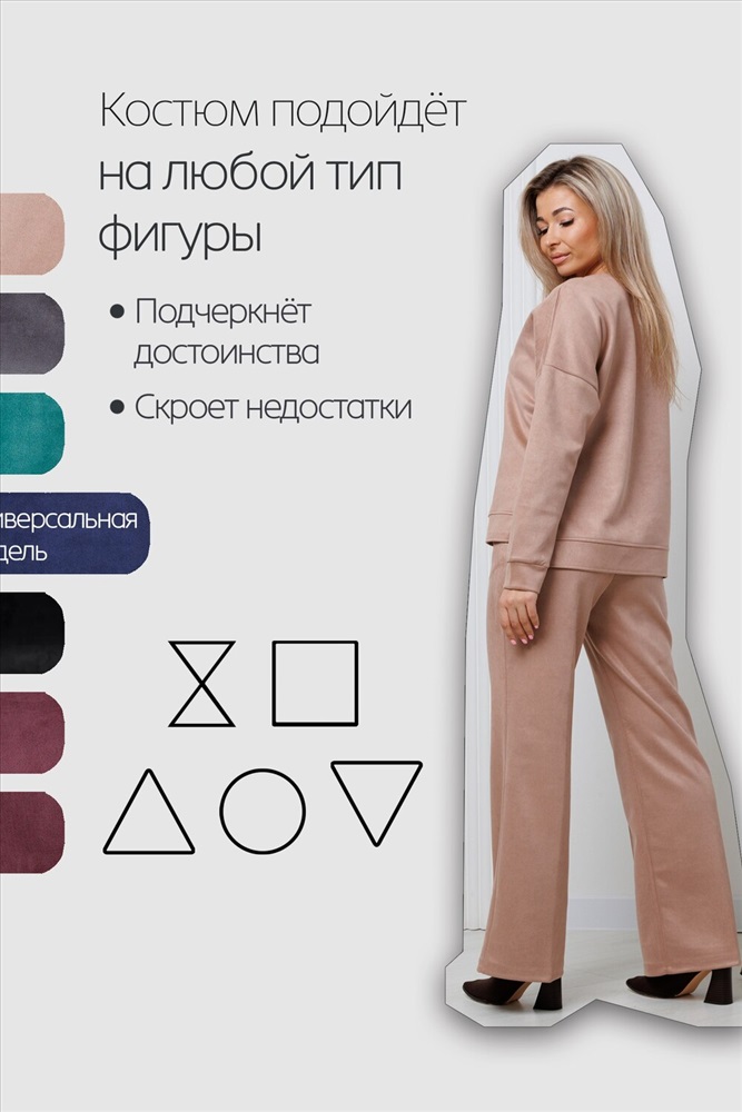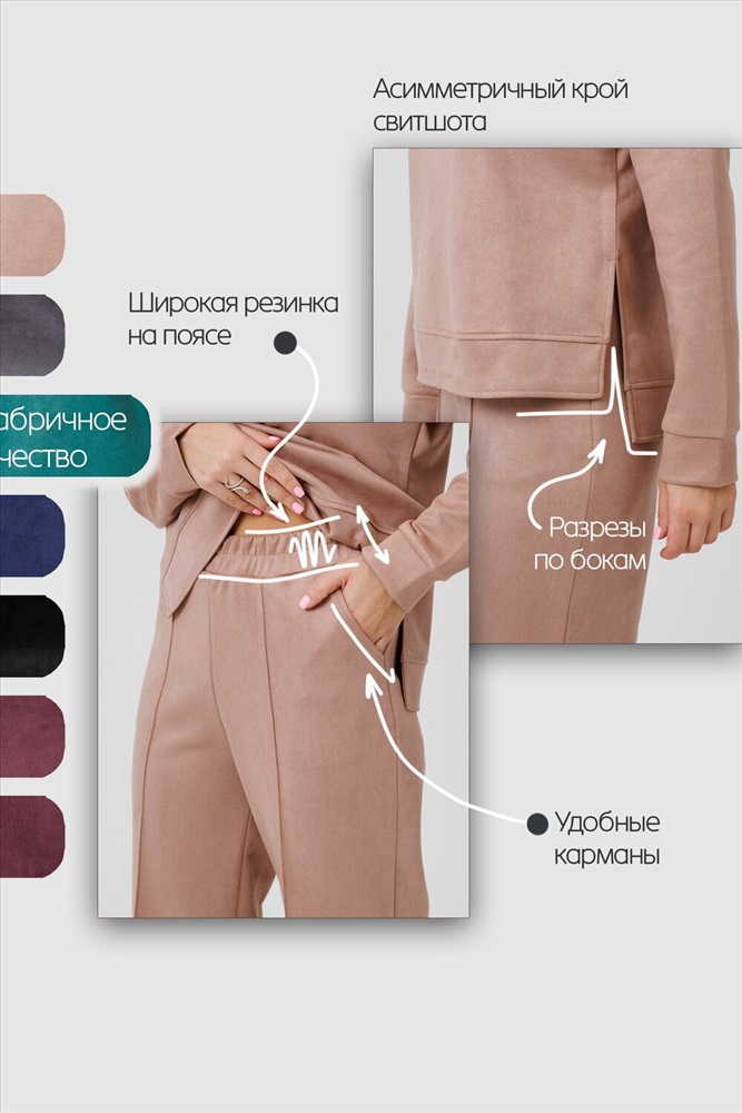 Женский брючный замшевый костюм от российского производителя бренда женской одежды. Невероятно мягкий, удобный теплый комплект из замшевого материала приятного к телу в составе лонгслива и свободных брюк палаццо. Свитшот с длинным рукавом, округлым вырезом горловины. Разрезы по боковым швам кофты и асимметричный крой верха с удлиненной спинкой. Прямые брюки с широкой резинкой на поясе, карманами с отрезным бочком и эффектными отстроченными стрелками по фасаду изделия стойнят силуэт. Необычное дизайнерское решение позволило совместить элегантную классику и эффектный стиль.