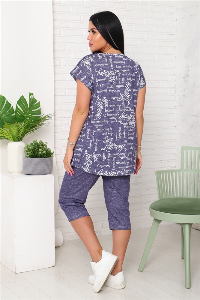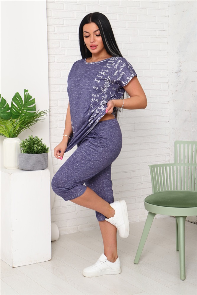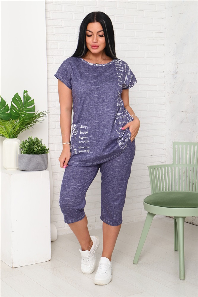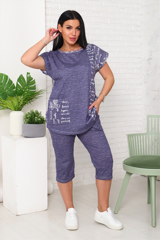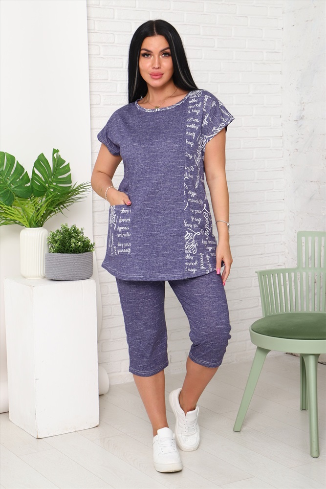 Застежка: без застежки Костюм женский футболка и бриджи. Футболка со спущенным плечом и накладным карманом, низ футболки фигурный. Бриджи с карманами.