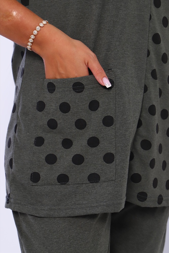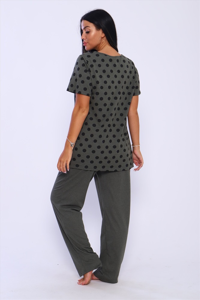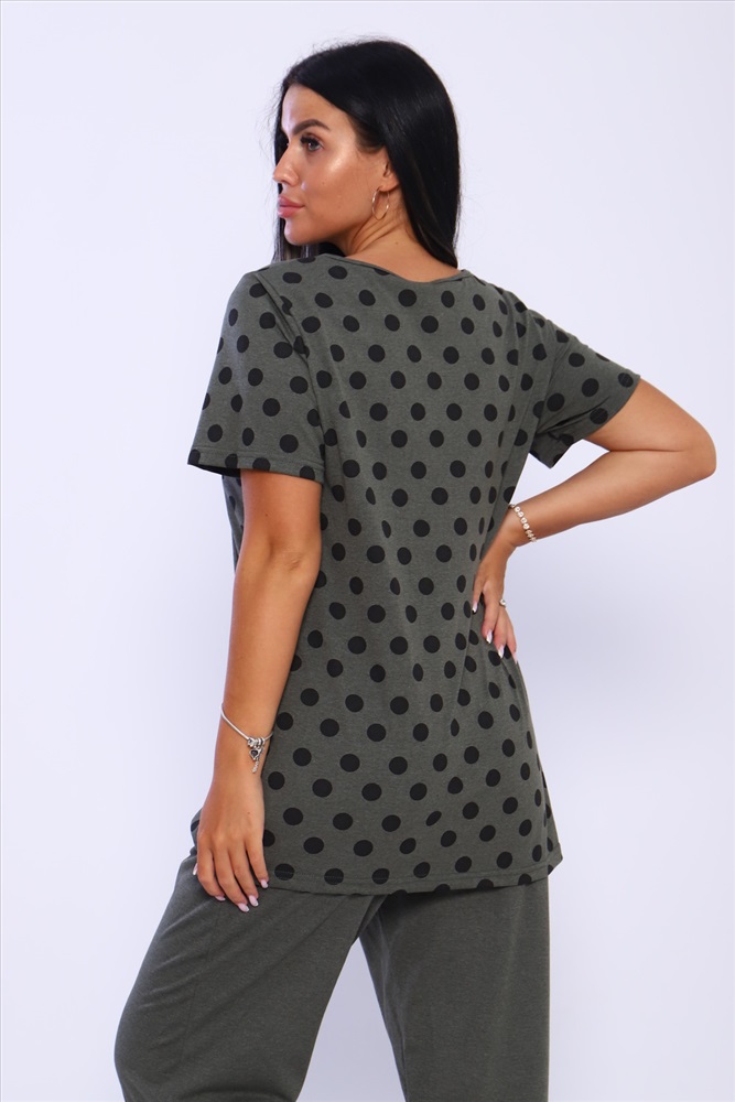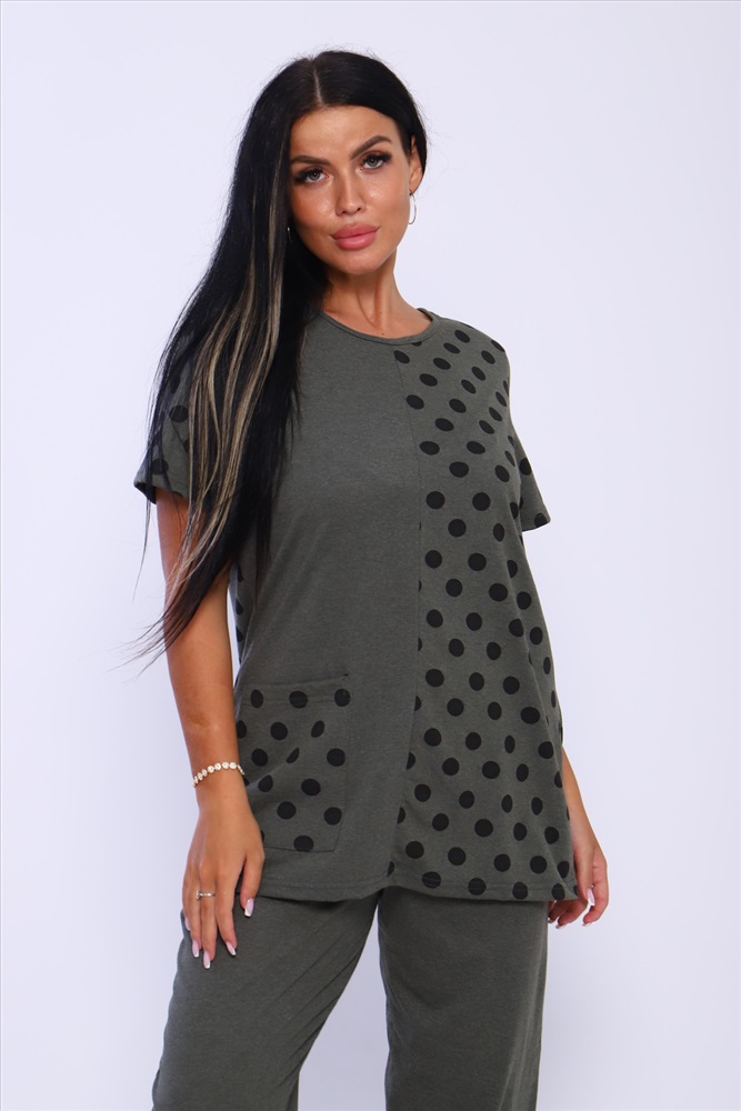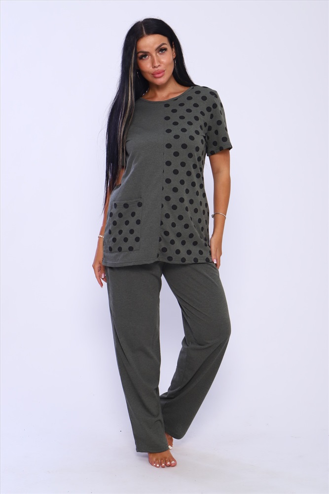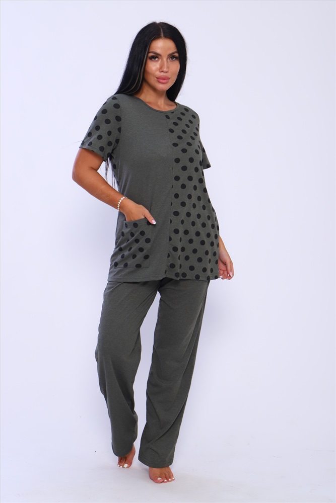 Застежка: без застежки Домашний костюм женский с брюками. Футболка полуприлегающего силуэта с карманом. Рукав короткий. Брюки прямого кроя на резинке.
