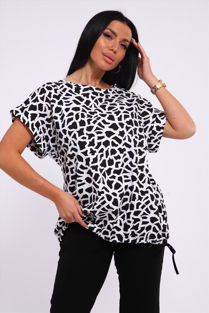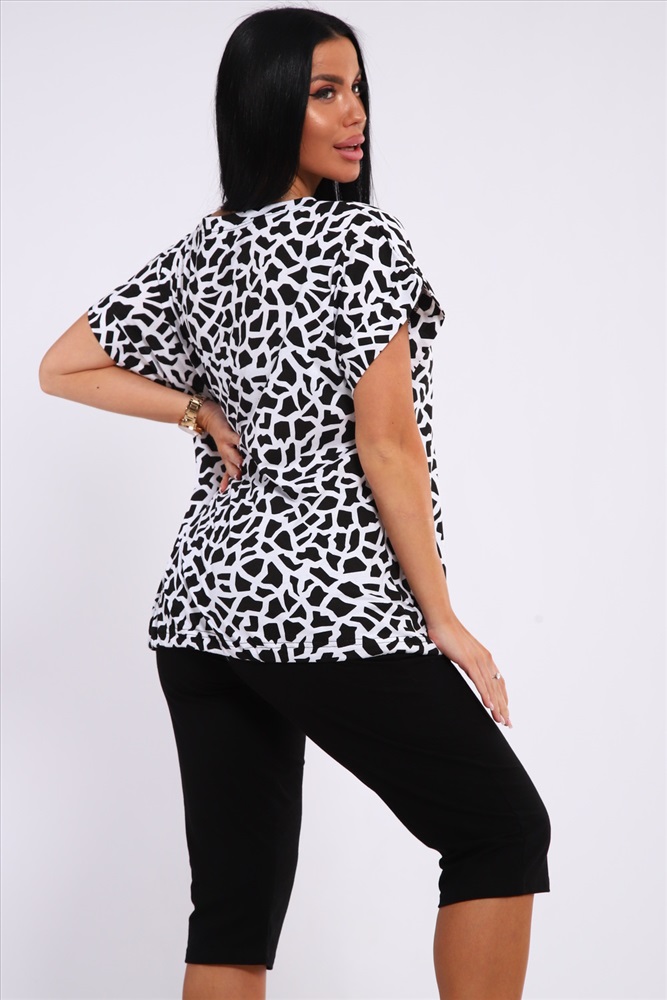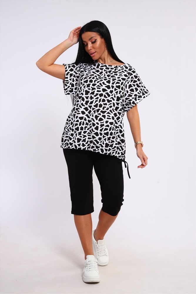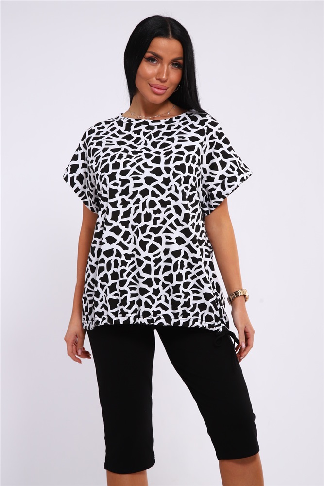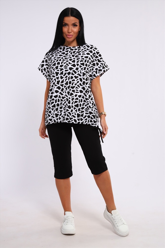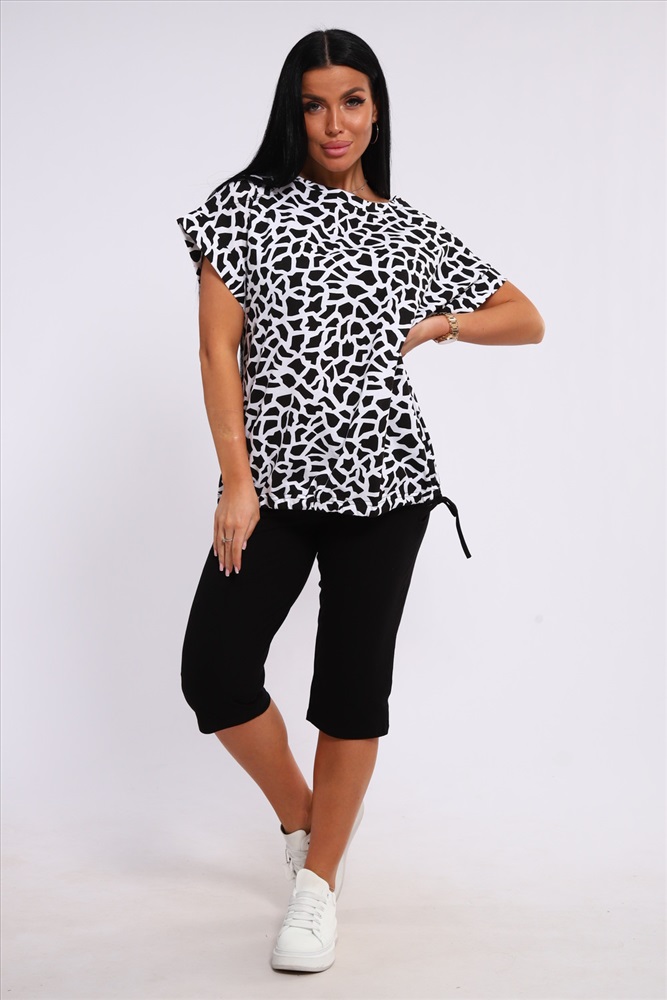 Застежка: без застежки Костюм футболка и бриджи. Футболка свободного кроя, плечо спущенное с манжетом, низ на завязках. Бриджи на резинке