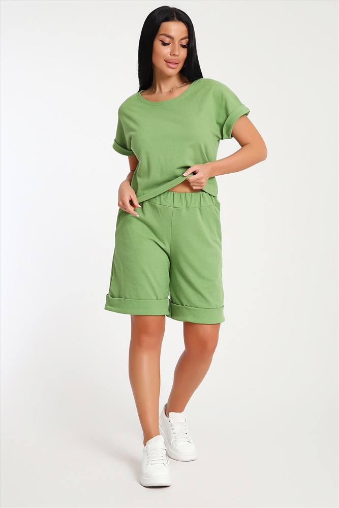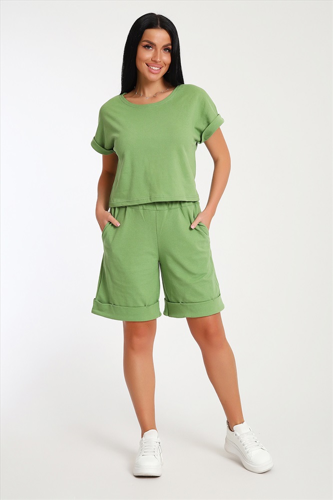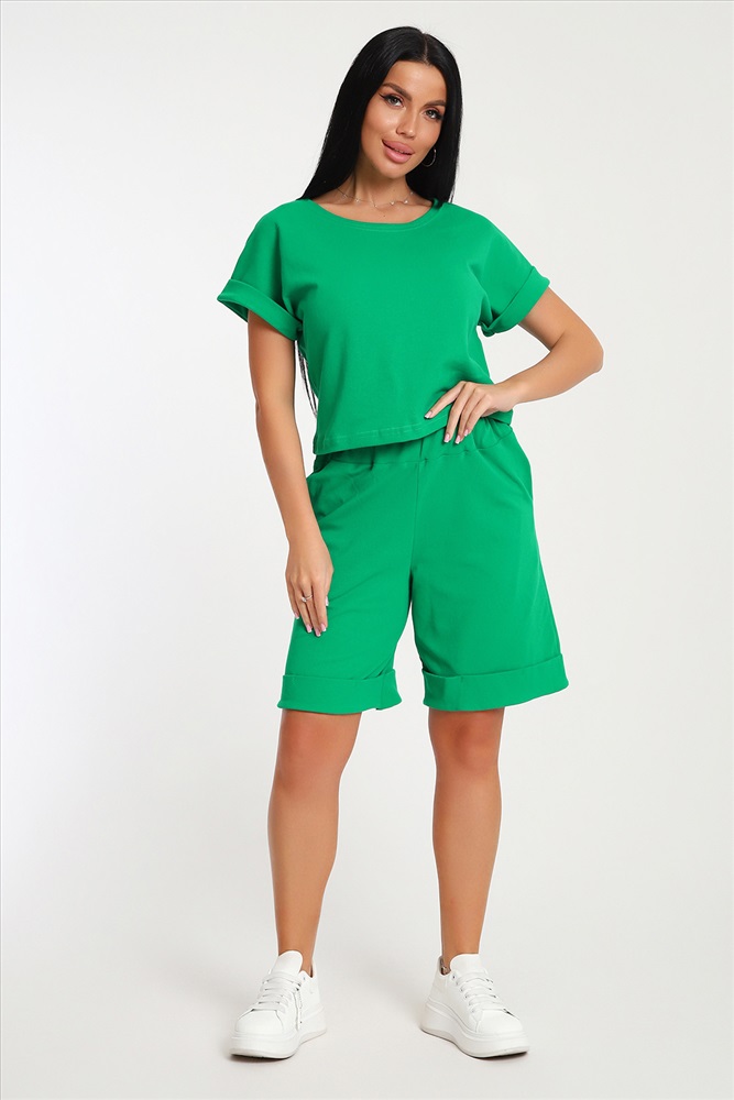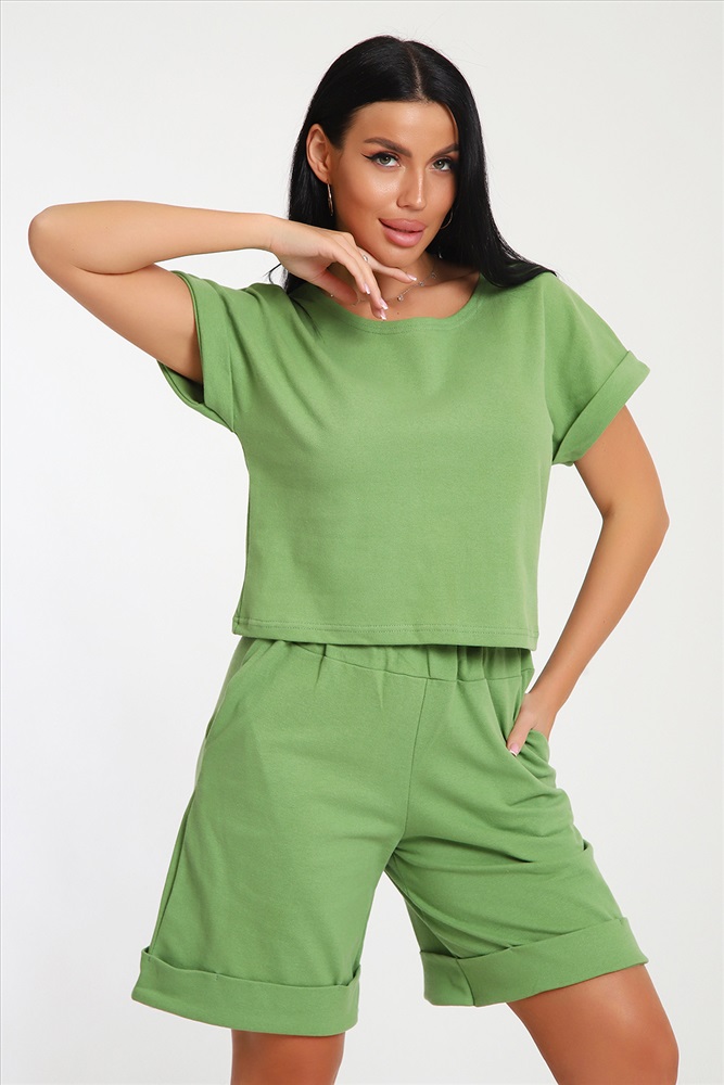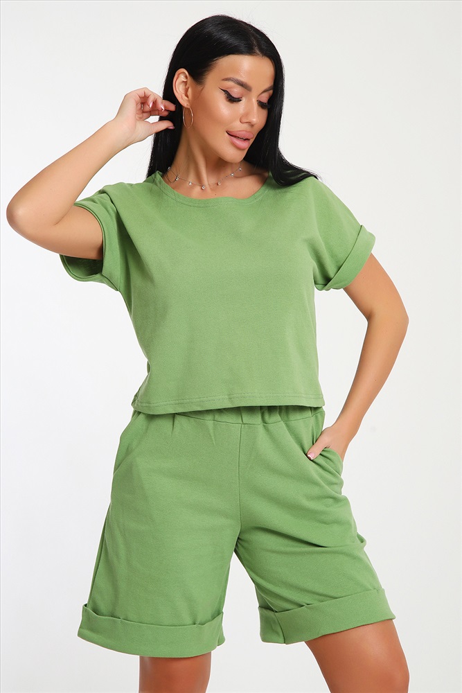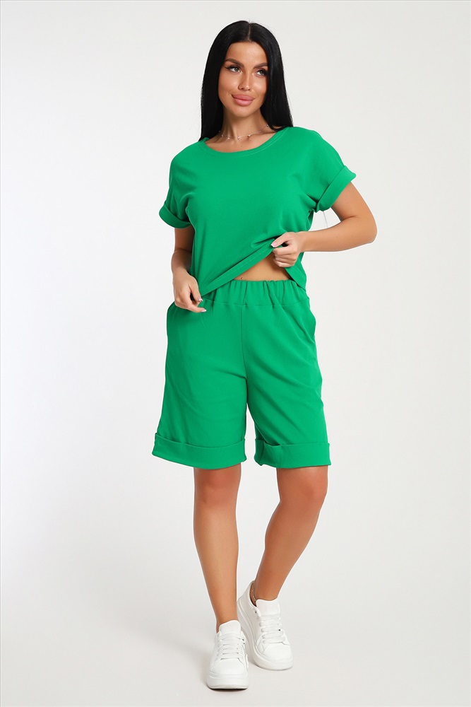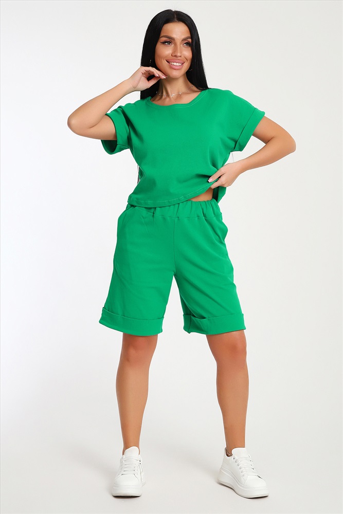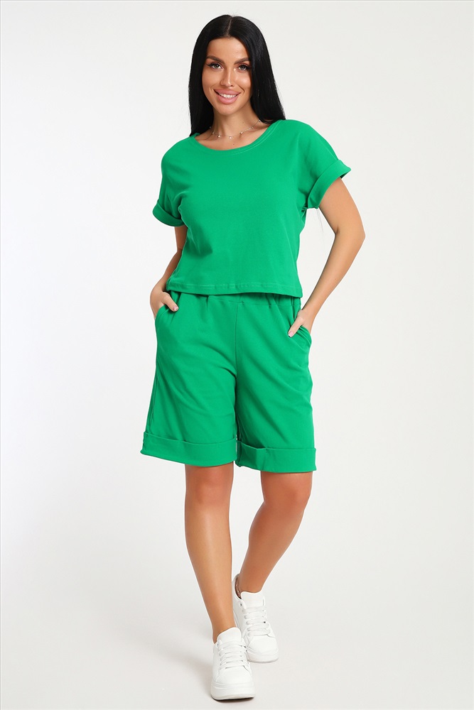 Застежка: без застежки Костюм с шортами бермудами прекрасный вариант для комфортного время препровождения летом на прогулке, на даче, на море. Укороченная футболка свободно садится по фигуре, визуально стройнит, в сочетании с удлиненными шортами создает стильный, романтичный образ. Шорты с глубокими карманами в боковых швах подойдут для активного образа жизни, занятий спортом. Костюм с шортами можно носить в качестве домашней одежды.