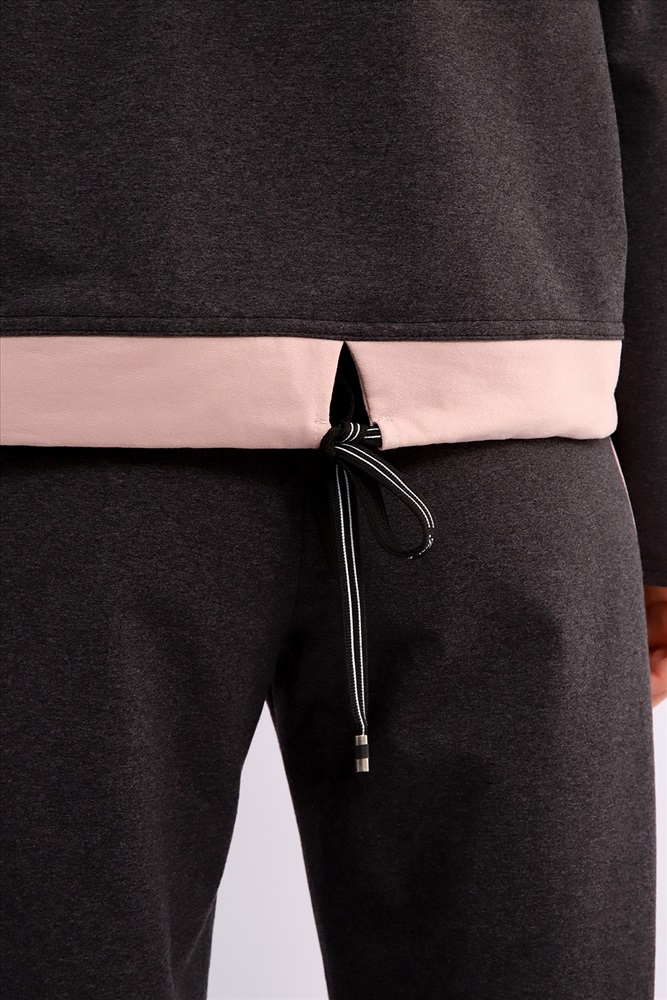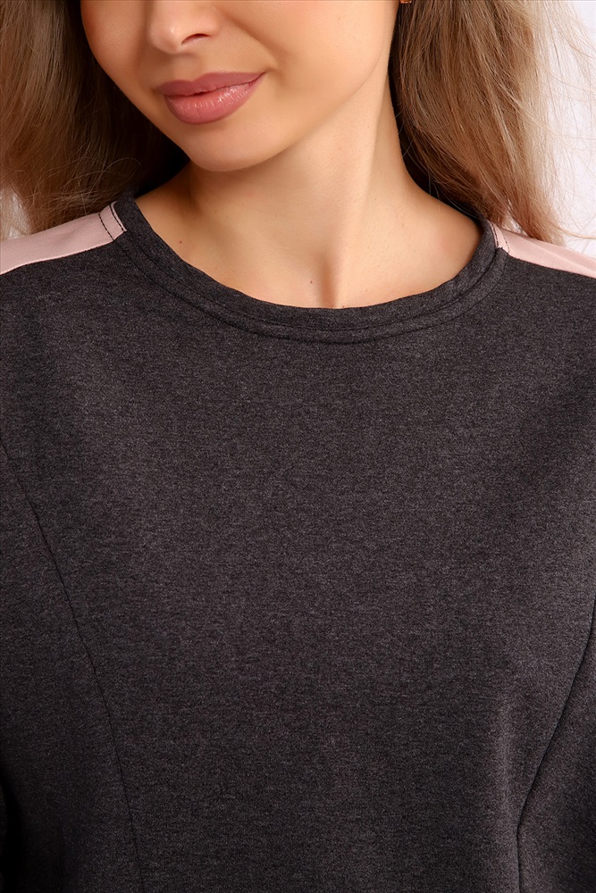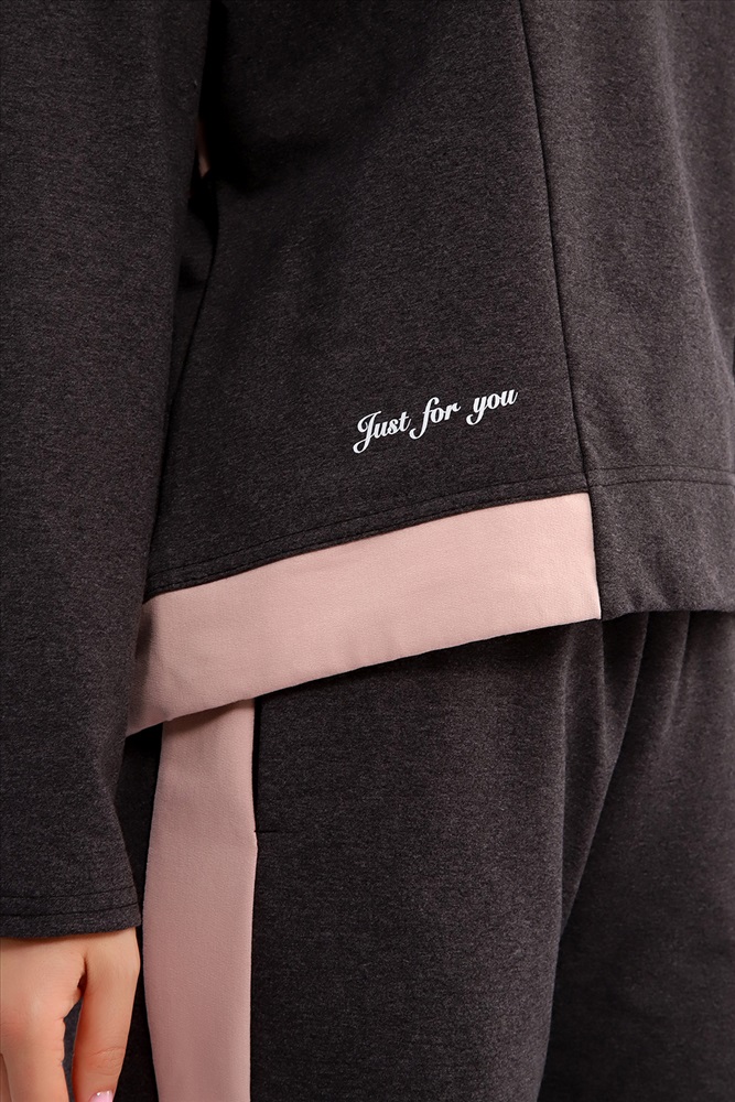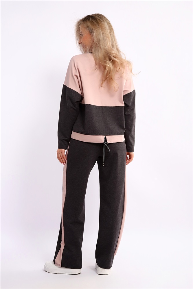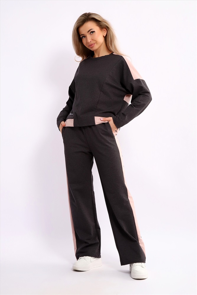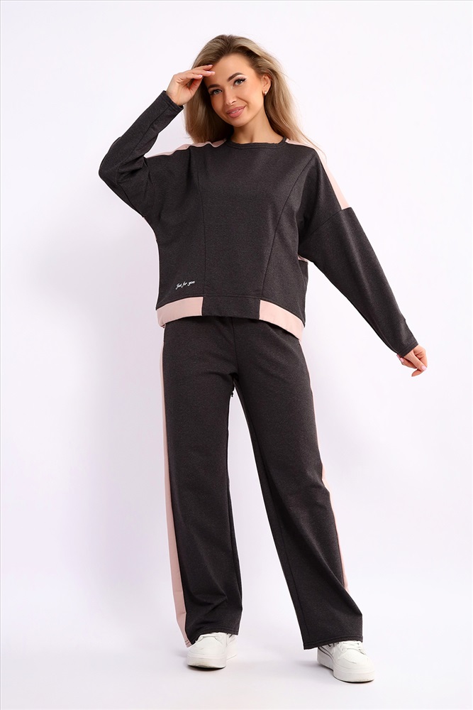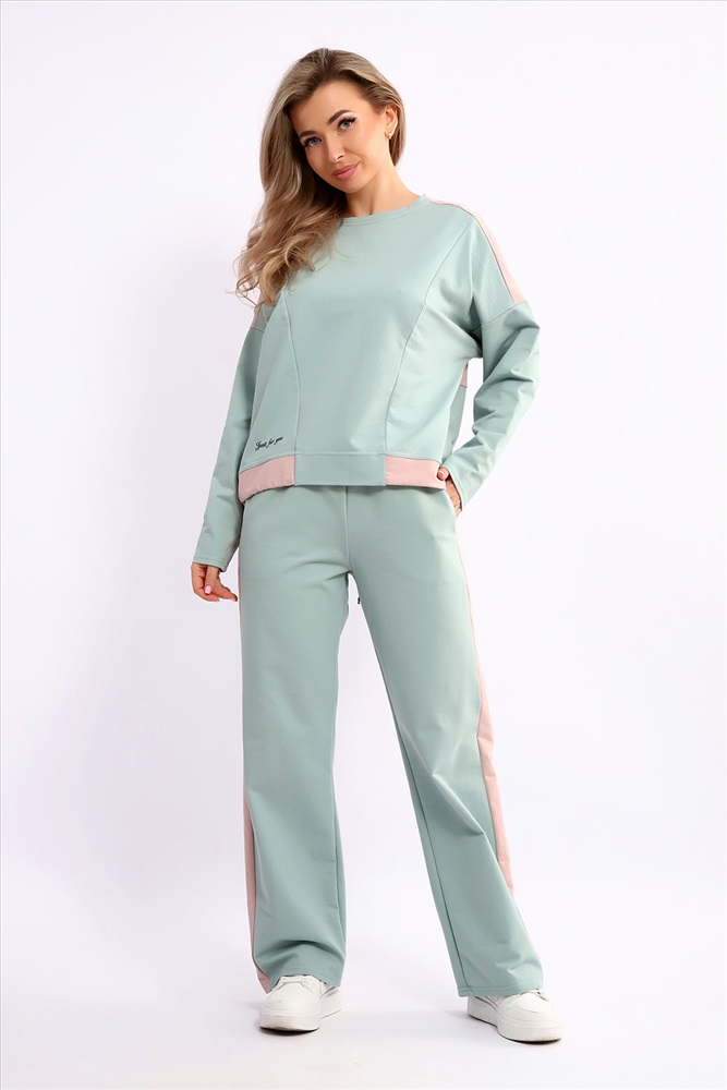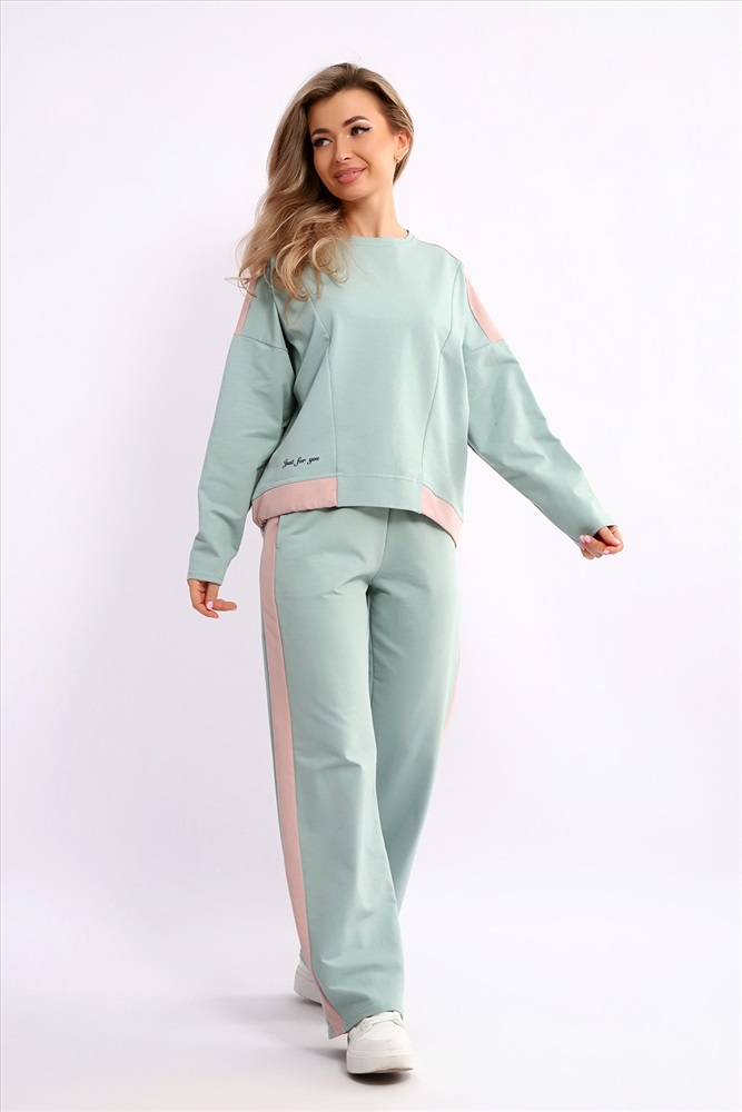 Застежка: без застежки Костюм женский из мягкого, тонкого комбинированного футера . Свитшот с рельефами, в свободном стиле Oversize. Круглая горловина обработана обтачкой, спущенная пройма, длинный рукав, с надписью на передней полочке. На спинке кокетка, низ на широком манжете с декоративным шнуром. Брюки- трубы с лампасами и удобными карманами в боковых швах. Стильный, комфортный костюм идеальный вариант для повседневного гардероба.