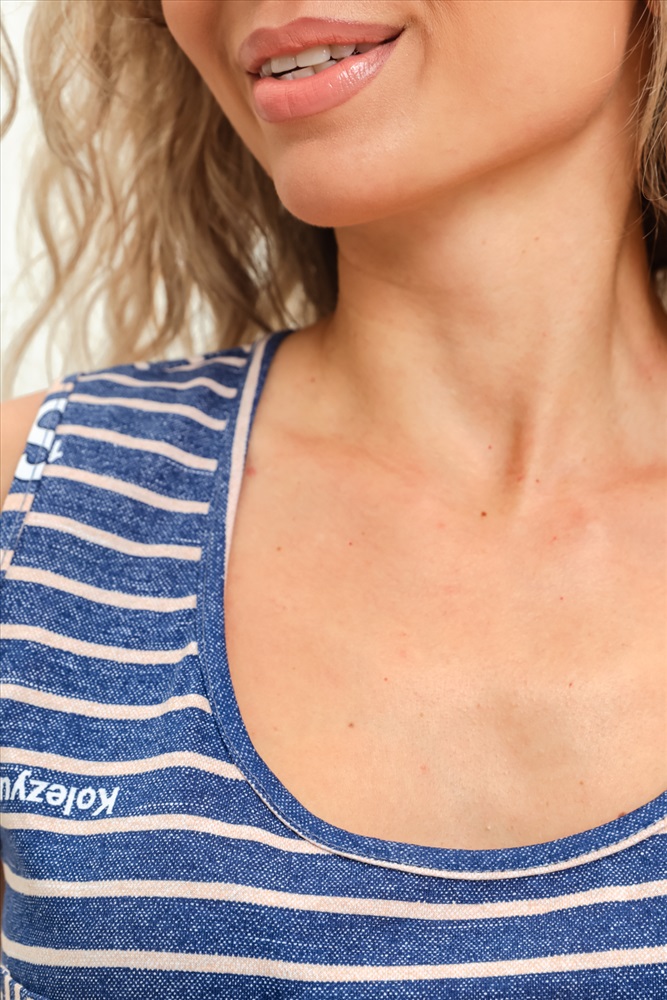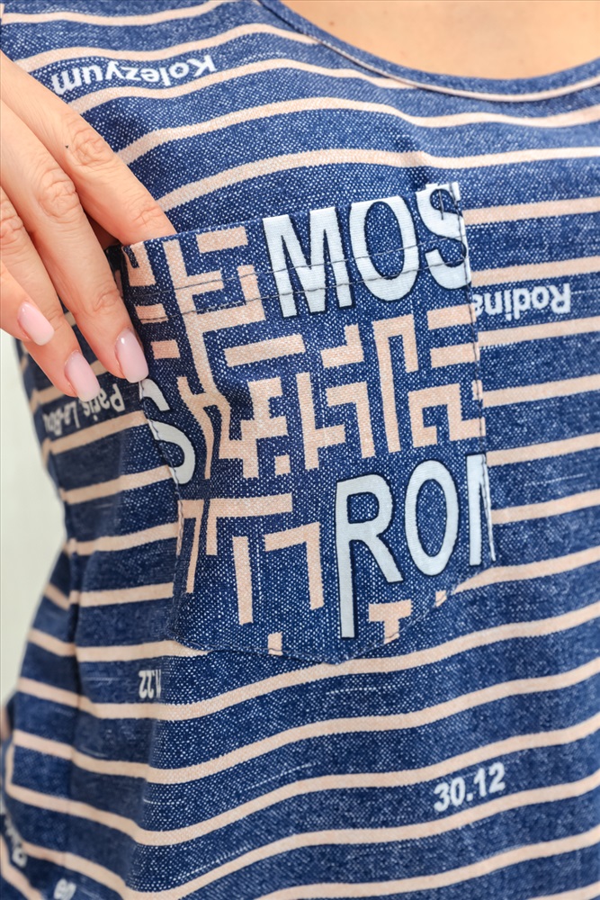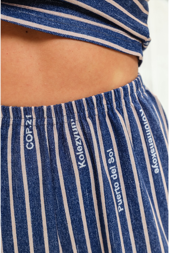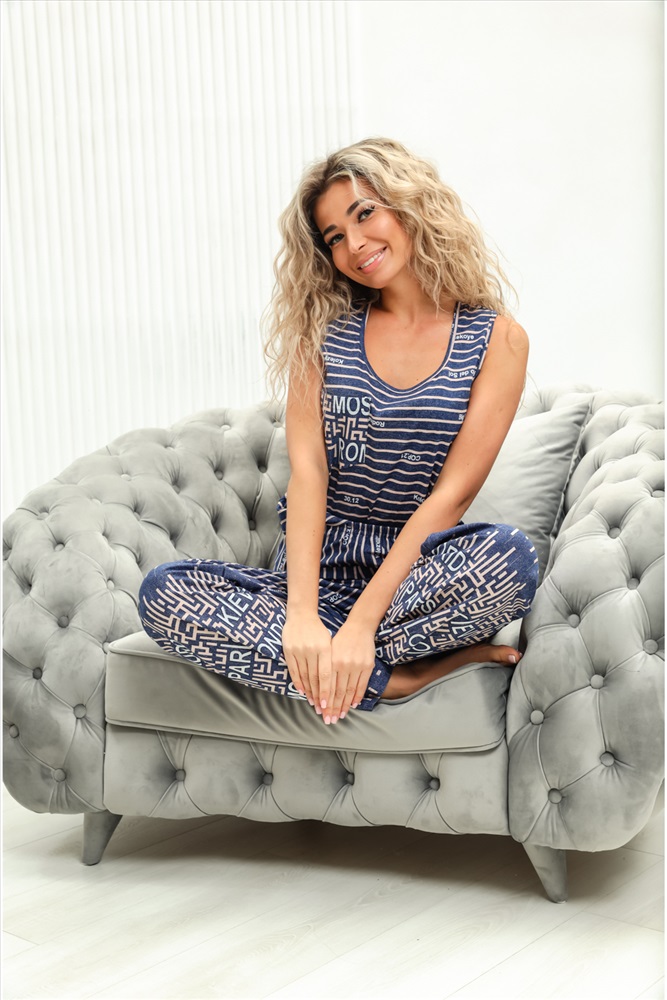 Застежка: без застежки Костюм состоит из майки и брюк. Майка на широких бретелях, с округлой горловиной, с карманом на полочке. Спинка с кокеткой. Горловина и проймы обработаны бейкой из основного полотна. Брюки прямые, на резинке, без боковых швов.