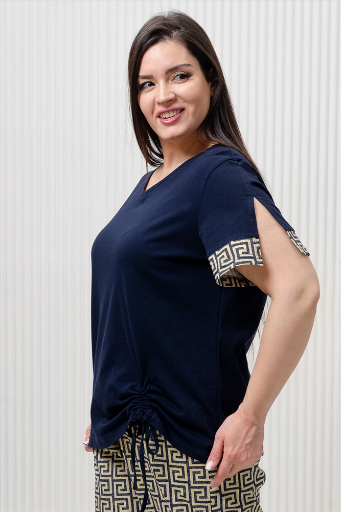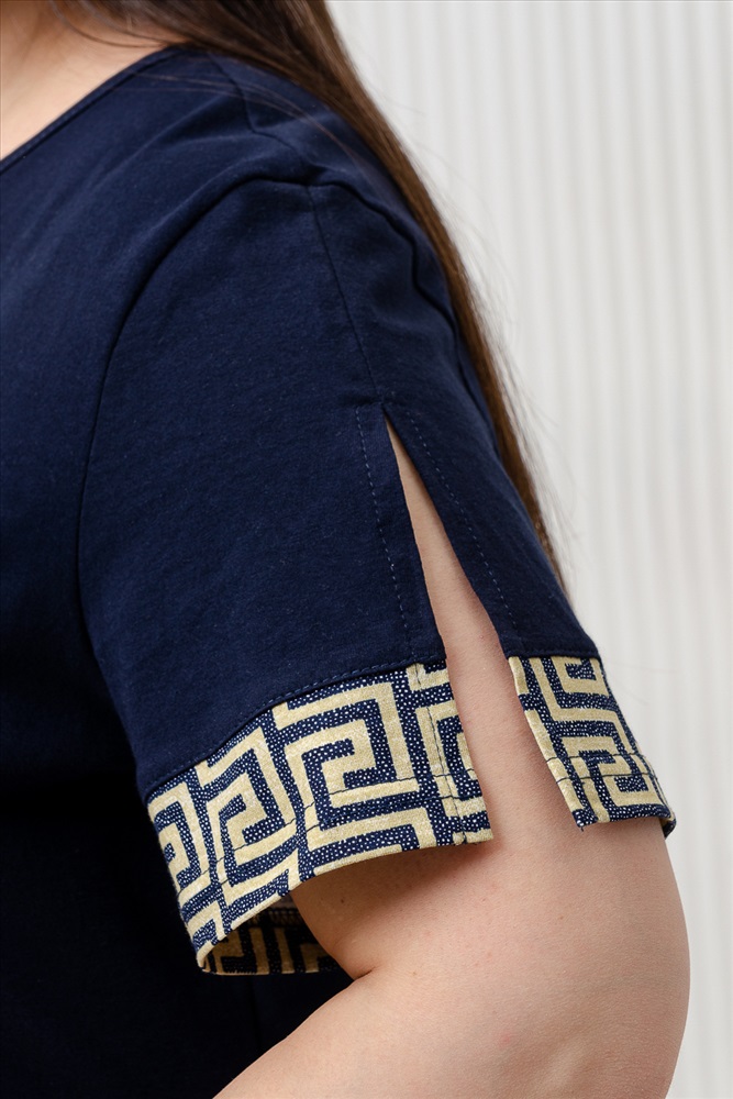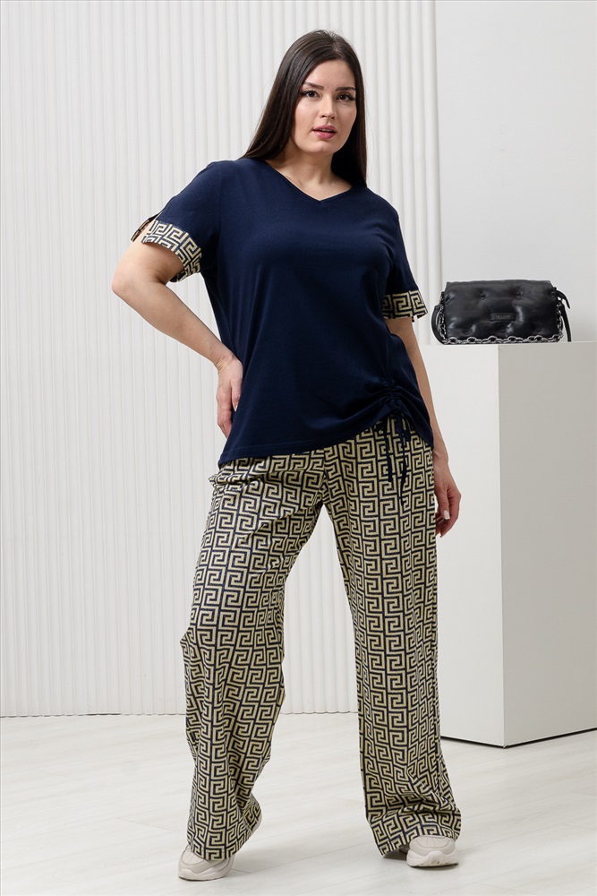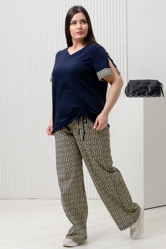 Застежка: без застежки Костюм состоит из туники и брюк. Туника прямого силуэта, с V-образной горловиной. Рукав втачной, короткий, с разрезами и манжетом из отделочного полотна. В нижней части полочки обработана кулиса со шнуром. Горловина обработана бейкой из основного полотна. Брюки прямые, свободные, на поясе, с боковыми карманами.