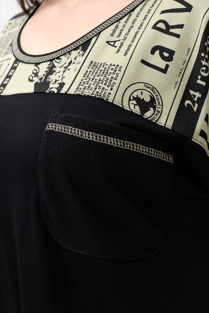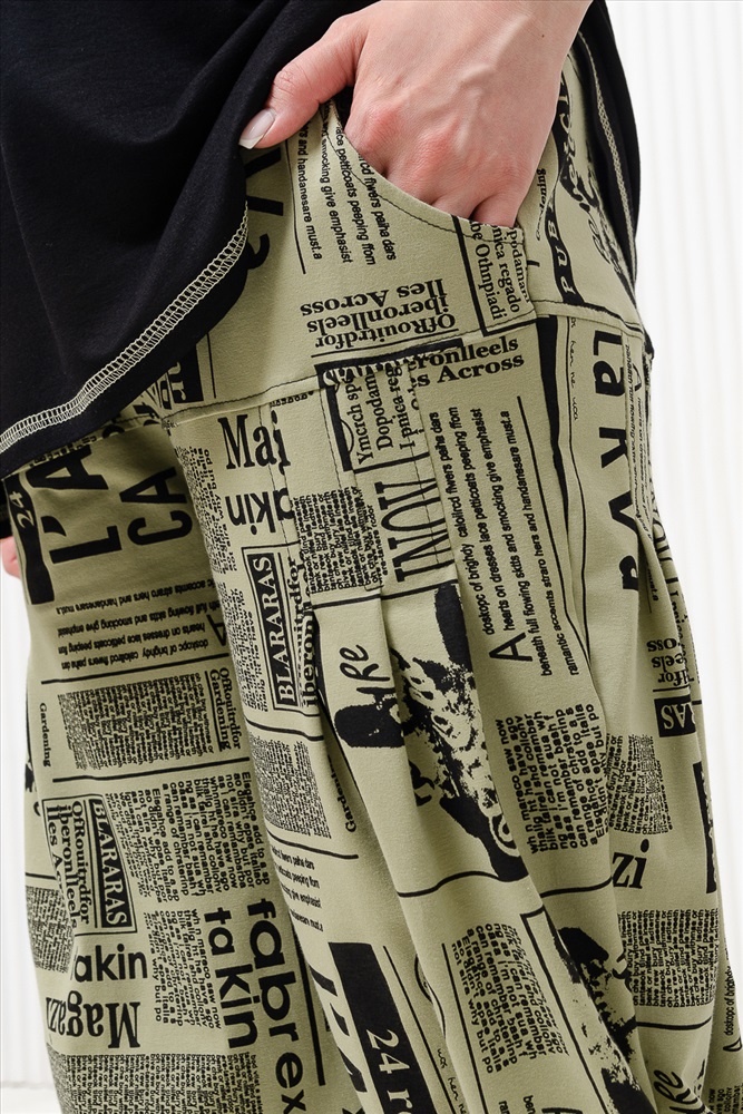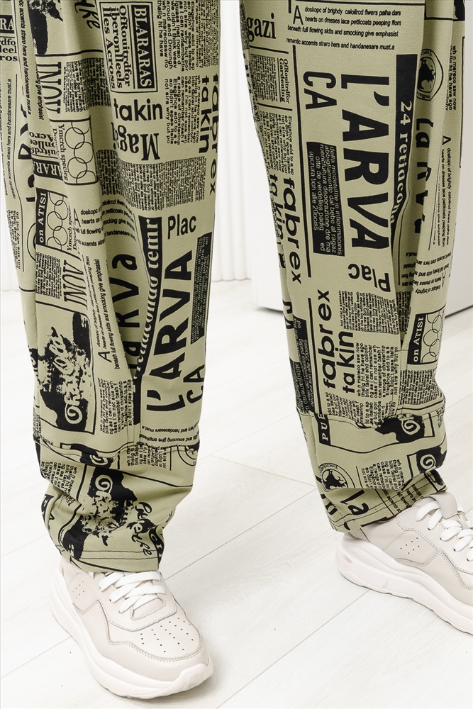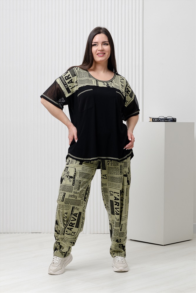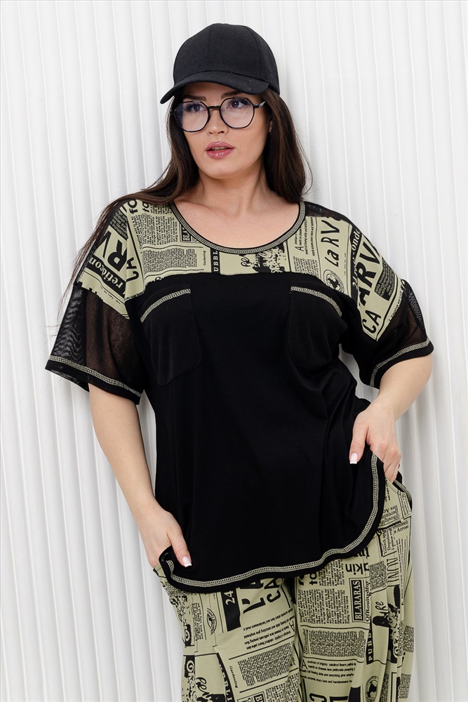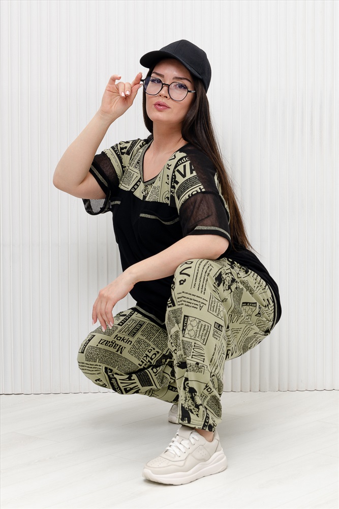 Застежка: без застежки Костюм женский. Туника и брюки. Туника состоит из трех частей: цельнокроеная кокетка полочки и спинки из хлопковой сетки, средняя часть из набивной кулирки, нижняя часть туники выполнена из дышащей вискозы. На полочке накладные нагрудные карманы из сетки. Брюки бананы. Передние и задние части брюк из трех частей. В верхней передней части брюк внутренние карманы. В средней части брюк по три вертикальные складки. Конструкция брюк позволяет скрыть любые недостатки в области бедер.