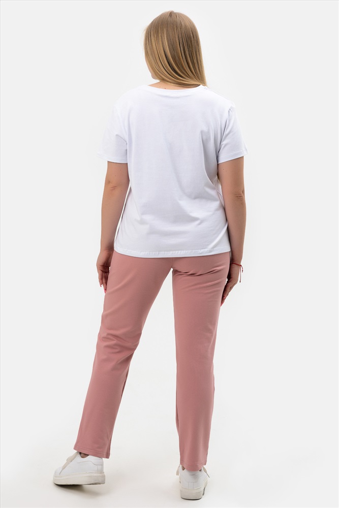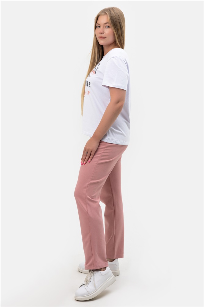Этот легкий летний трикотажный костюм идеально подходит для домашних повседневных занятий. Брючный комплект сочетает комфорт и стиль, удовлетворяя потребности женщин разных размеров, включая категорию больших. Он особенно удобен для невысоких женщин, беременных и для полных, благодаря свободному крою и оверсайз форме. Костюм выполнен из приятного на ощупь хлопка, что делает его отличным выбором для жаркой погоды. Материал позволяет коже дышать, создавая ощущение прохлады даже в самый знойный день лета. Вы можете комфортно носить этот комплект дома или выйти в нём на прогулку на море. Легкость ткани придаёт дополнительное удобство во время долгого ношения. Брюки имеют эластичную талию, что улучшает посадку и обеспечивает свободу движений. Комплект включает штаны и футболку с коротким рукавом, что добавляет образу свежесть и не стесняет движений рук. Благодаря такому дизайну модель прекрасно сочетается с любой домашней одеждой. Комплект двойка включает в себя футболку с принтом и прямые брюки. Для многих женщин выбор одежды играет важную роль не только для выхода, но и дома. Трикотажная основа костюма нежно соприкасается с кожей, позволяя чувствовать себя уютно каждый день. Такой вариант особенно подходит дамам большого размера. Отдельного упоминания заслуживает свободный крой костюма. Этот элемент дизайна подчеркивает женственные линии тела, не причиняя дискомфорта и не ограничивая движения.