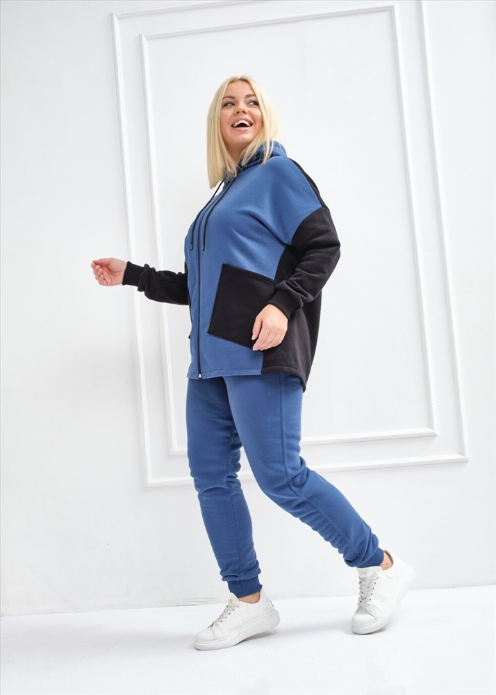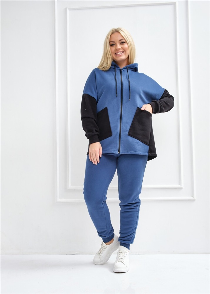Костюм женский с начесом состоит из толстовки и брюк. Толстовка с капюшоном, на молнии, прямого силуэта, с длинным спущенным рукавом из контрасной ткани. На полочке толстовки настрочены накладные карманы из контрасной ткани. Брюки на поясе, заужены к низу, на манжете.