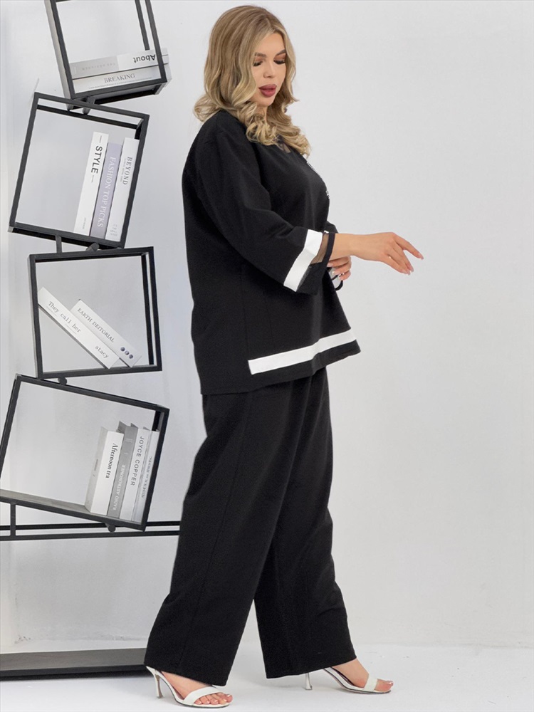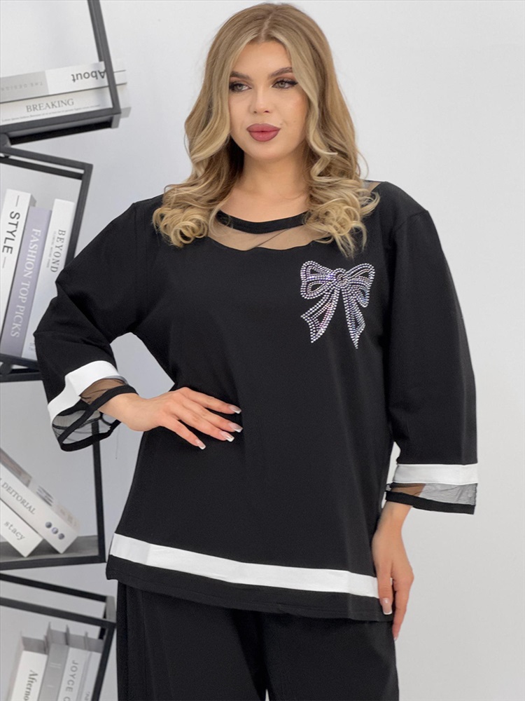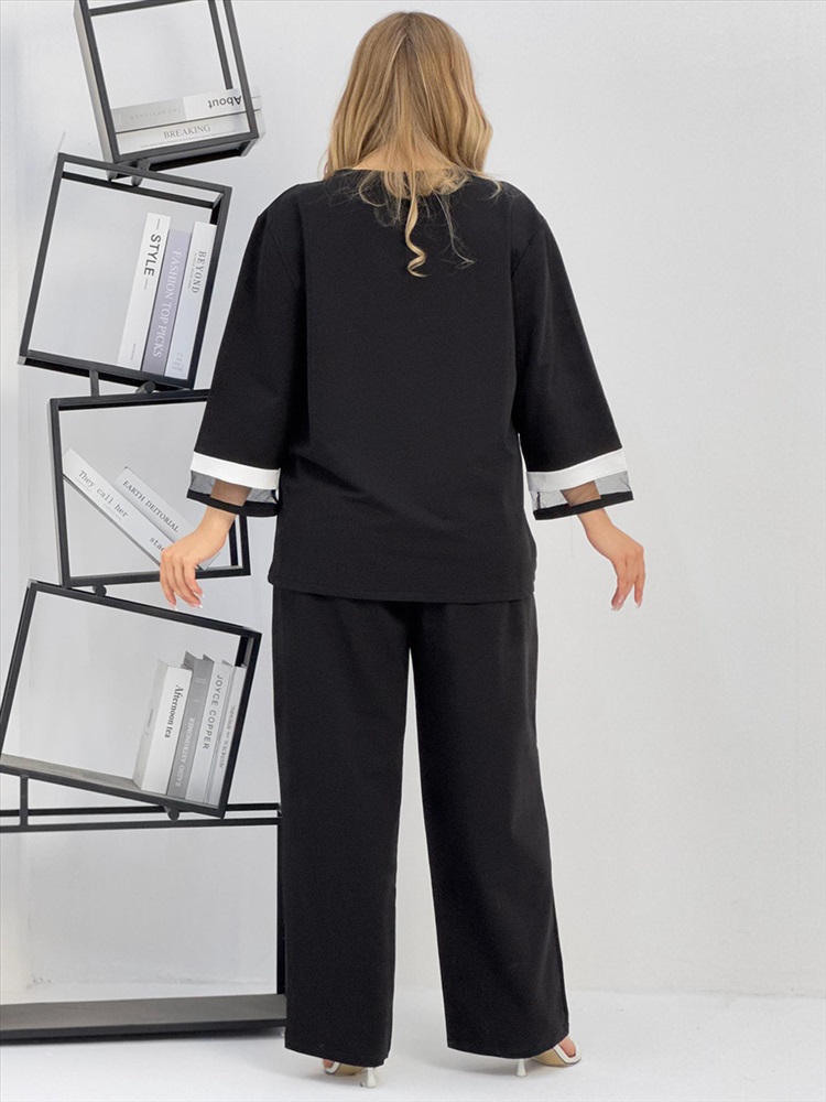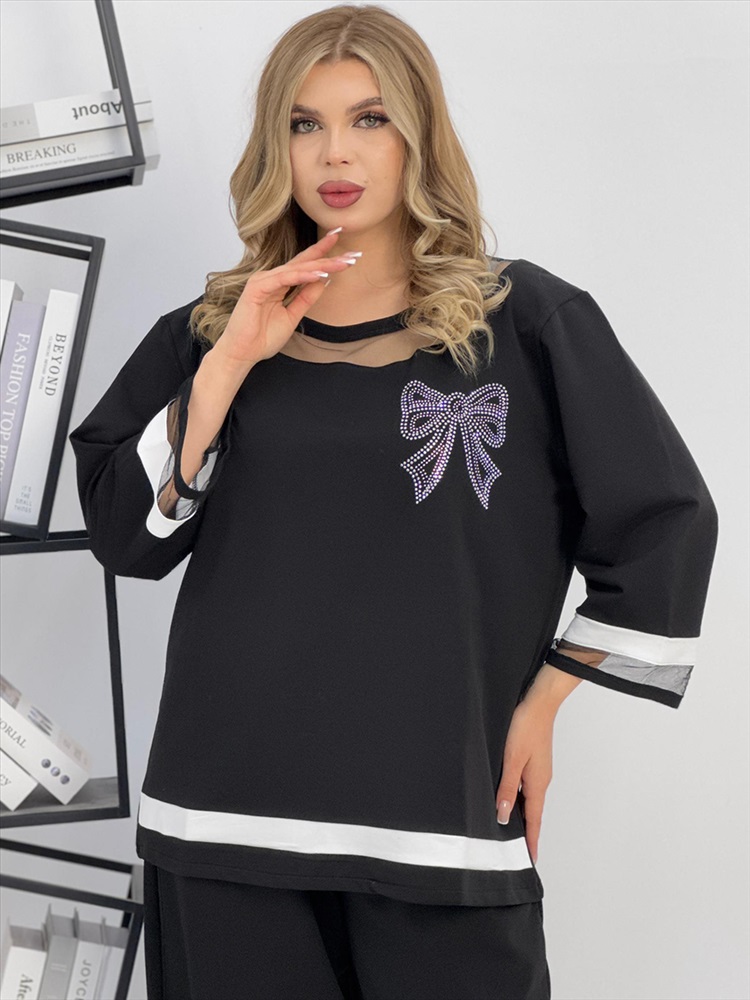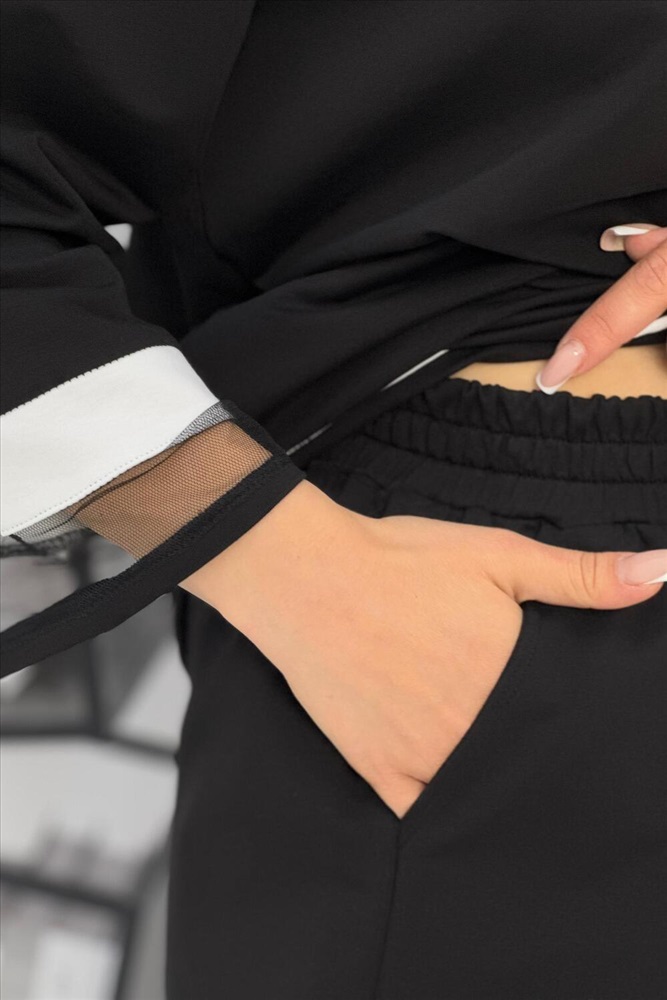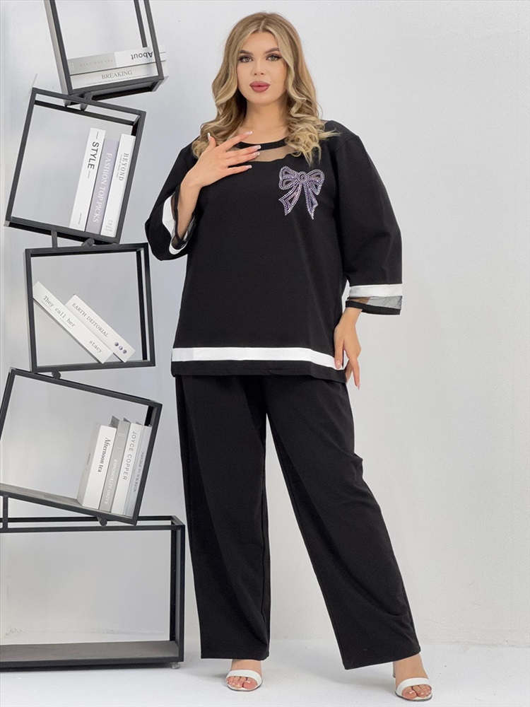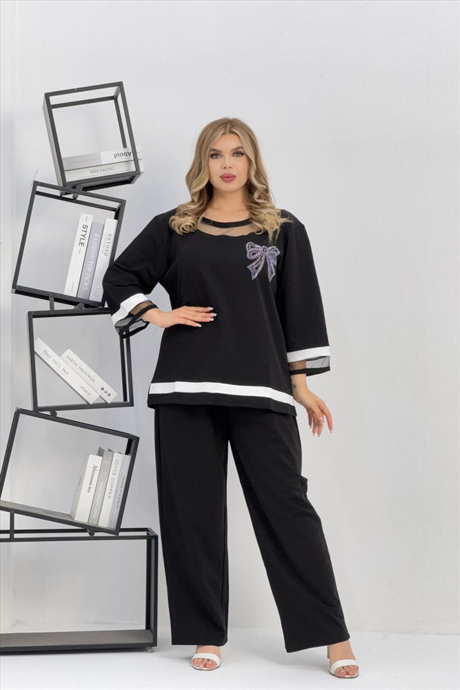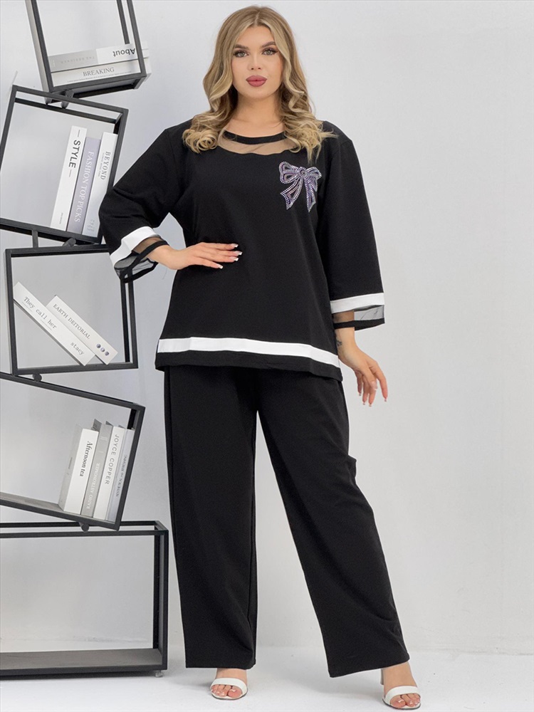 Застежка: без застежки Женский брючный костюм из супрем отличается оригинальным дизайном. Костюм состоит из блузки и свободных брюк. Блузка имеет круглый вырез с сетчатой вставкой, рукава 3 четверти с белой полосой и сетчатой вставкой на манжетах, которые придают наряду легкость и изящество. На груди блузки прикреплен блестящий бант. Брюки черные, свободного кроя на резинке и с карманами. Этот костюм сочетает в себе стиль и комфорт, что делает его отличным выбором для разных случаев.