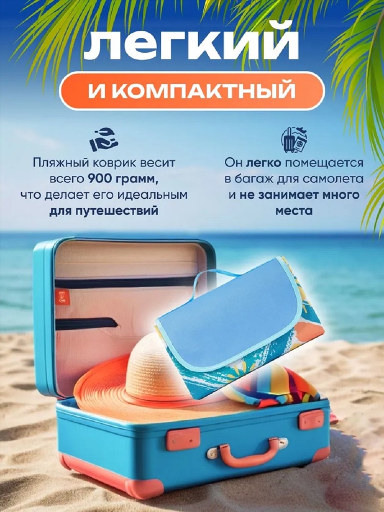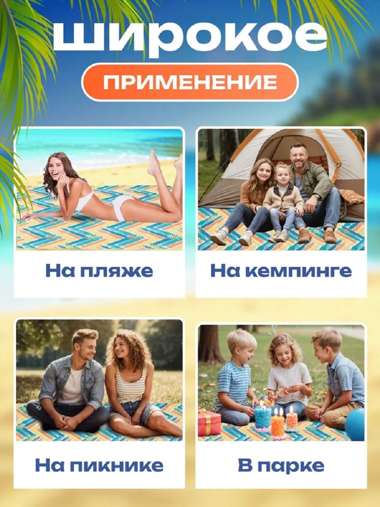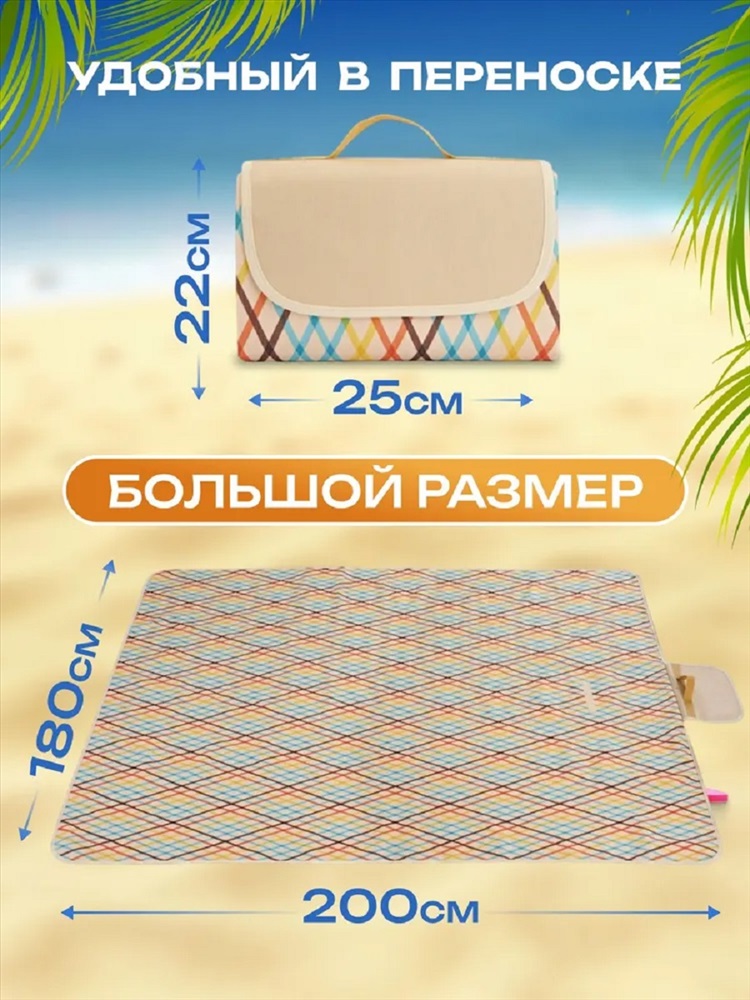 Рисунок: клетка | разное Коврик пляжный туристический - незаменимый аксессуар для комфортного отдыха на природе. Покрывало позволит комфортно расположиться небольшой семье или компании друзей. Непромокаемая подкладка позволит сидеть на пледе не боясь испачкаться, промокнуть или замёрзнуть. Верхний слой водонепроницаемого пледа выполнен из неприхотливого полиэстера, отлично поддающегося стирке. В сложенном виде непромокаемый плед для пикника представляет собой компактную симпатичную сумочку, застегивающуюся на липучку. И его можно нести в руке, а можно кинуть в рюкзак, в машину или даже в корзинку с едой - он не занимает много места. Он идеально подходит для использования на пляже или у моря, так как его подкладка защитит вас от холодного песка или травы. Также подходит для использования как утепленная подстилка для пикника. В целом, пляжный коврик является универсальным и удобным аксессуаром для отдыха на природе. Его также можно использовать в качестве подложки для палатки или спального мешка во время кемпинга или похода на природу.