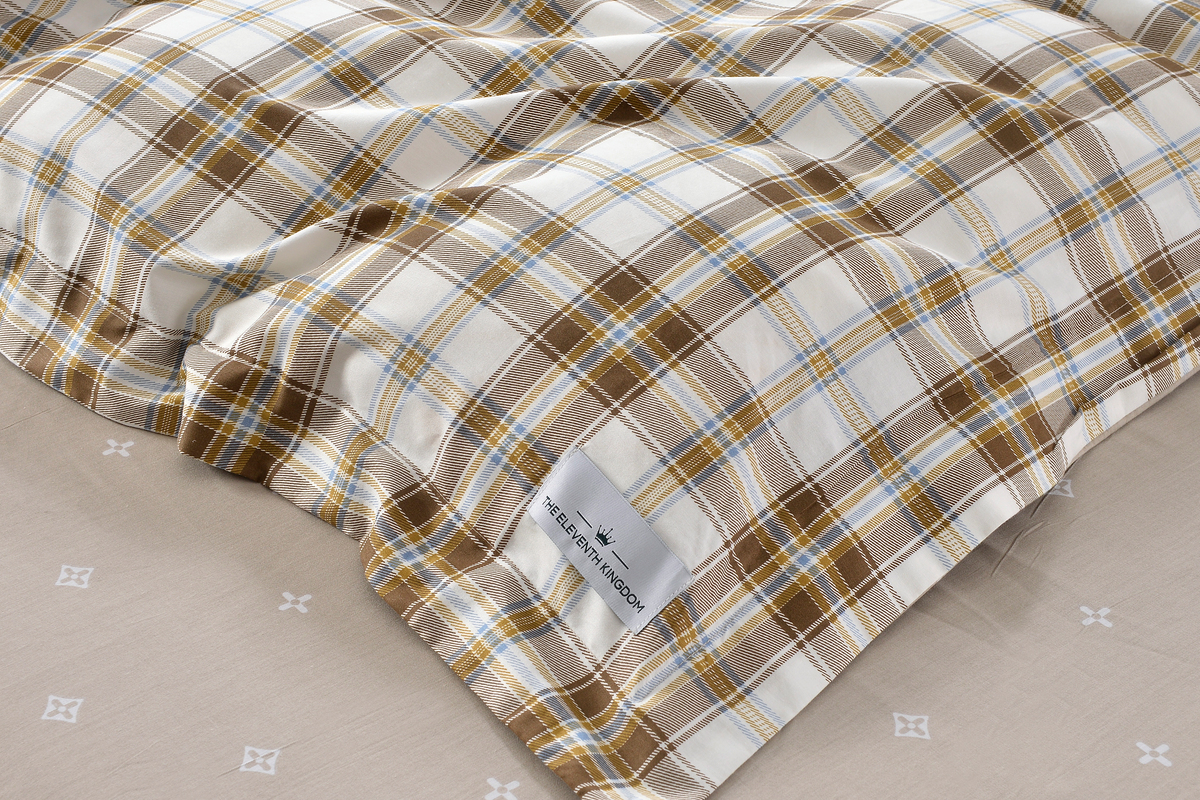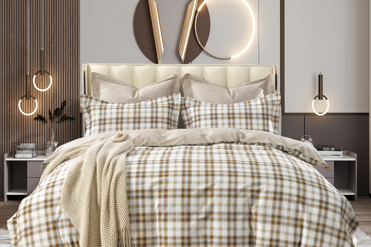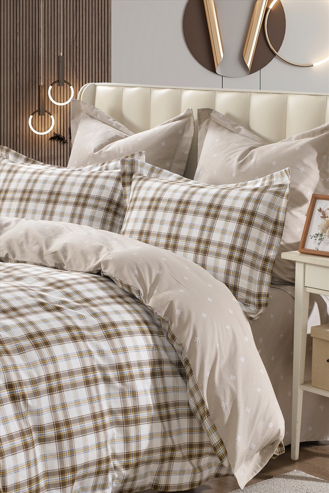Застежка: молния Комплект выполнен из сатина натуральной, тактильно приятной и очень прочной ткани. Гладкие туго скрученные нити плотно прилегают друг к другу, обеспечивая красивый дорогой блеск и высокую износостойкость сатинового полотна. Даже после многочисленных стирок комплект сохранит свой первозданный вид, мягкость и гладкую текстуру. Благодаря тому, что комплект Aurora изготовлен из 100% хлопка, спать на нем комфортно в любую погоду. Натуральная ткань обладает отличной воздухопроницаемостью, гигроскопична, экологична и гипоаллергенна. Кроме того, сатин это излюбленный материал дизайнеров, он никогда не выходит из моды и способен преобразить любой интерьер. Сдержанная классическая клетка в бежевых тонах придаст статусный, изысканный вид Вашей спальне, добавит тепла и уюта утреннему пробуждению. Модель: Брендированная молния на наволочках и пододеяльнике. Пододеяльник декорирован ушками 8см, наволочки декорированы ушками 5 см Упаковка: подарочная картонная коробка и пакет РАЗМЕРЫ: простынь 230*260 пододеяльник 200*220 наволочки 50-70 - 2 шт, 70*70 - 2 шт