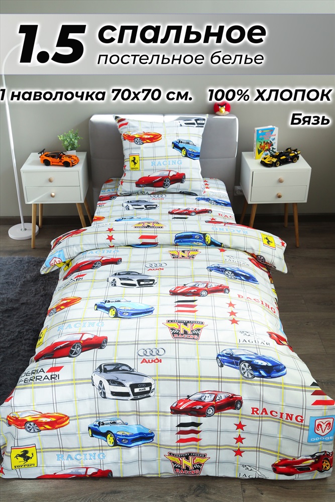 Сезонность: лето | осень | весна | зима Постельное белье Тест-драйв с рисунком автомобилей на сером клетчатом фоне из ткани бязь на 1.5 спальную кровать. Натуральная ткань плотности 125 гр/м2, состав 100% хлопок абсолютно экологичен, не вызывает аллергии, хорошо пропускает воздух, позволяя телу дышать. При правильном уходе постельное белье прослужит вам долгое время. Предварительная стирка обязательна. Перед стиркой вывернуть изделие на изнаночную сторону. Стирать отдельно от синтетических изделий. Машинная стирка при максимальной температуре 40С, мягкий режим. Стирать моющими средствами для цветных тканей. Не отбеливать. Гладить с изнаночной стороны при максимальной температуре утюга. Усадка после стирки до 3%, от заявленных размеров изделия. Ткань не подвержена образованию катышков. Наволочка 70х70 см. - 1 шт (застежка клапан) пододеяльник 145х217 см. - 1 шт (застежка прорезь) простыня 150х220 см. - 1 шт (без резинки)