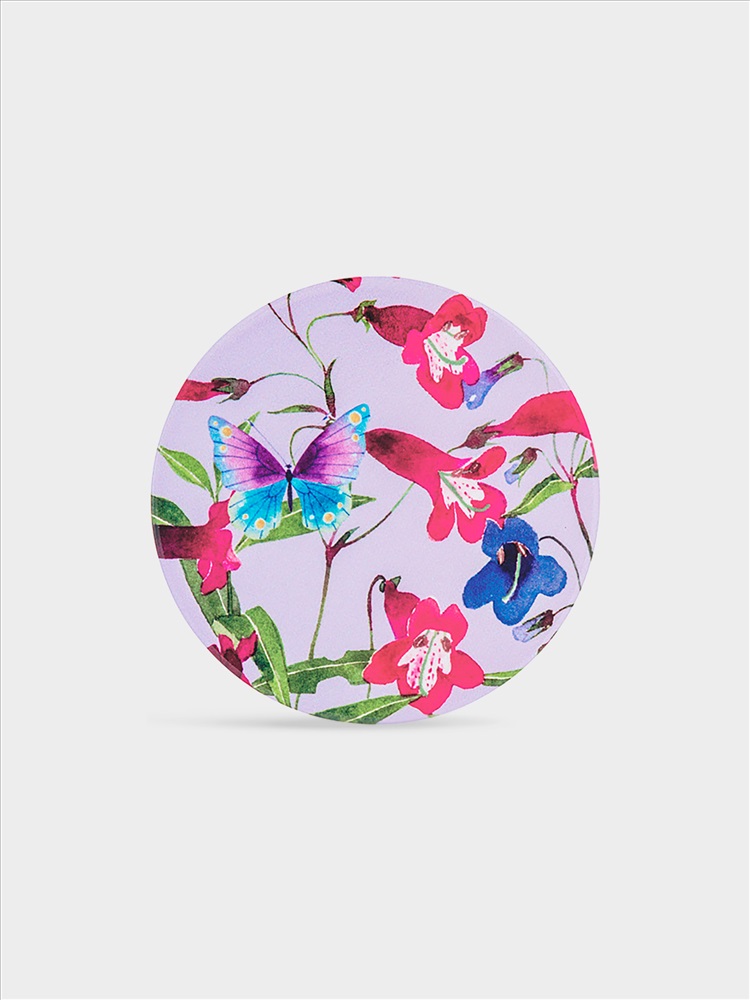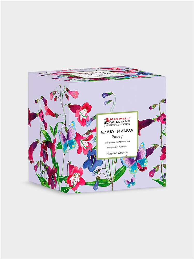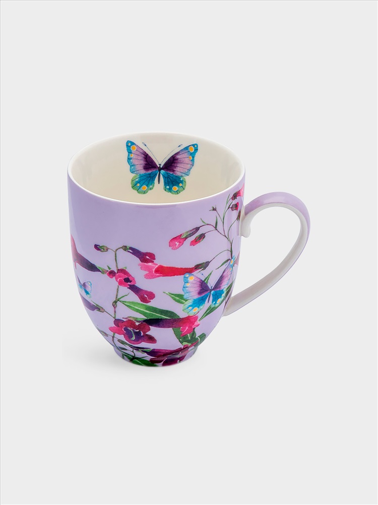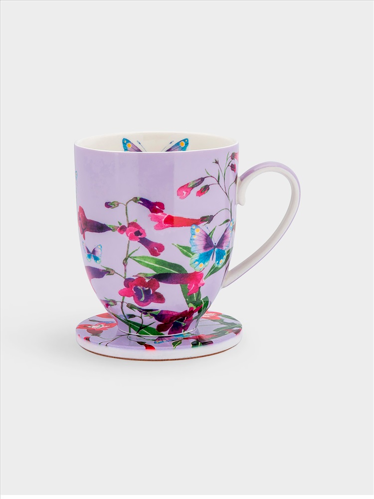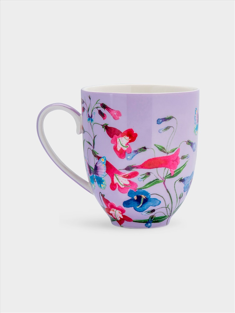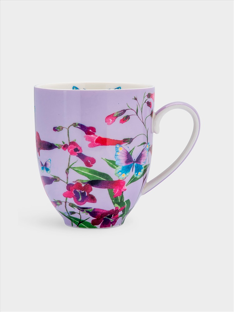 Кружка, 400 мл, на подставке, фарфор P, лиловая, Пенстемоны и бабочки, Posey. Материал: фарфор Рorcelain. Мыть тёплой водой с применением ЖМС. Можно использовать в СВЧ и мыть в посудомоечной машине.