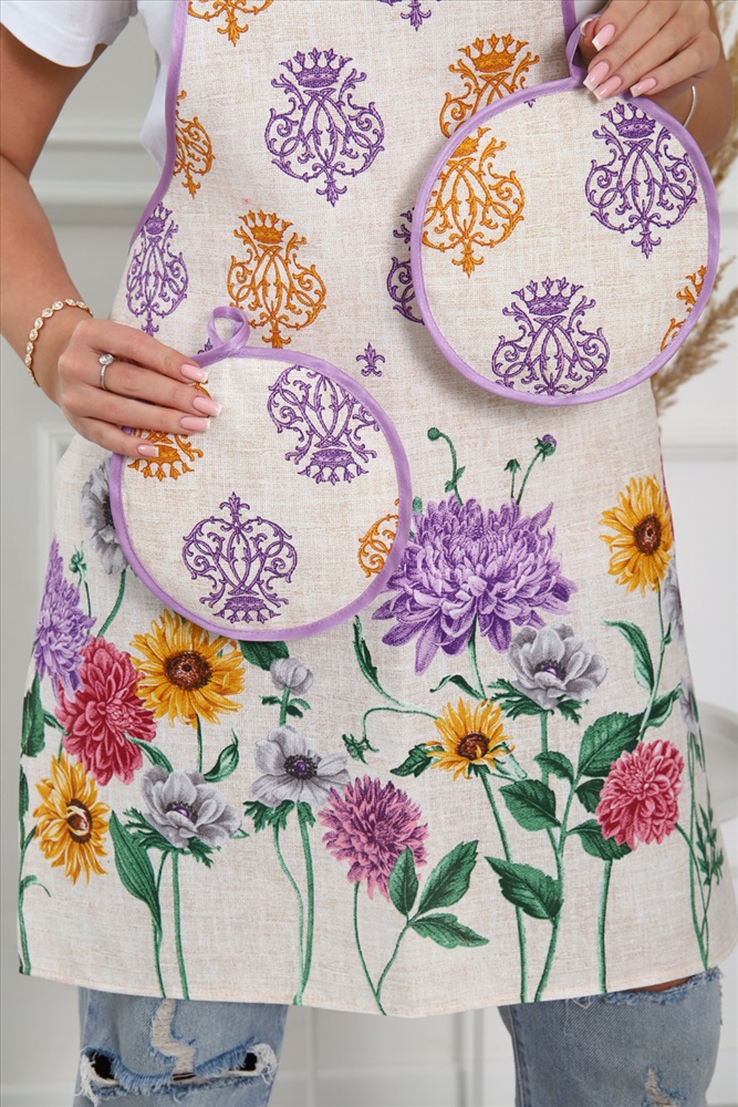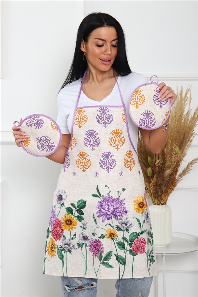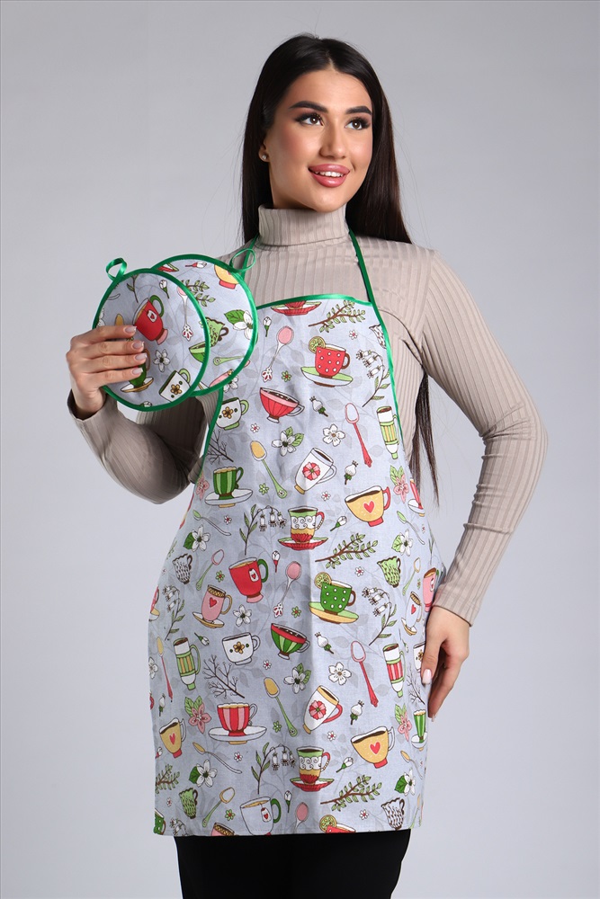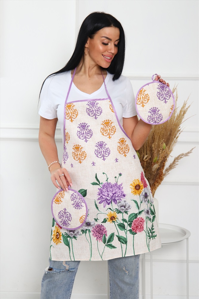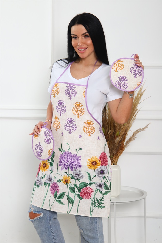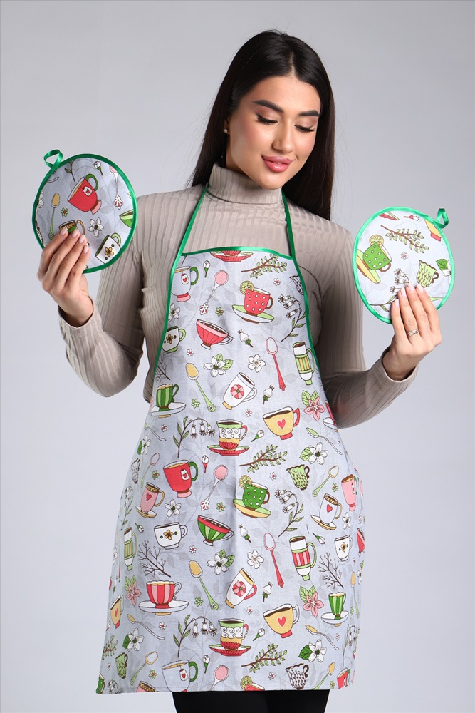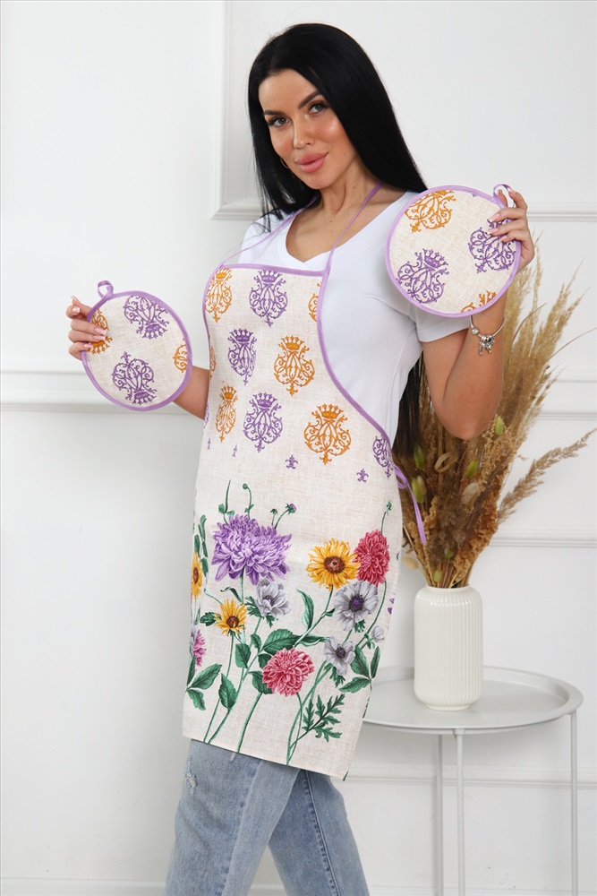 Сезонность: лето | осень | весна | зима Кухонный набор включает в себя самые необходимые предметы на кухне - фартук и две прихватки, изготовлен из прочного хлопчатобумажного полотна - рогожка. Яркие насыщенные цвета не потускнеют после множества стирок. Фартук длиной 70 см и шириной 60 см, диаметр прихватки 19 см.